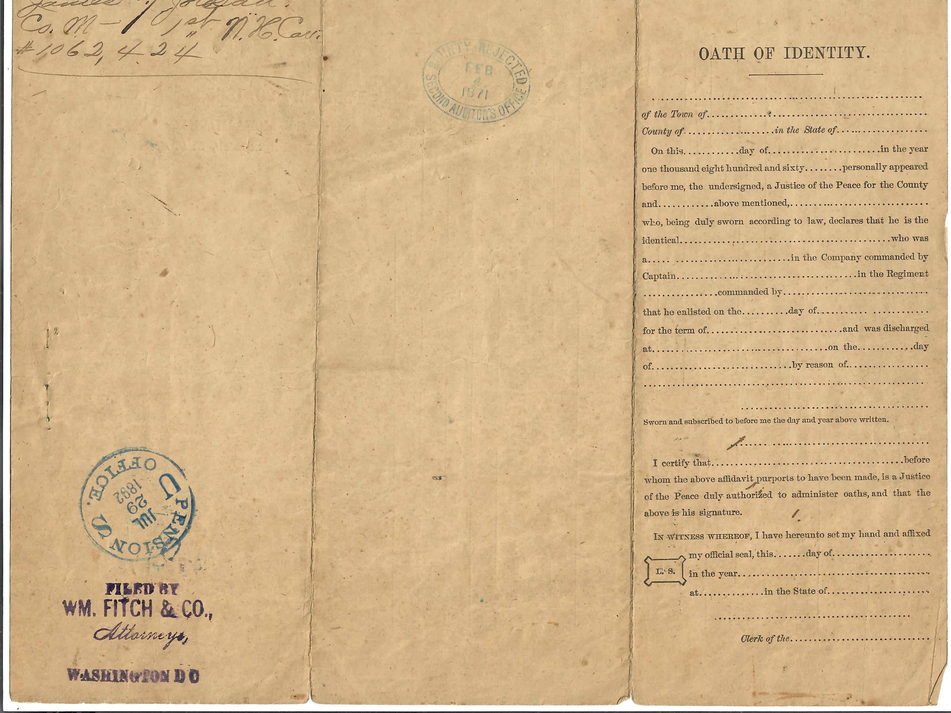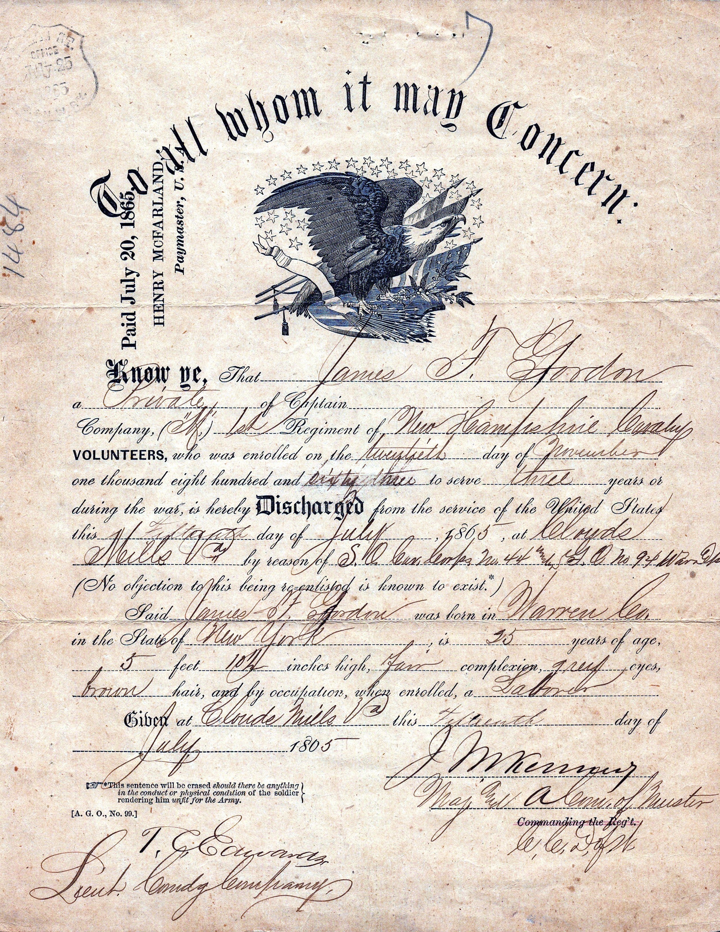 From what we can tell from the documents, James F Gordon was born in Warren County in the State of New York during about 1840, and he was discharged from service on July 15, 1865, when he was 25 years of age. There is unfortunately no information regarding when he enlisted, but the 1st New Hampshire Cavalry did take some time to reach full strength for deployment, as companies were often split off to join other Regiments. The regiment was active January 7, 1864, to July 1865, towards the end of the war, and took part in the following major battles: