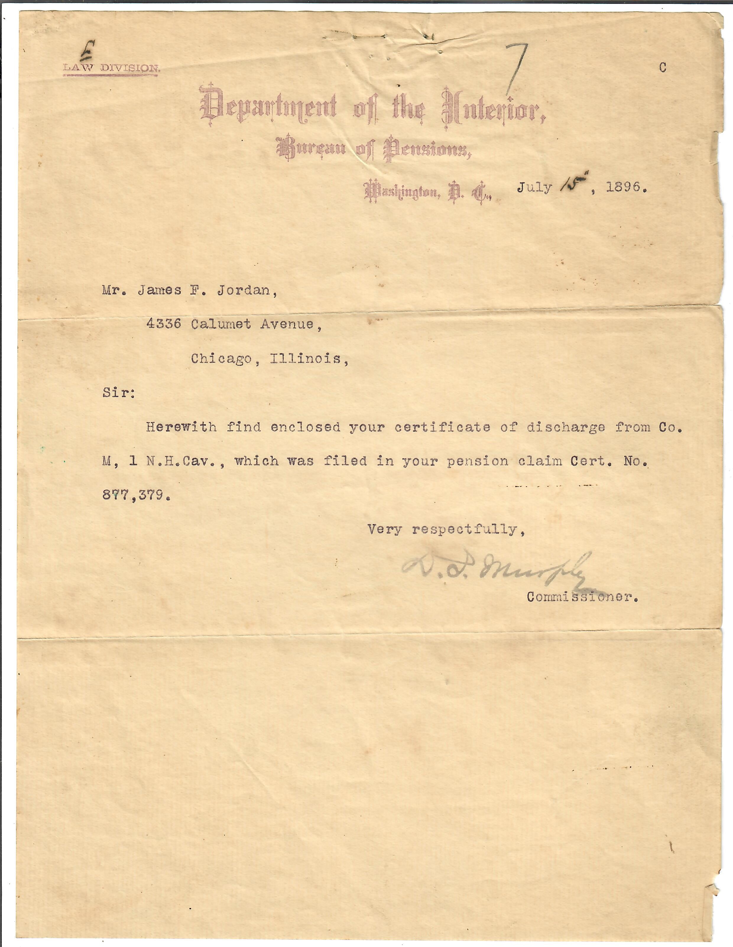 Original item: Only One Available. Here we have a lovely grouping attributed to U.S. Civil War soldier James F. Gordon, who was a member of Company M, 1st New Hampshire Cavalry during the war. The items included in this set include a photograph from decades after the war, his 1865 dated discharge papers, Pension papers, what look to be some tax documents, and even a worn fringed ribbon from a regimental reunion long after the war!