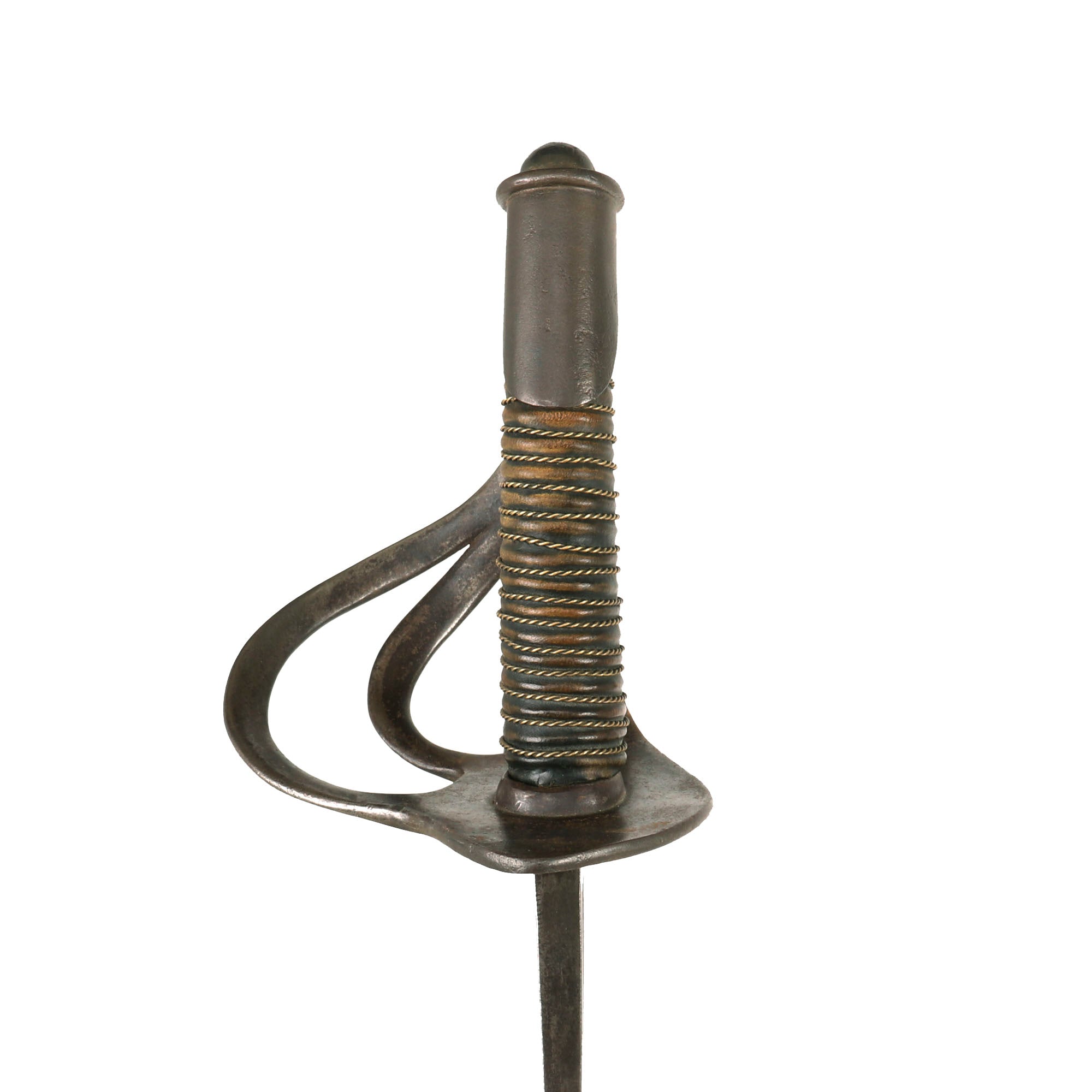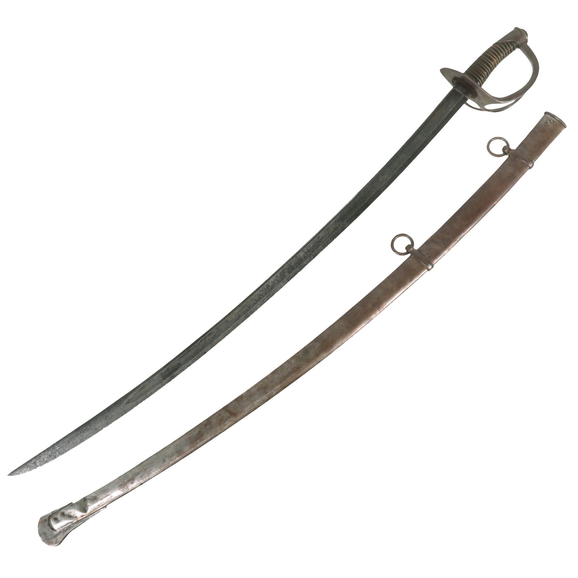 The Model 1840 Cavalry Saber was based on the 1822 French hussar's sabre. Unlike its replacement, the Model 1860 Light Cavalry Saber, the M1840 has a ridge around its quillon, a leather grip wrapped in wire (rather than grooves cut into the wooden handle) and a flat, slotted throat. It is 44" long with a 35" blade and weighs roughly 2.5 lbs.