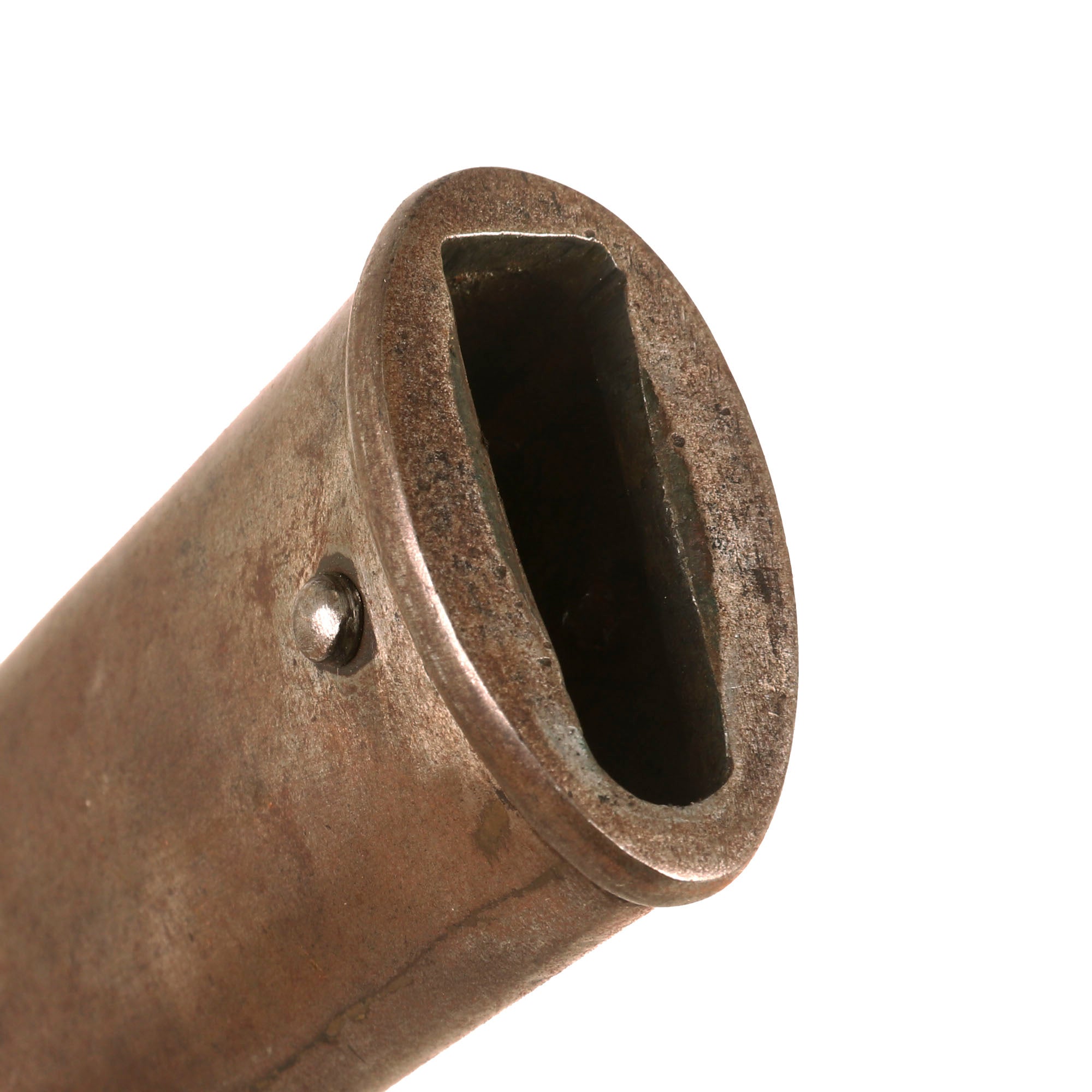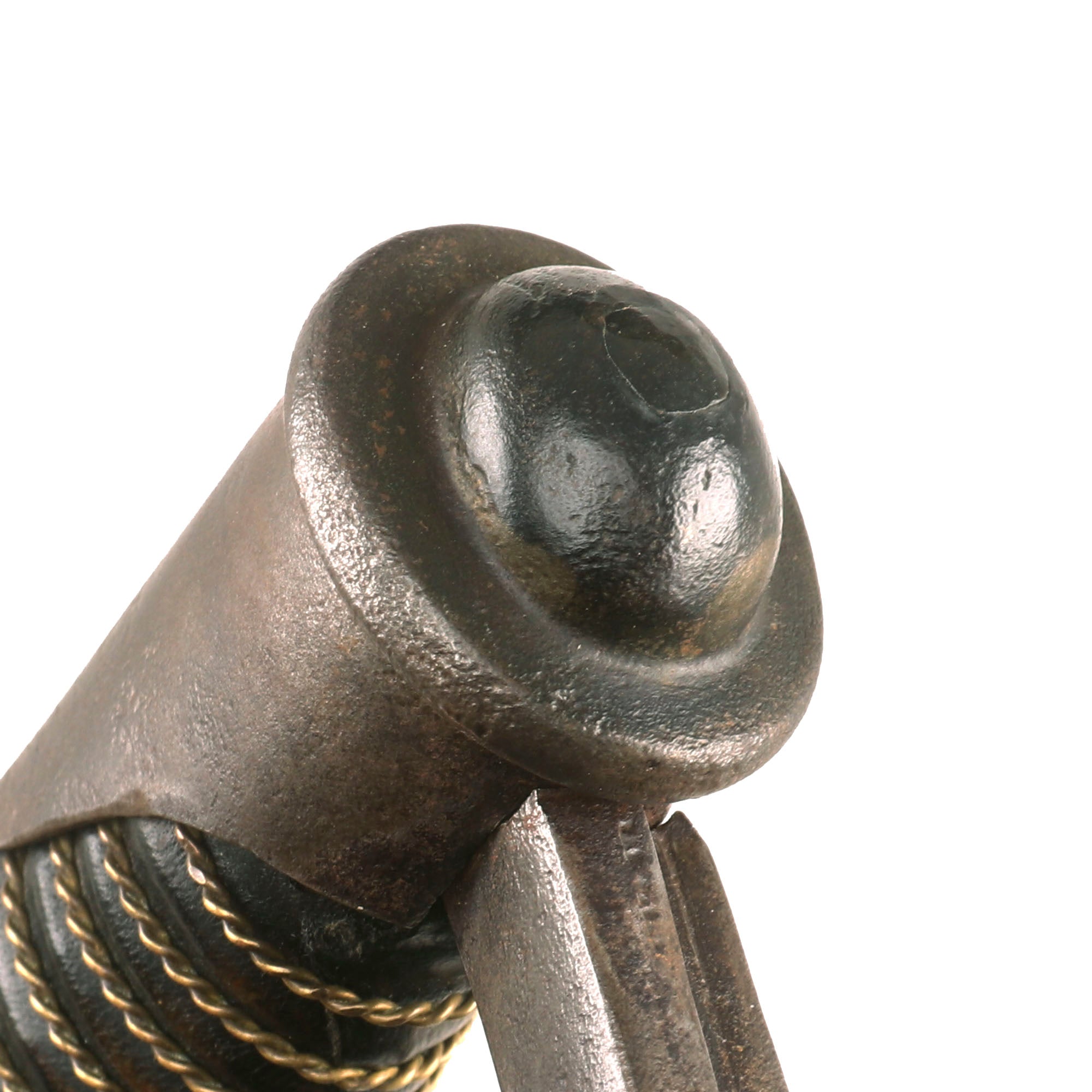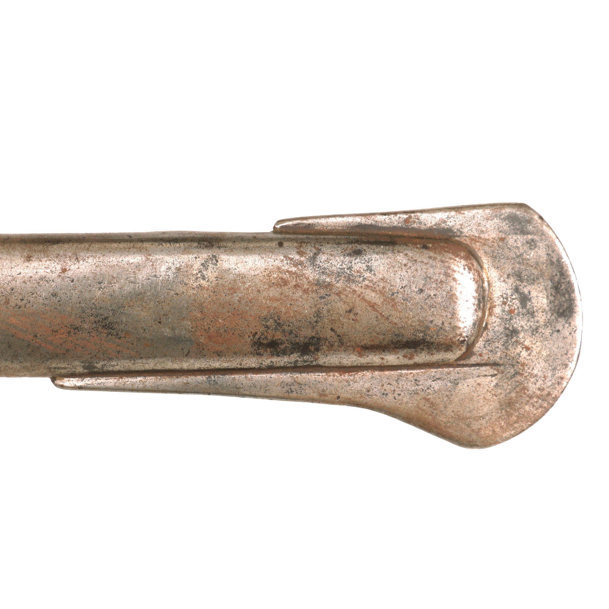 The scabbard is in very good condition, showing a lovely lightly oxidized patina, with some areas still displaying the original bright steel. We can see no evidence of major cleaning or restoration, and it has just a bit of bending and dents consistent with service. It fits the blade well, and still retains both hanger rings, and the throat.