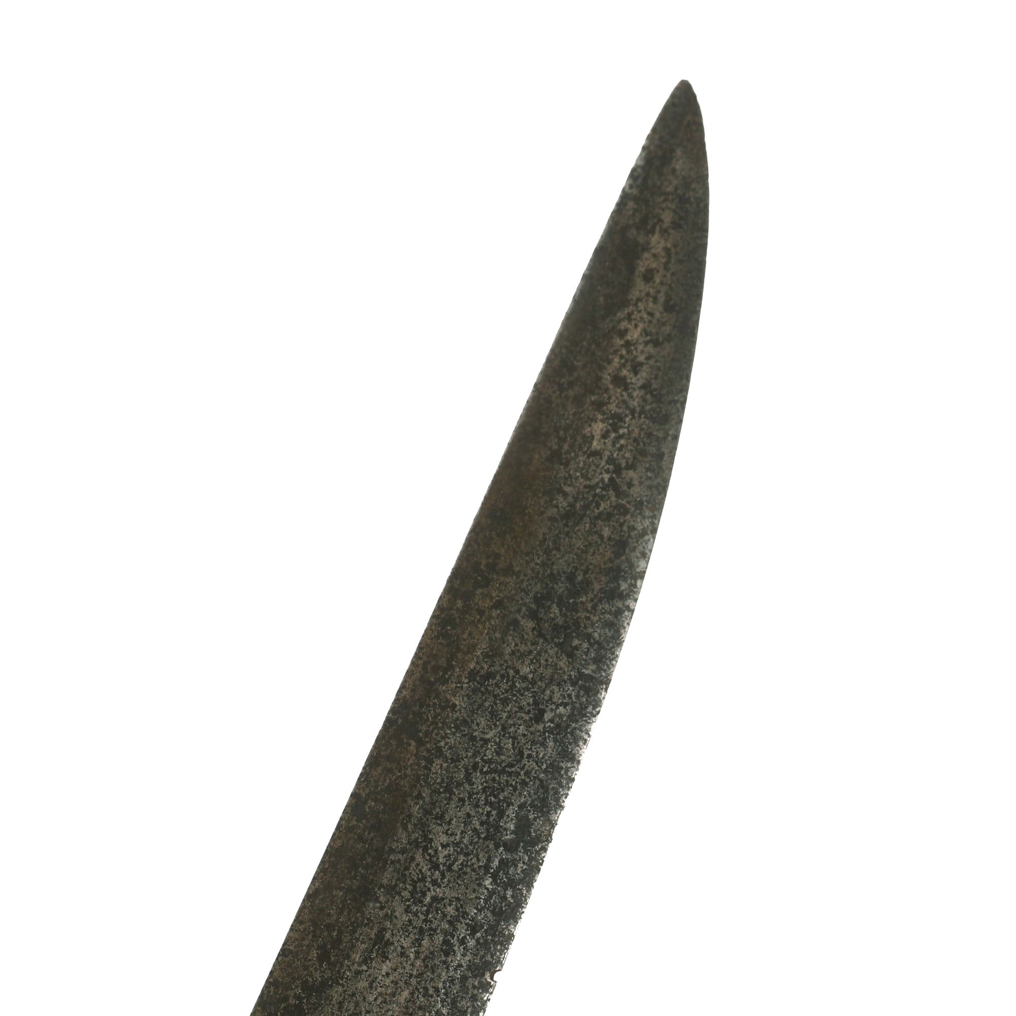This actually is a very nice sword, with a lovely oxidized patina that does not look to have been overly cleaned or buffed as they so often were. The edge bears numerous small chips and dents consistent with actual use in service, making this a fantastic example that was "really there"! The hilt is tight on the blade, with no wobble, and the original leather blade buffer is fully intact.