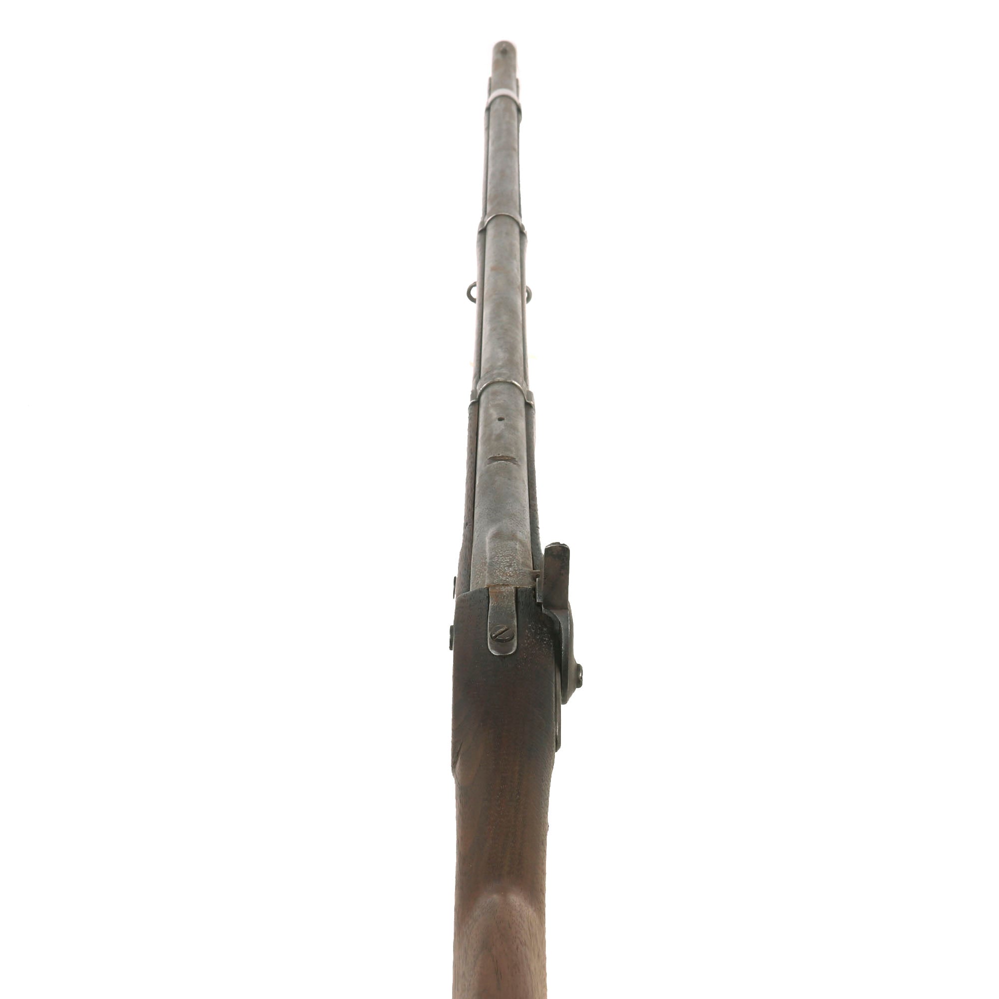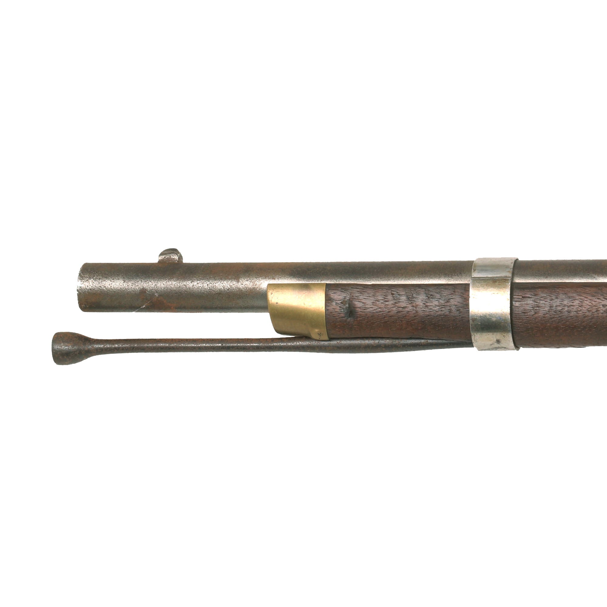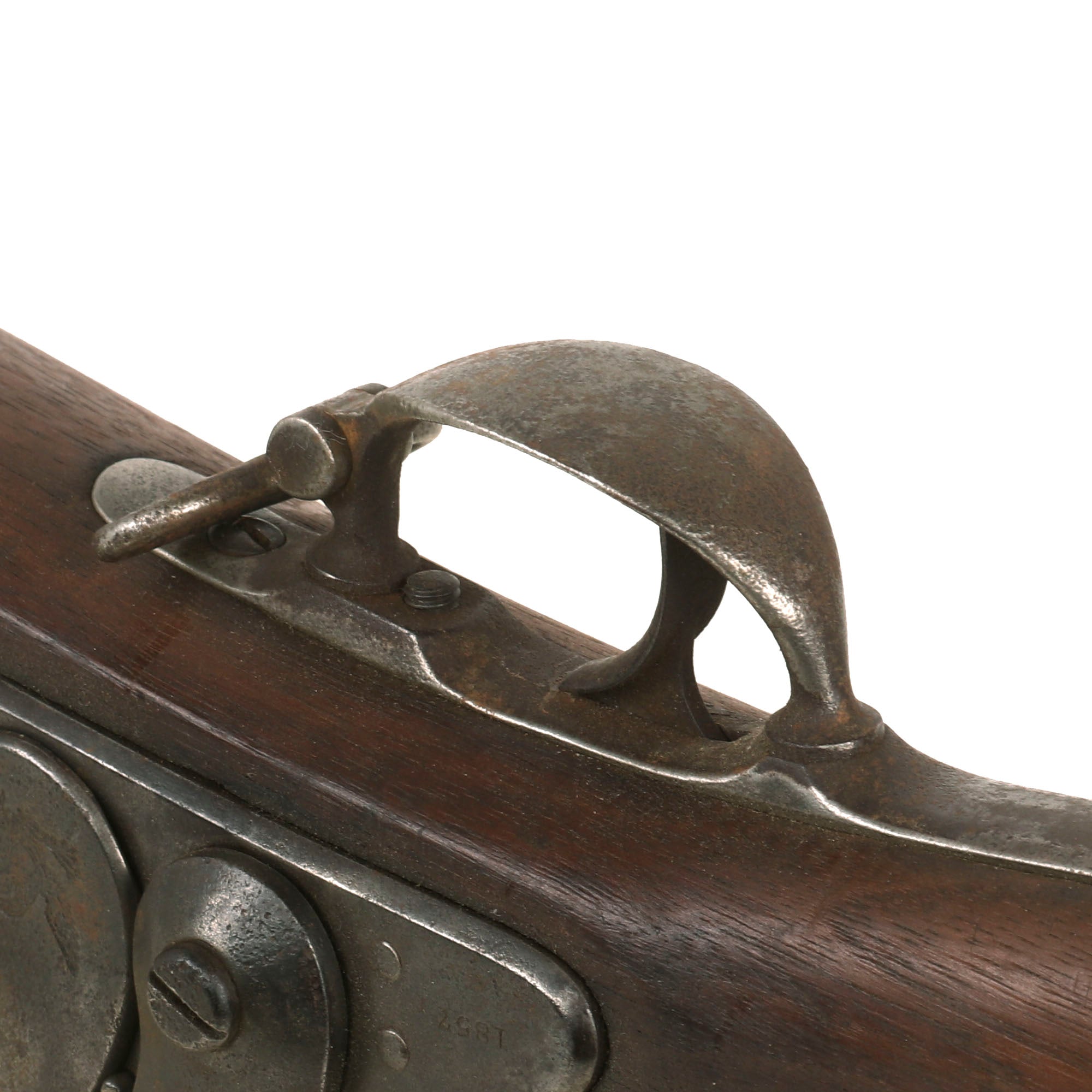 Bore is shot out with very little reminisce of rifling remaining. A long-range rear sight and blade/bayonet lug front sight remain in place but the rear sight is missing. The original, steel, swelled-shank, tulip-head ramrod retains its threaded tip. Two rear barrel bands are original and secured to the stock via flat iron springs. Front barrle band is a replacement. Butt plate is stamped “US”.