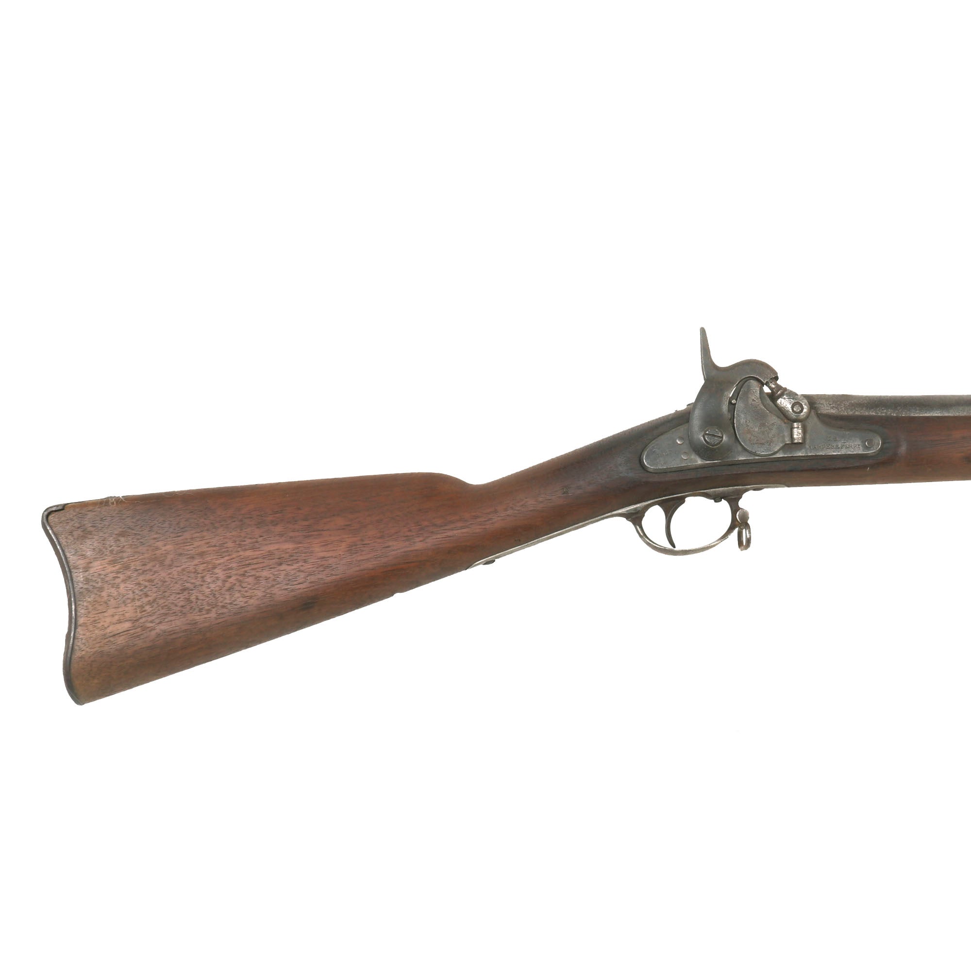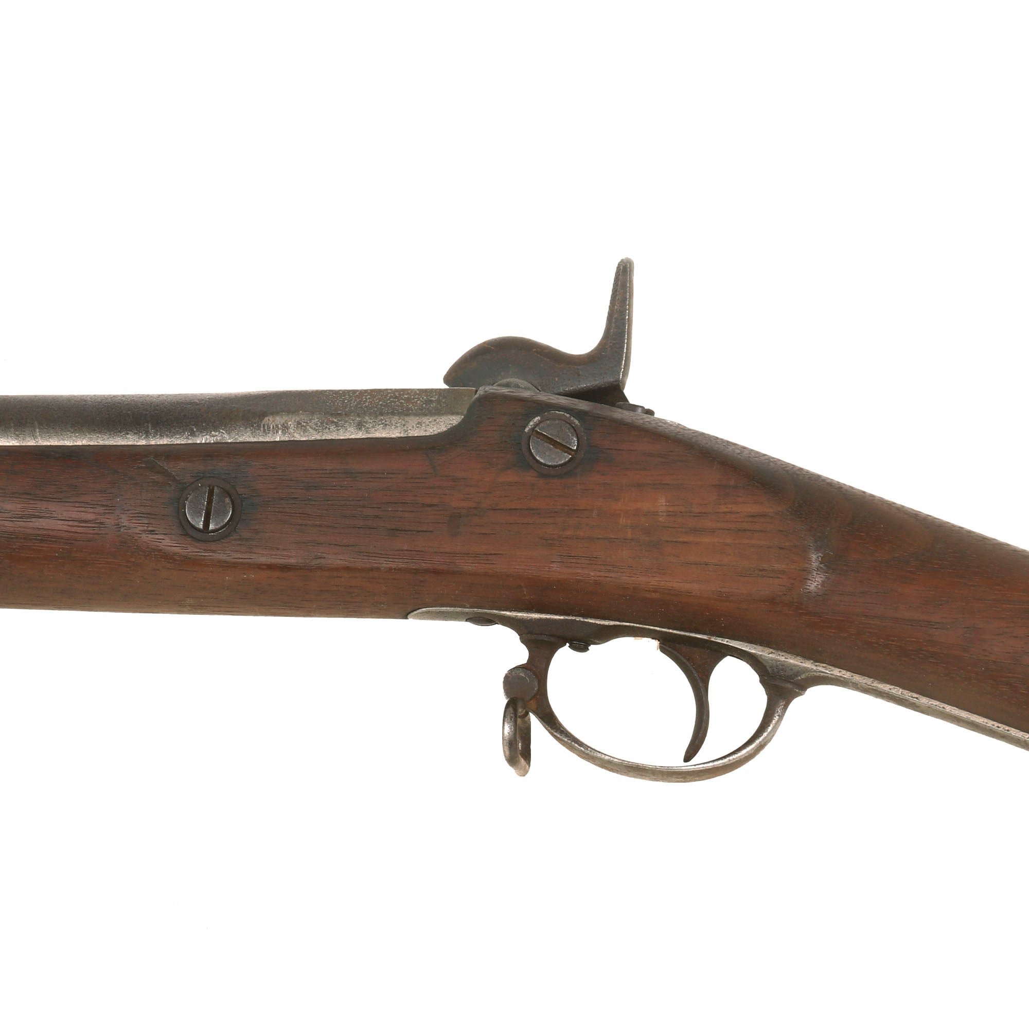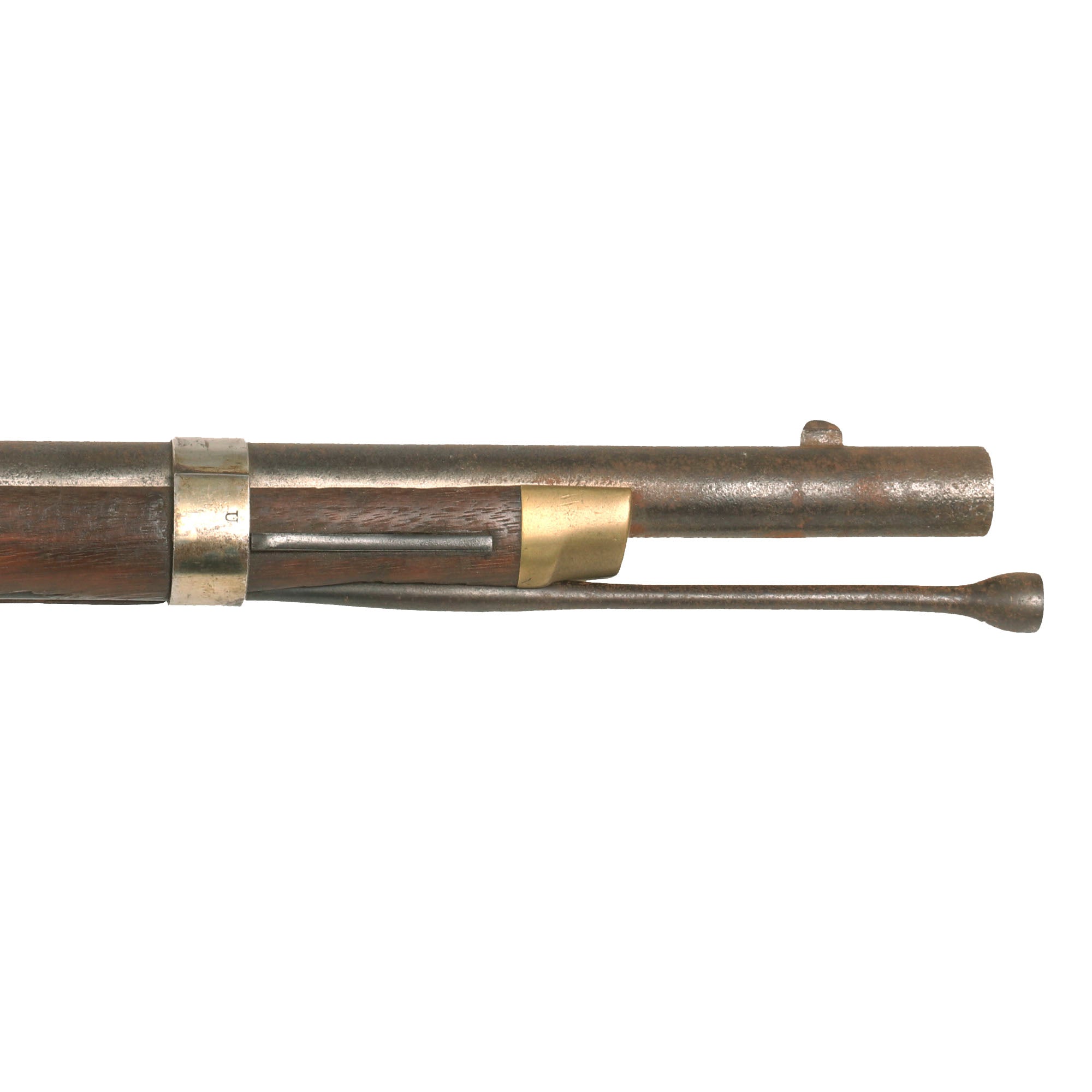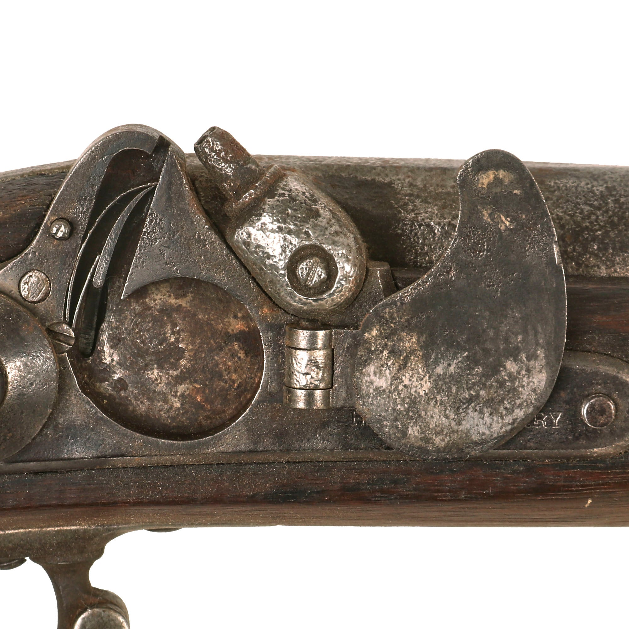 Original Item: Only One Available. This Civil War era single-shot muzzleloader is a .58 caliber Harpers Ferry Model 1855 percussion rifle-musket. Longarm has a 40” round barrel with broad three-groove rifling. Barrel is secured to the stock with three-barrel bands and three band springs. All furniture is iron including the lockplate, hammer, bolster, butt plate, trigger guard, swivels and ramrod. The nose cap is brass (changed to iron in 1859). Gun metal is deep gray and shows pinprick pitting throughout.
