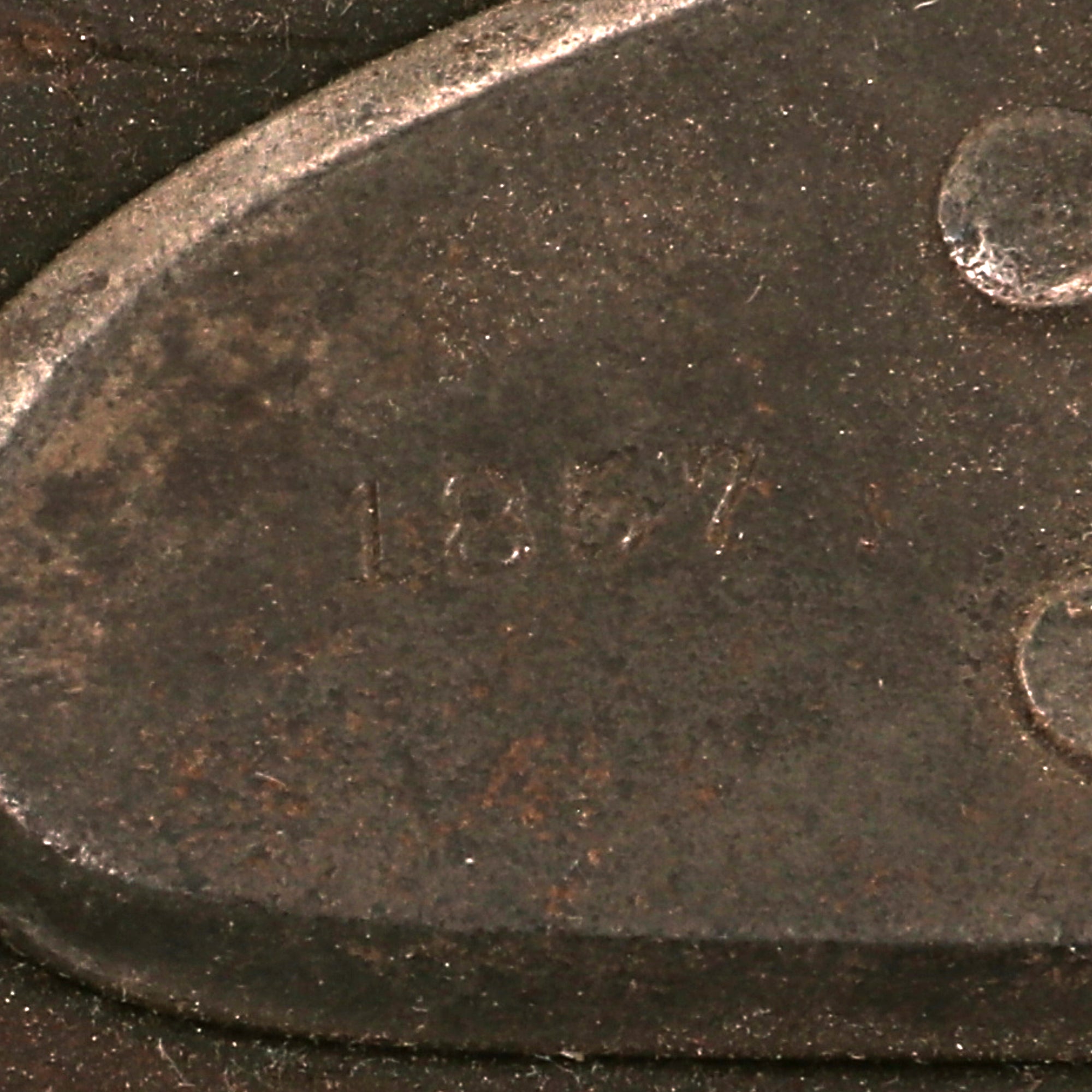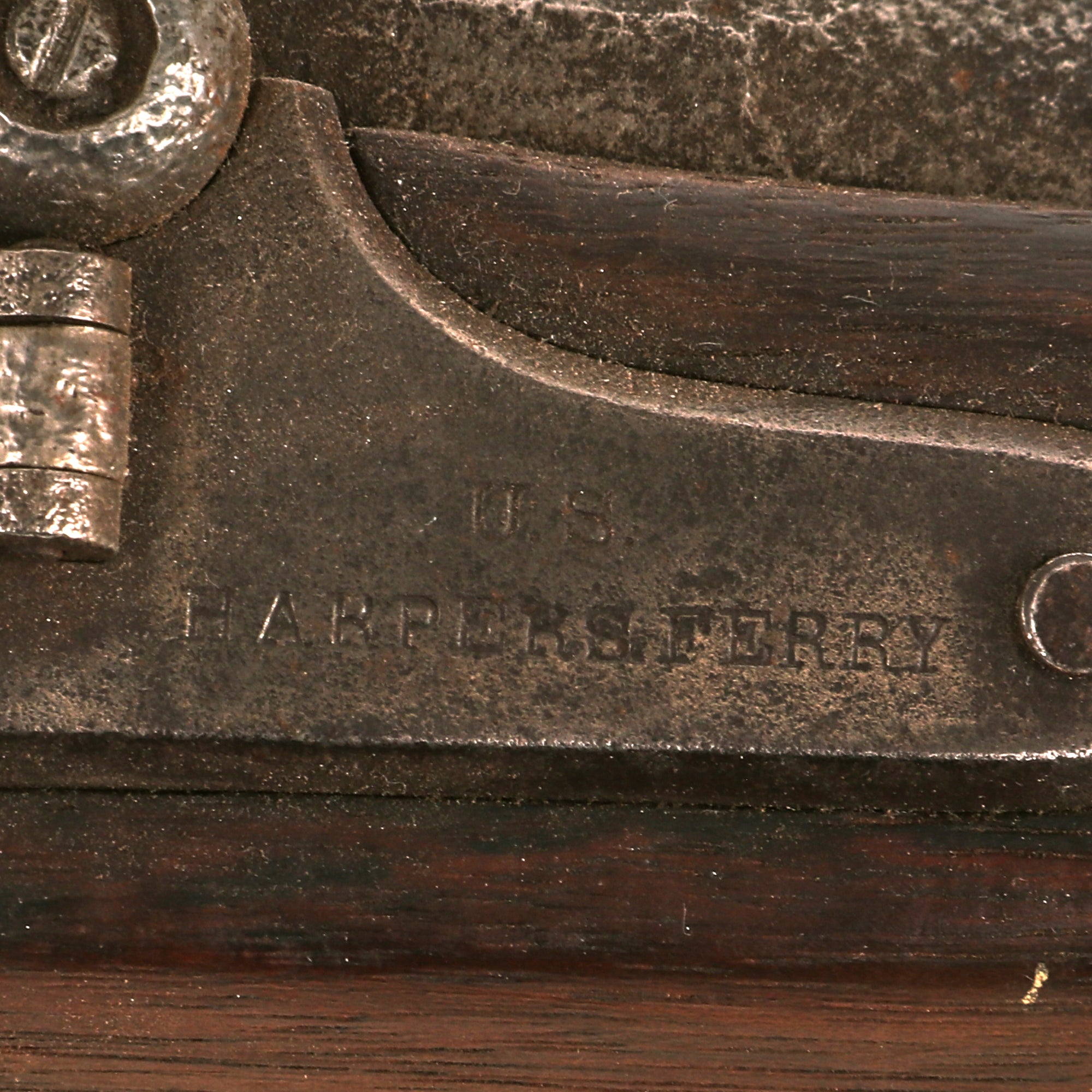 Lockplate stampings: large spread-winged eagle on the kidney-shaped primer door, the date “1857” stamped behind the high spur hammer, and the “U.S. / HARPERS FERRY” forward of the primer door. Original nipple. Hammer/trigger mechanics are strong and operate well.