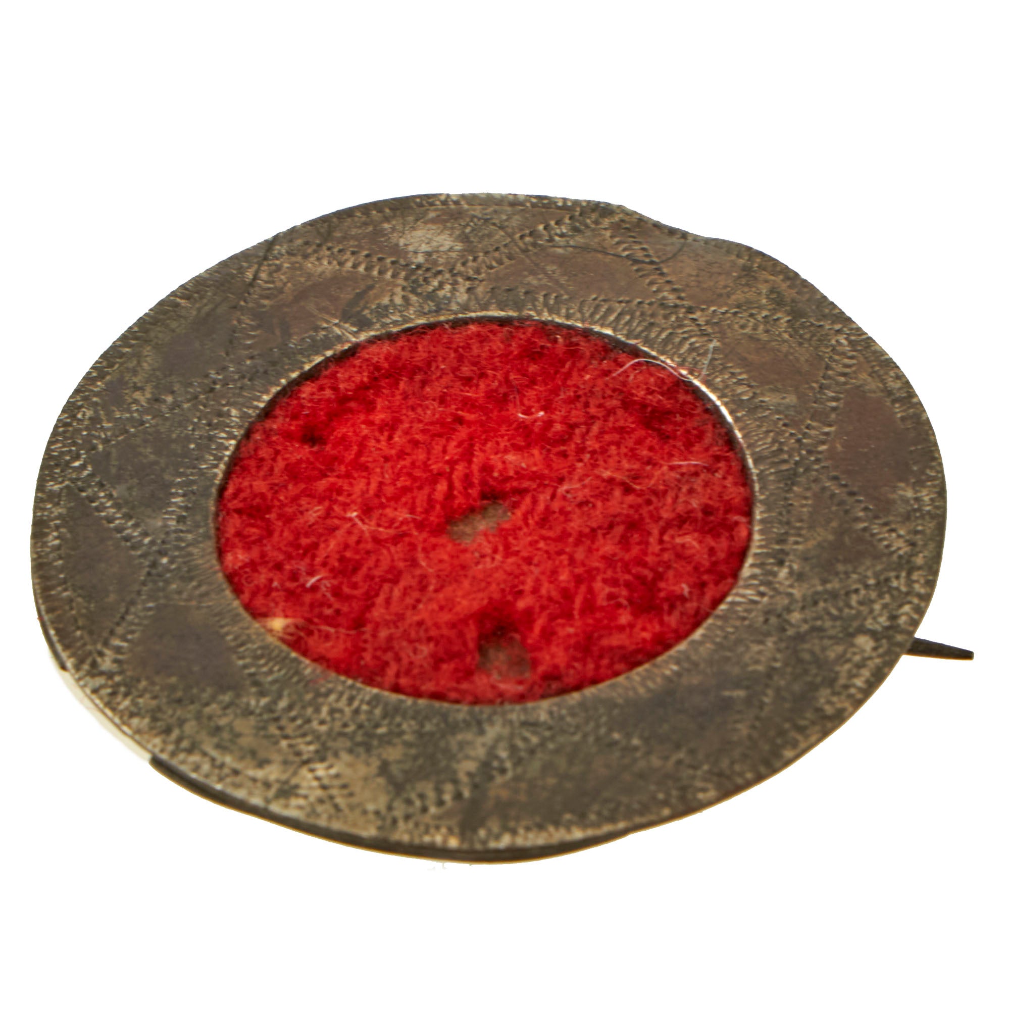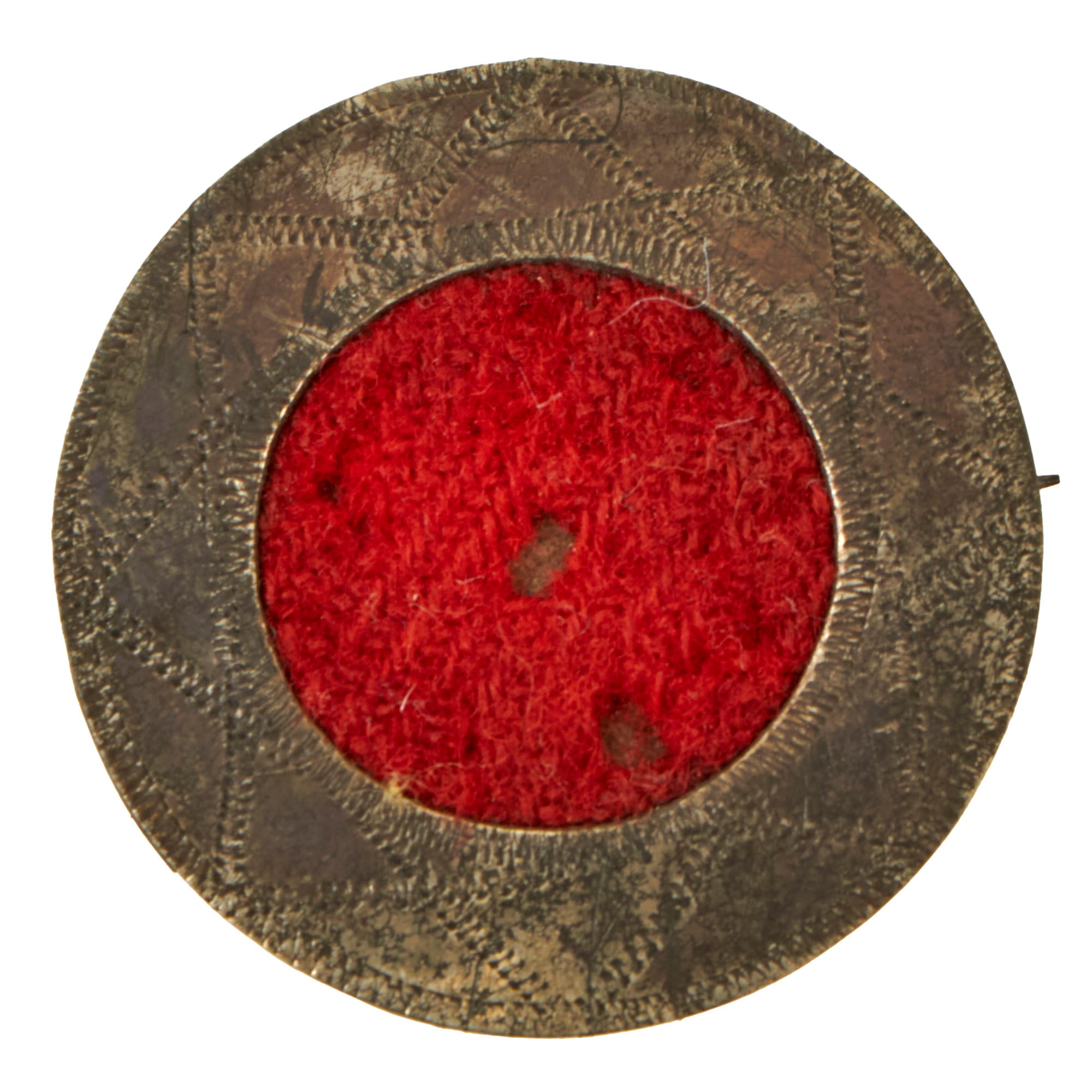 Original Item: Only One Available. This is a fantastic example of a small I Corps, 1st Division badge as worn on the various types of uniforms & caps of the Union Army. The badge measures approximately 1½” in diameter and is in great shape for its age.It is constructed of red felt in a metal frame which has been ornately decorated, and has a pin-back.