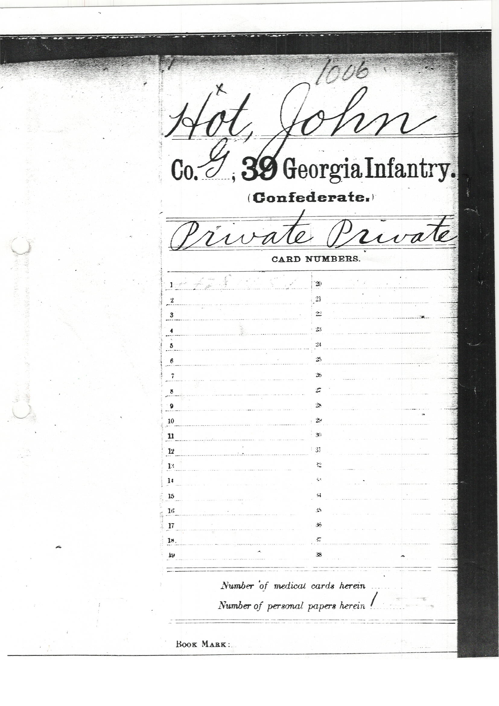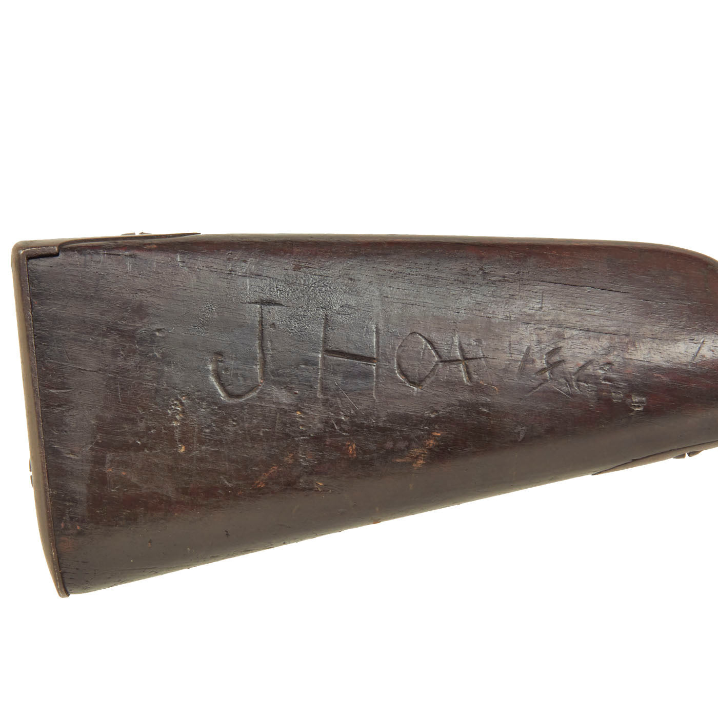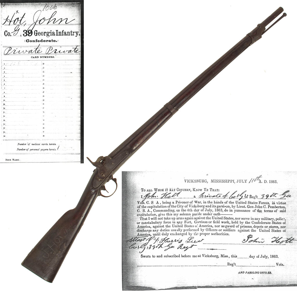 Original item: One Only. This musket is identified to a Confederate Soldier Pvt. John Hot of the 39th Georgia Infantry Co. G. This unit was ordered to Tennessee, then Mississippi where it was Brigade under T.H. Taylor in the department of Mississippi and east Louisiana. After fighting at Champion Hill, most of the unit, including Private John Hot, was captured at Vicksburg on July 4th, 1863 and exchanged and assigned to General Cummings Brigade, the 39th went on to participate in the campaign of the Army of Tennessee from Chattanooga to Nashville and in 1865 saw action at Bentonville, North Carolina.
