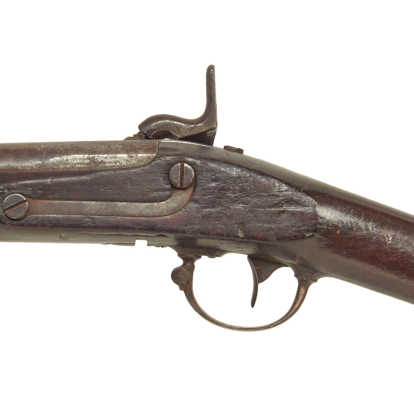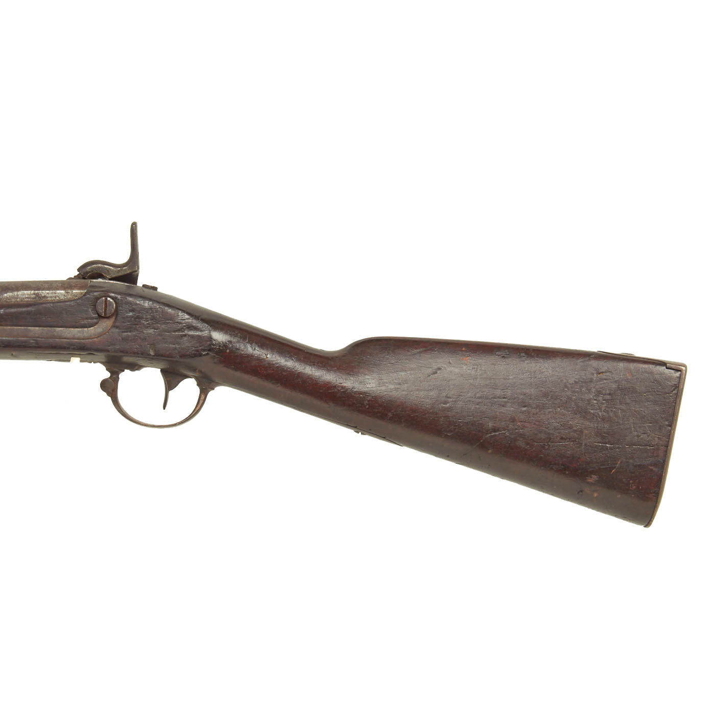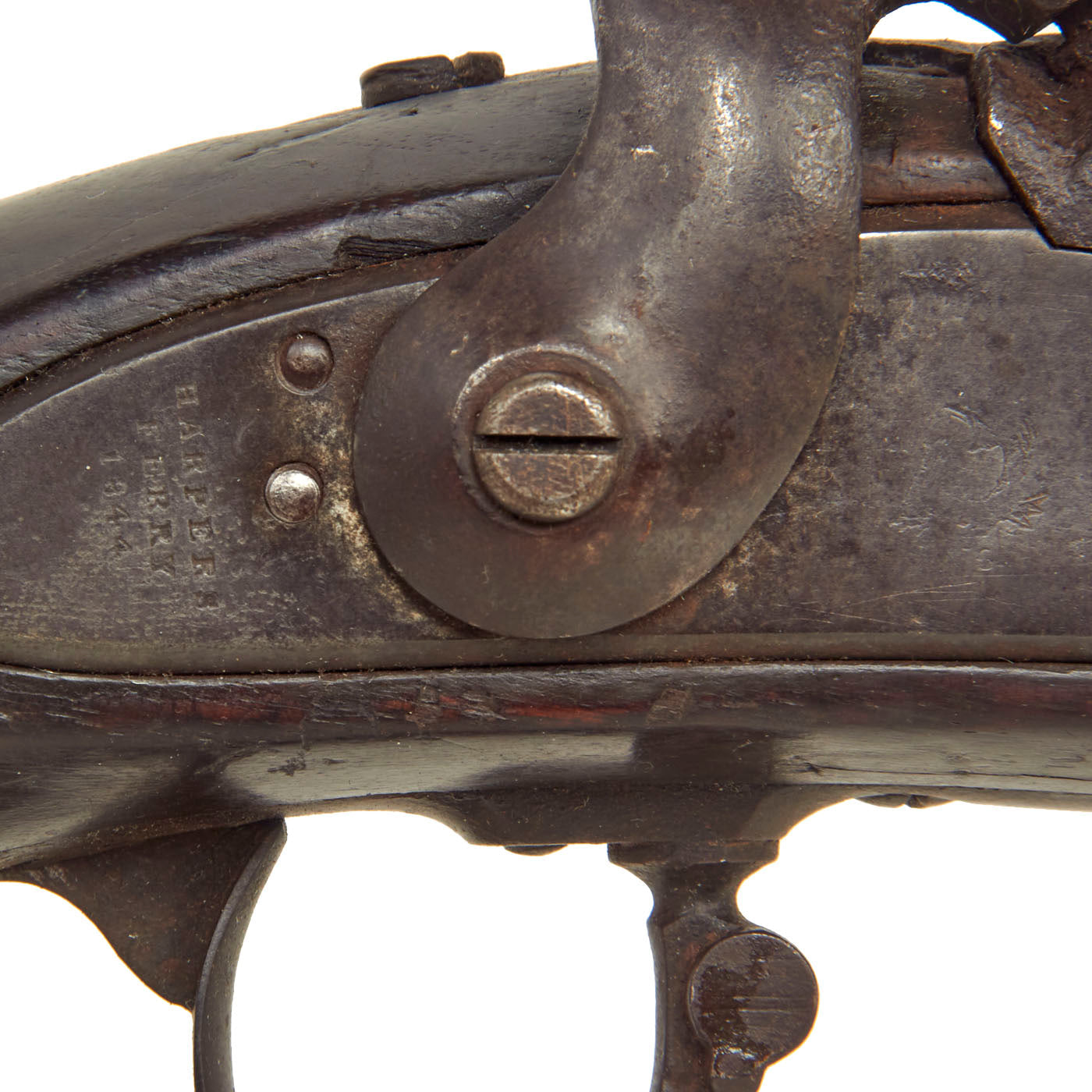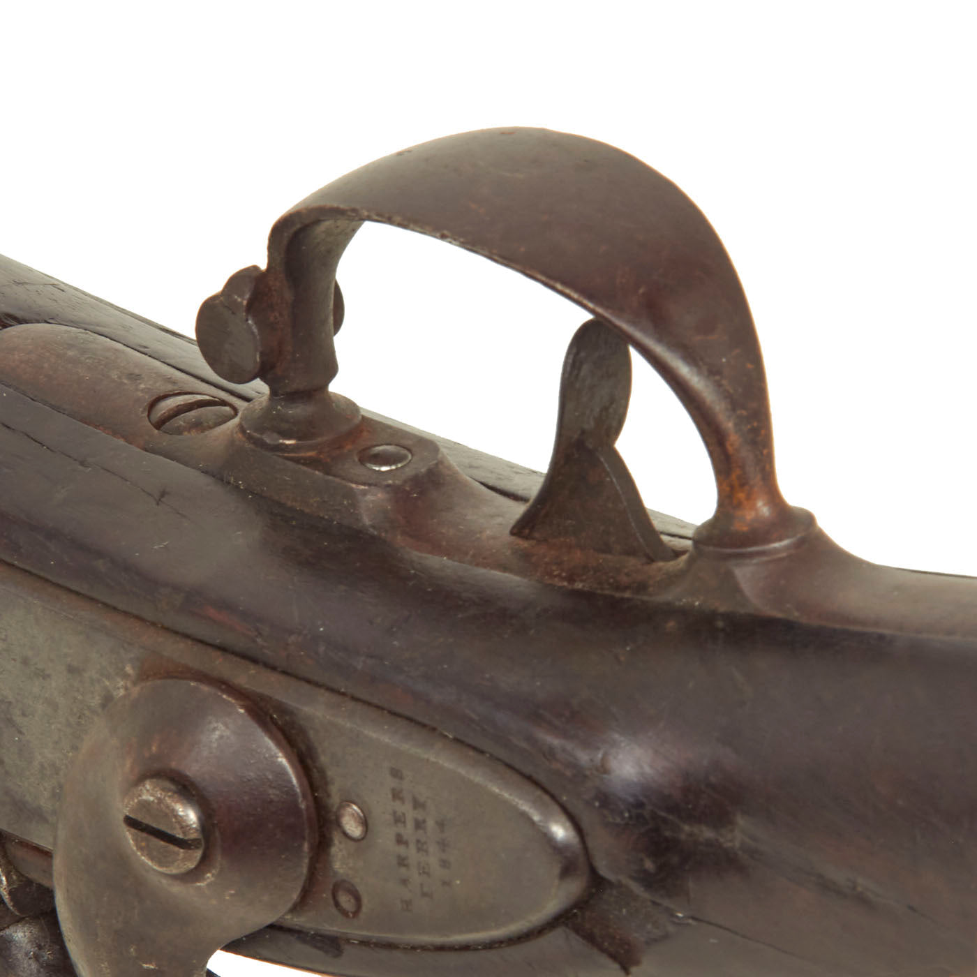 This example is marked with the usual "American Eagle" over US, and the lock plate tail is faintly marked HARPERS / FERRY / 1844. It is a shorter musket, either purpose made or converted to be an Artillery Short Musket, which were not carried over the shoulder, so they did not require sling swivels. Many of the Model 1842 muskets were produced under contract, however this example was made at the Government Harpers Ferry Armory. The rifle side plate is thin and not bulged, as typical of the Model 1842 Musket. Previous iterations had had a more pronounced side plate with a bulge in the middle. The barrel has the correct V / P / Eagle's head proof marks on the left side.