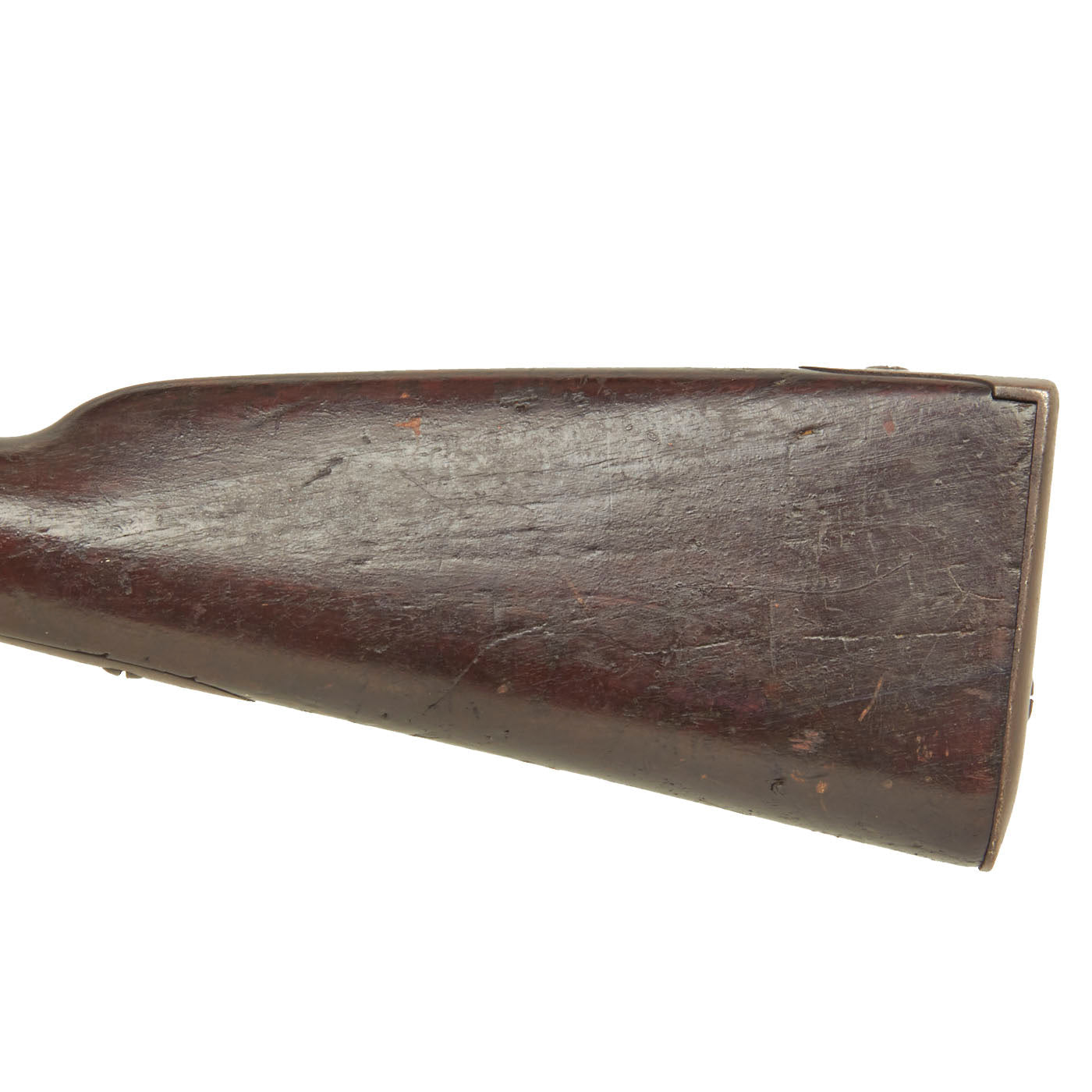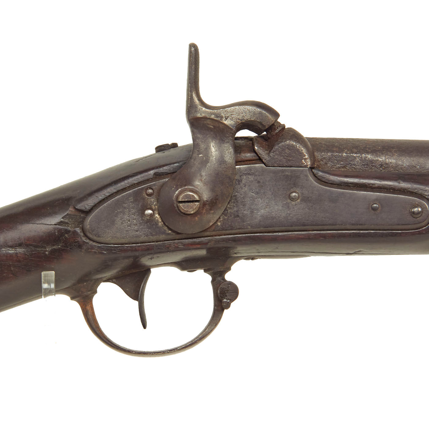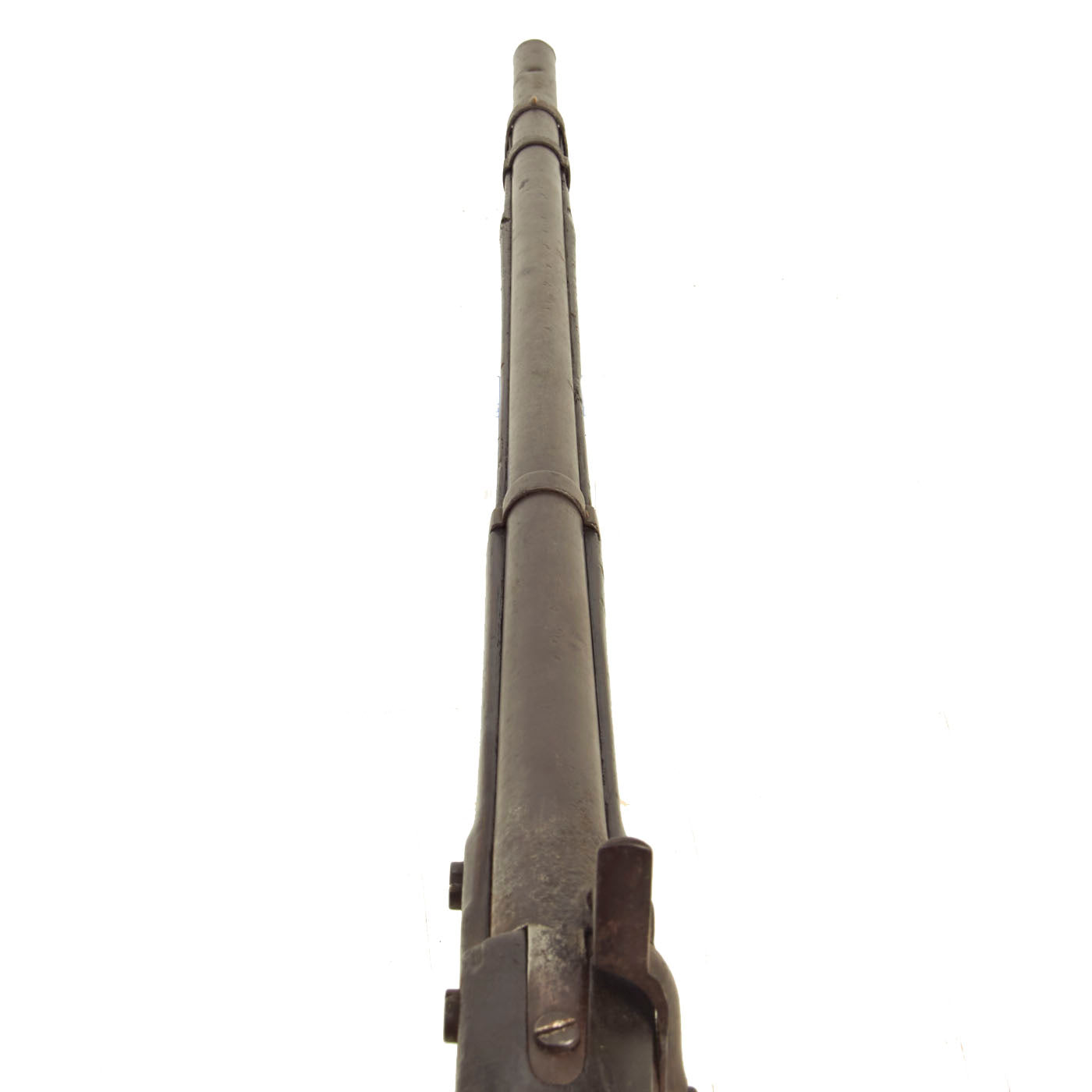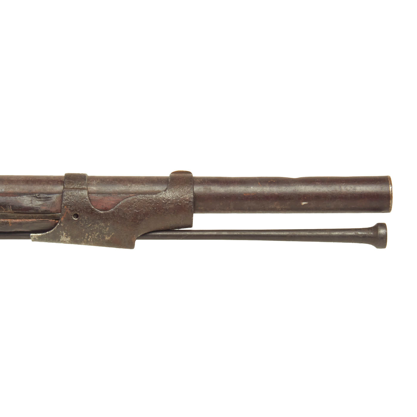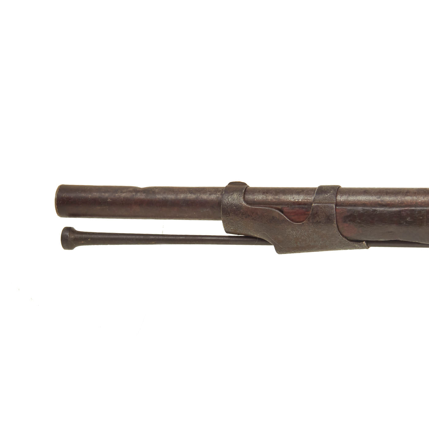All iron mounts this .69 caliber shortened musket ( a common Confederate modification) is in good condition, with the original ramrod present, and correct single barrel band and muzzle fitting. Having seen use it is speckled overall with old pits, but is still in fine condition and really good for display. The lock functions correctly, holding at half cock and firing at full. Stock shows crack and dings but is very solid. This is a well used musket named to a identified and researched Confederate soldier.