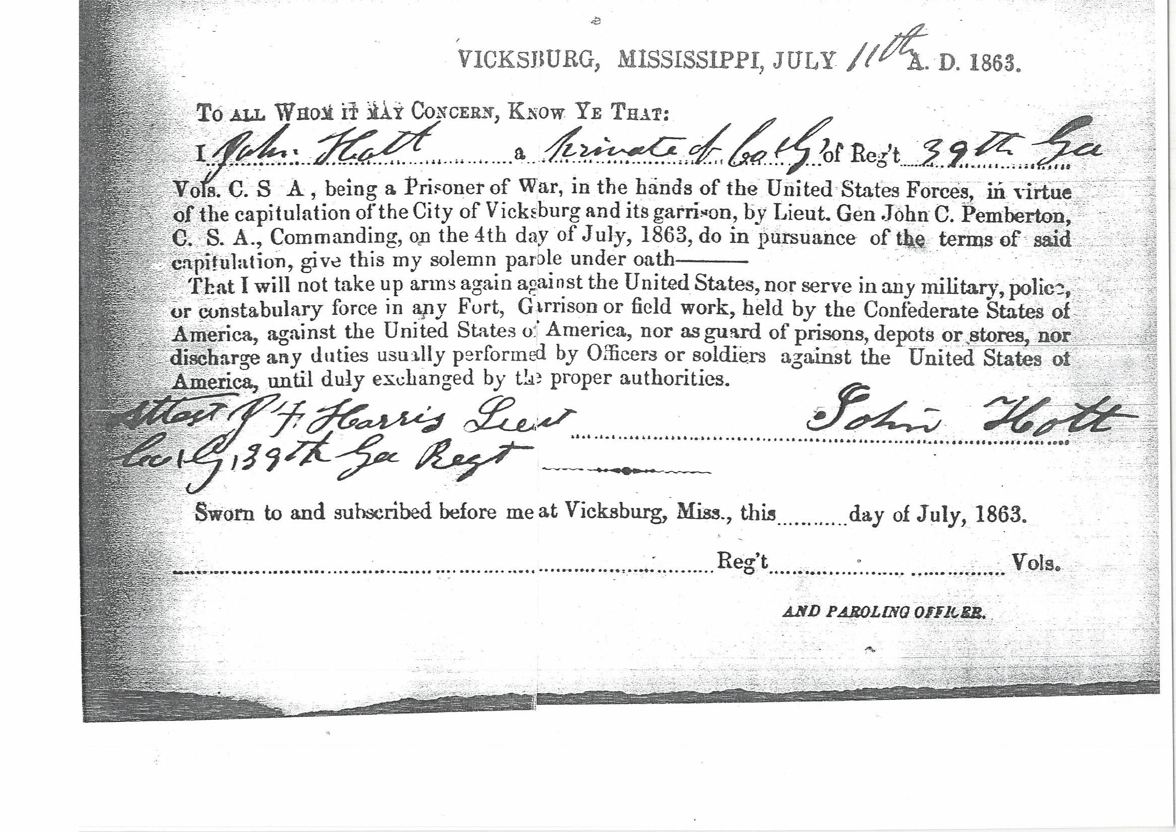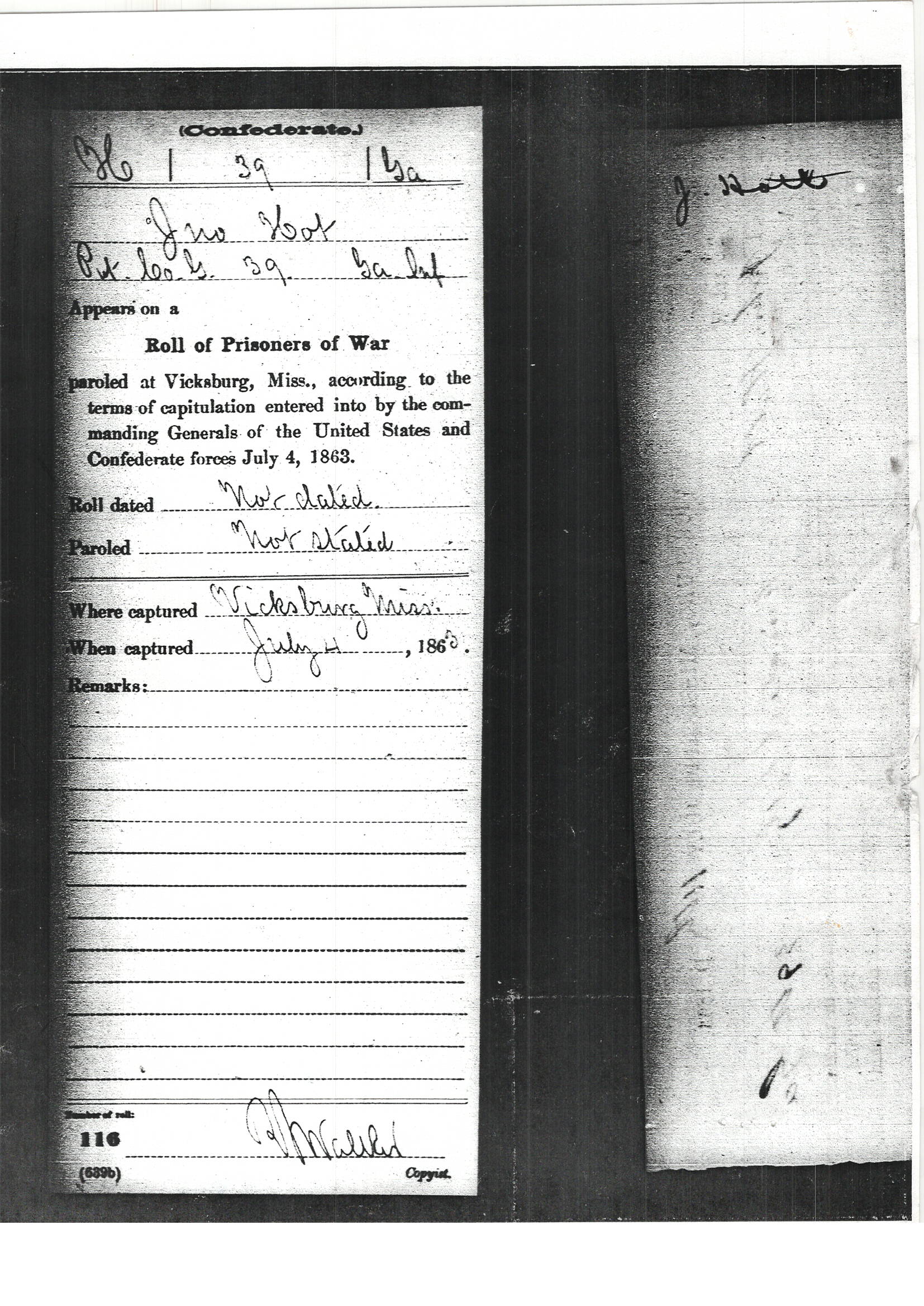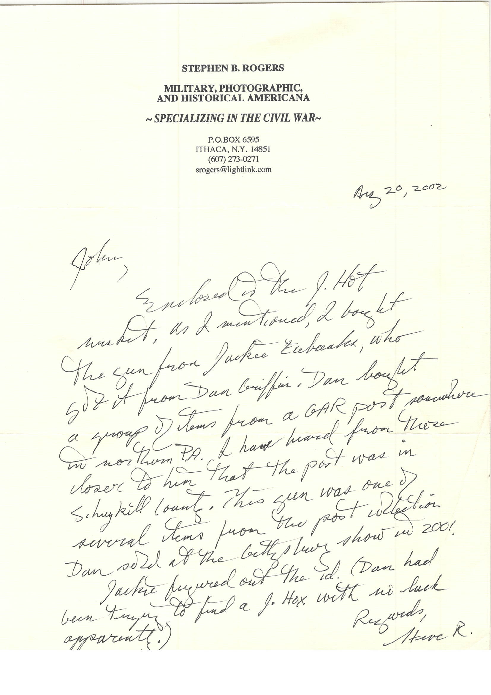 There is no Muster-in Roll in John Hot’s Compiled Military Service Record. However, one very interesting muster roll card was found, which recorded the he was a Prisoner of War, captured at Vicksburg on July 4, 1863. His Oath of Parole was signed and dated July 11, 1863. Included with this musket is a folder of research including copies muster roll cards, copies of original documents, research and a previous owner letter from 2002.