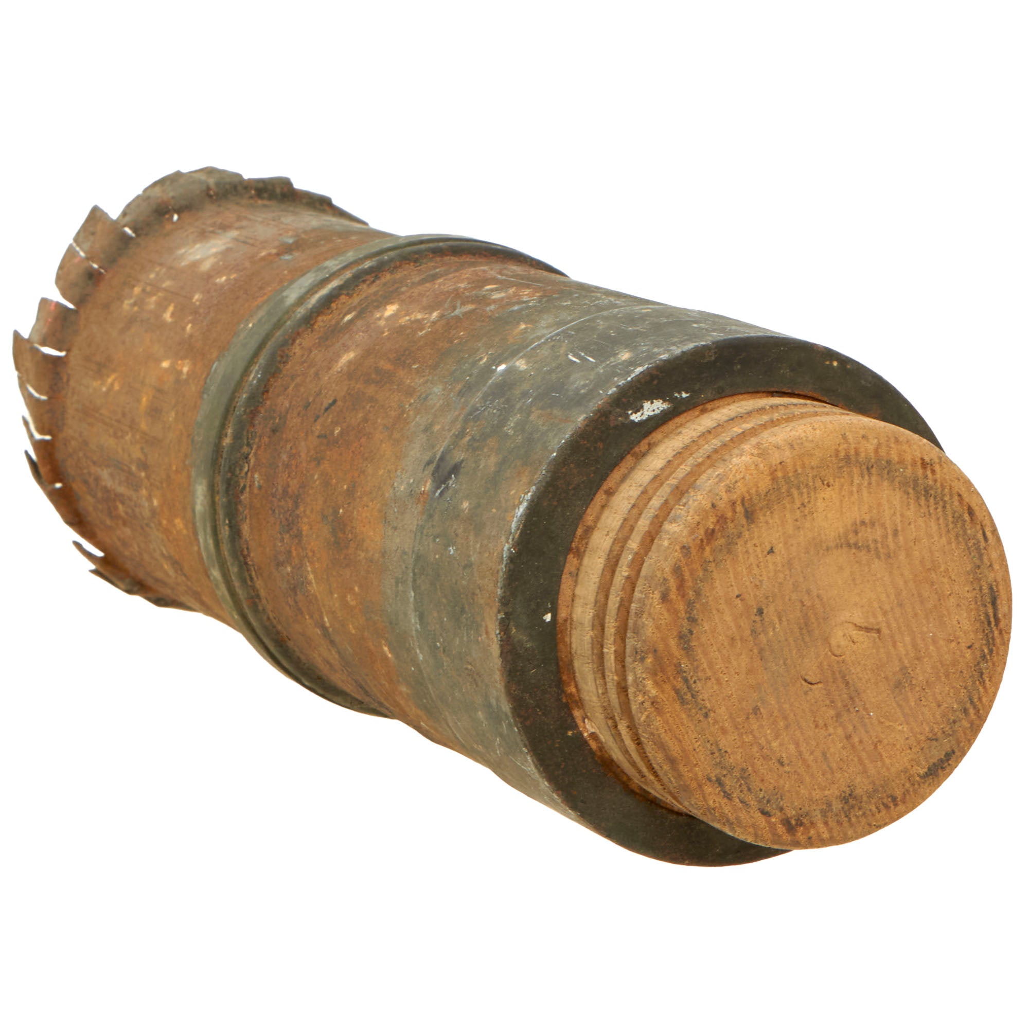 This example is still in wonderful condition and appears to be complete minus the shot. The wood is still in great condition and is marked with what are likely inspection markings. The crimped edges are pointed upward and the lower crimps are visible on the interior. The round has a diameter of 3” and a total height of 8 ⅞”.
