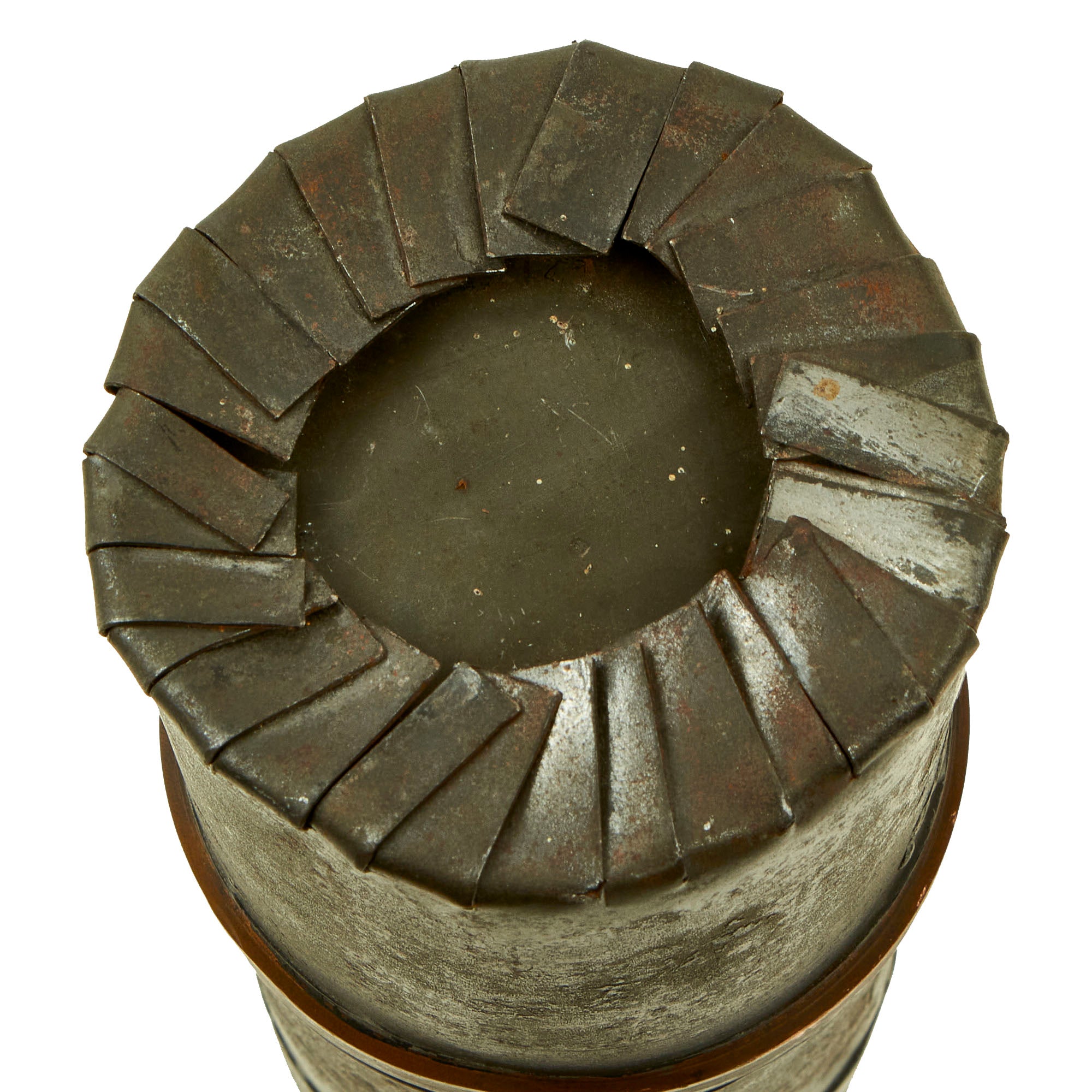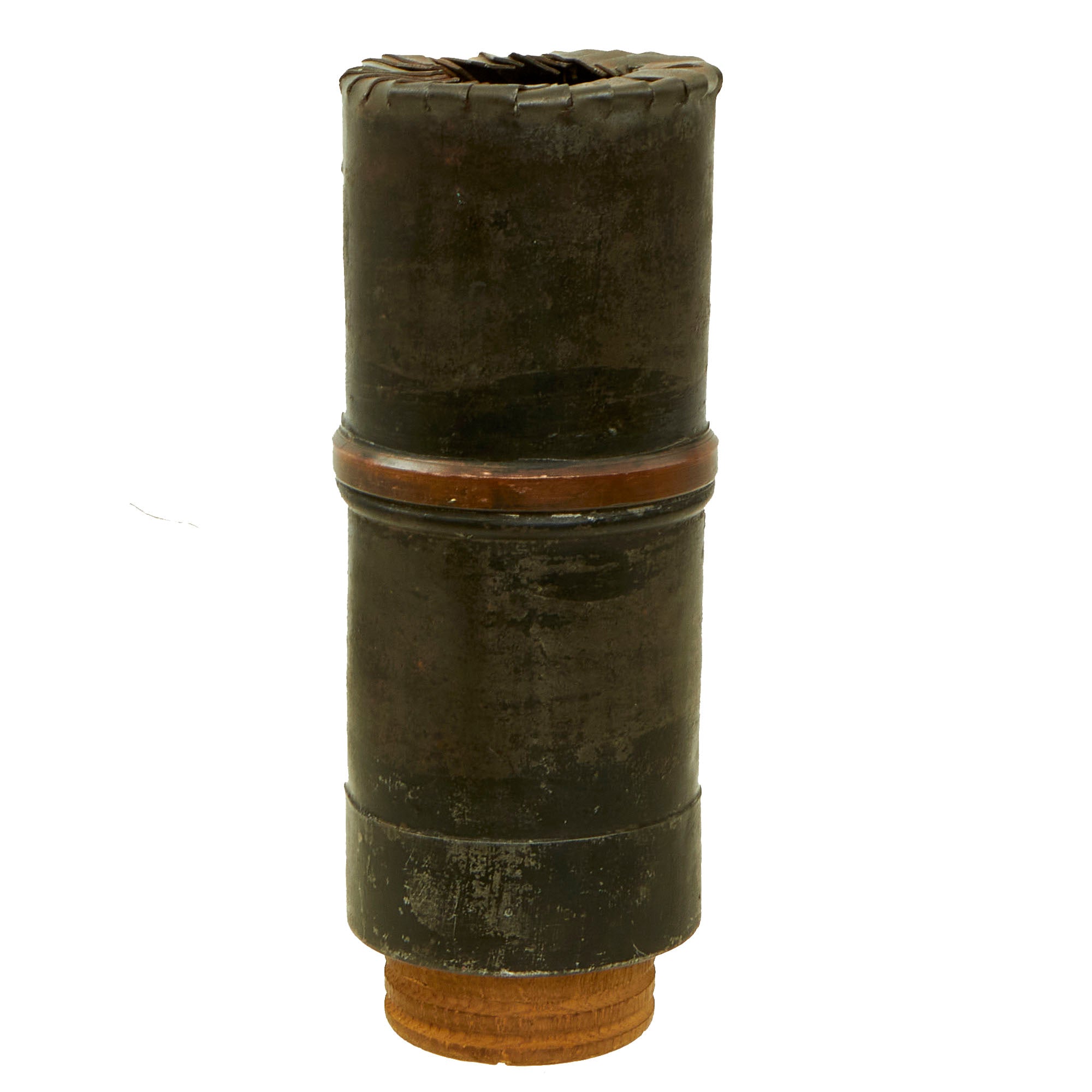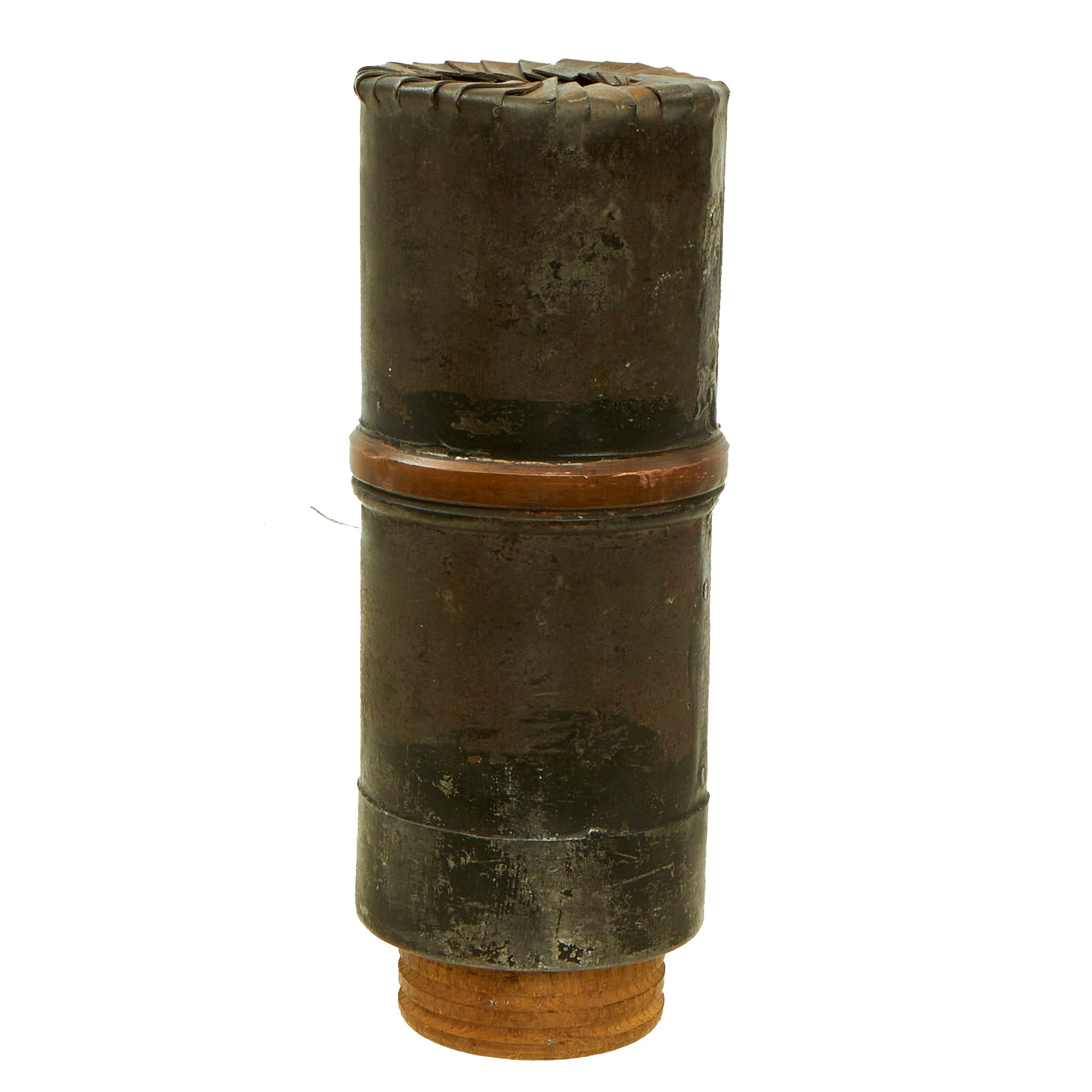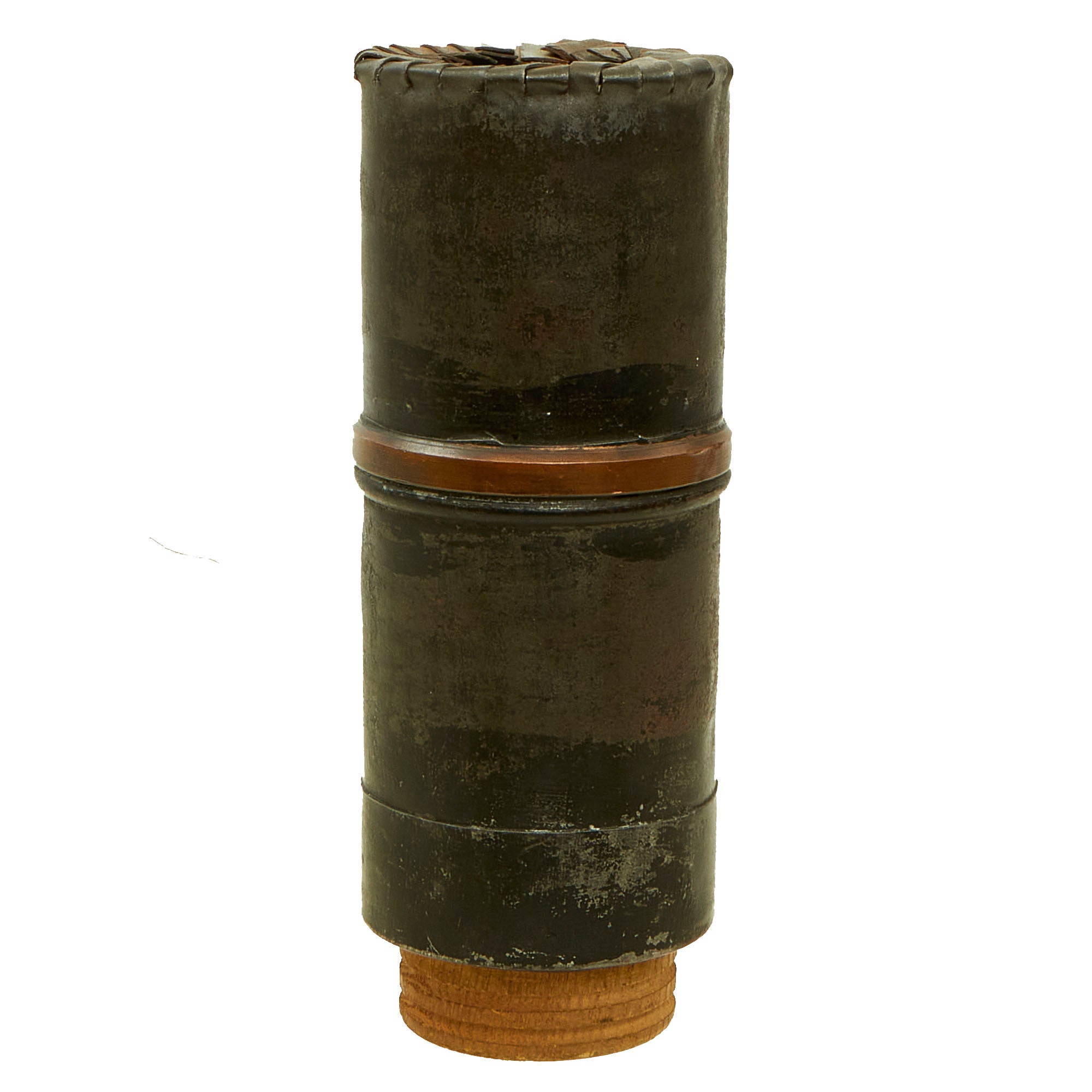 This example is still in wonderful condition and appears to be complete minus the explosive content. The wood is still in great condition but may be a later replacement to complete the outward appearance. The end cap under the crimped end is still present, though sits loose now that there is no powder charge present. The driving band is still present and does not show any signs of this round ever having been fired. The round has a diameter of 3” and a total height of 8 ½”.