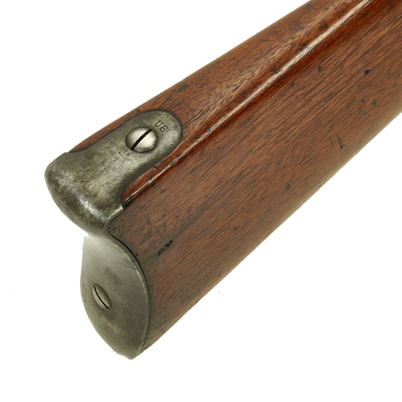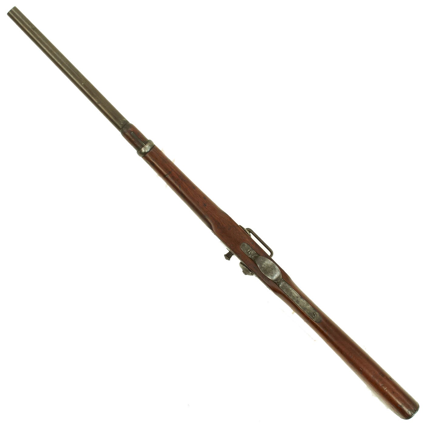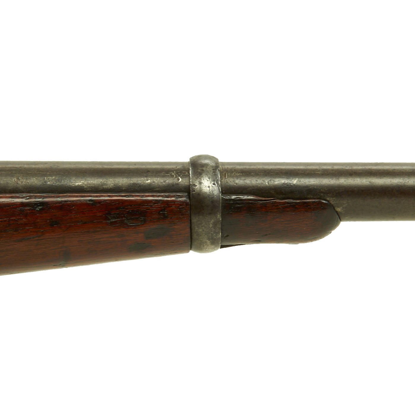 The example we have is in fine condition, with all parts intact and in good shape, bearing serial number 5664 on the breech block and receiver tang. The wood finish is excellent, an there are still two inspectors cartouches right above the saddle ring. There is some damage to the wood around the breech, and there is a repaired crack running straight through the stock where the tang screw is.