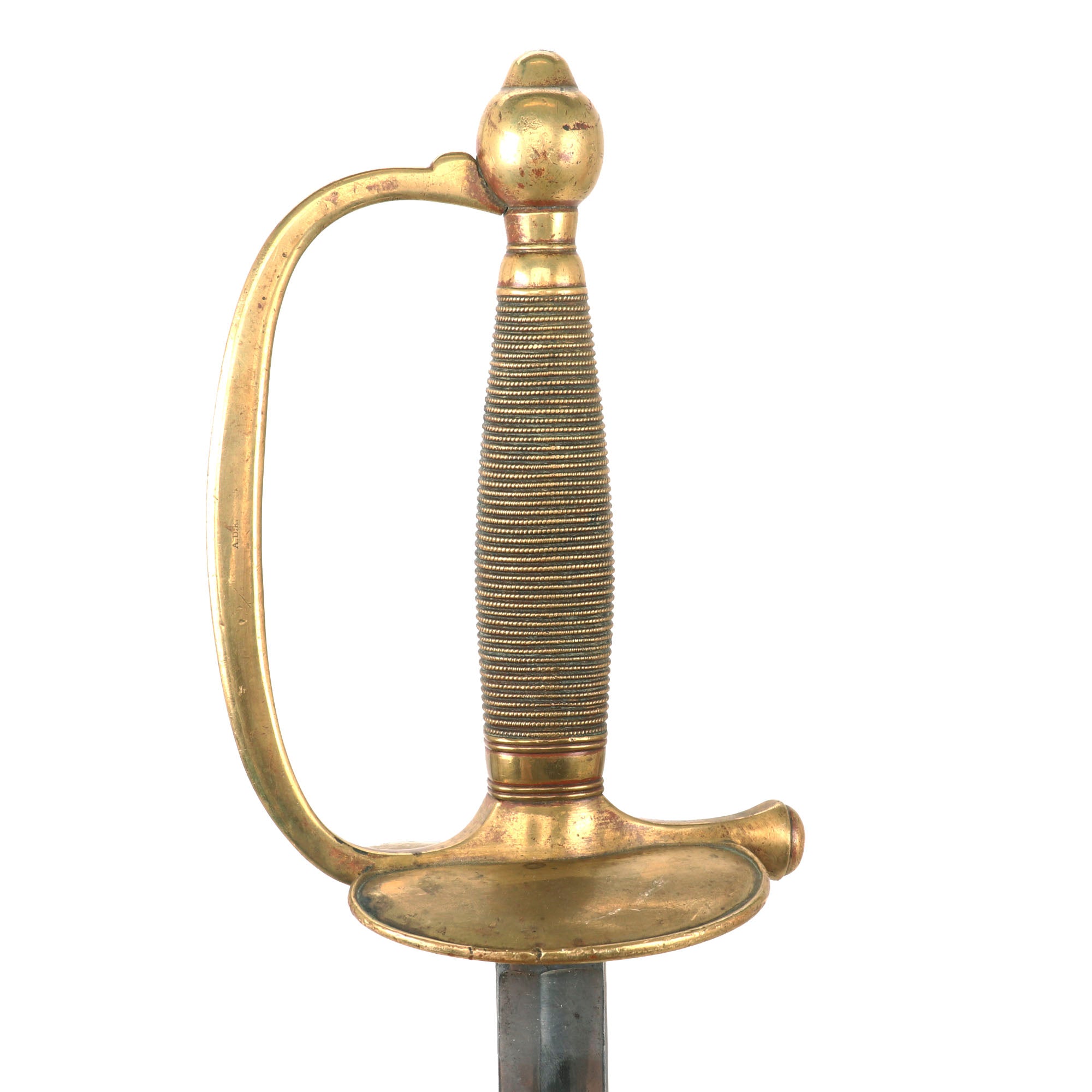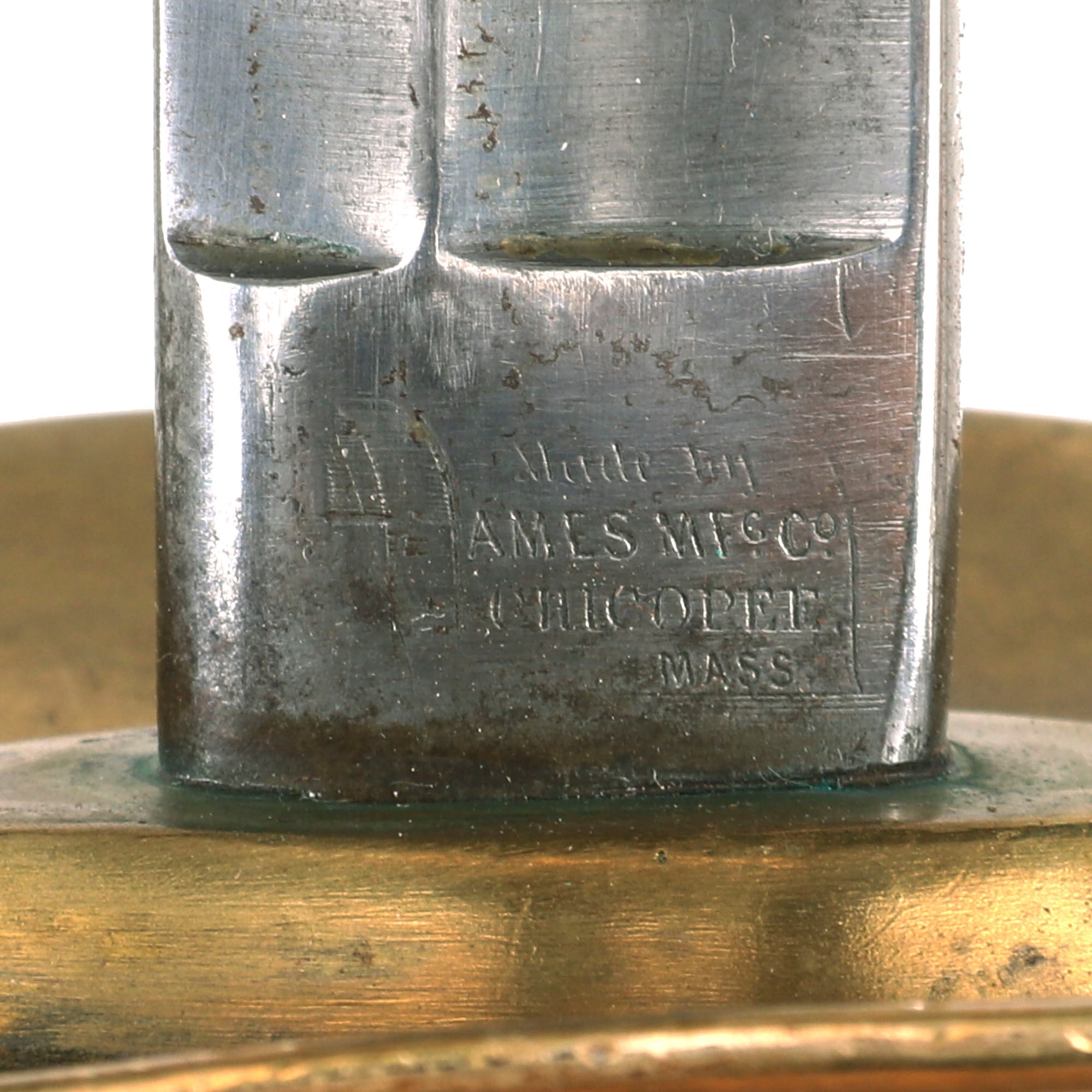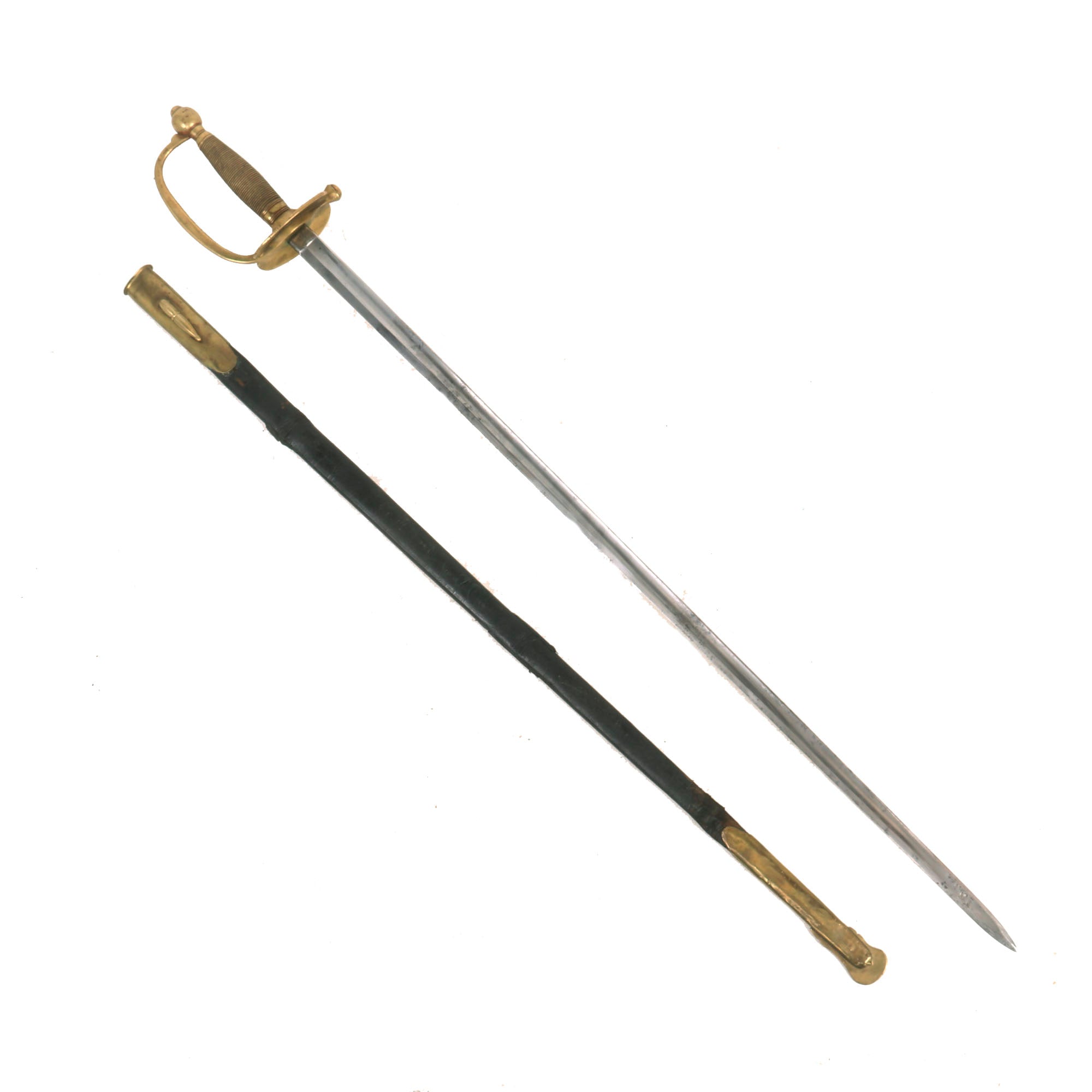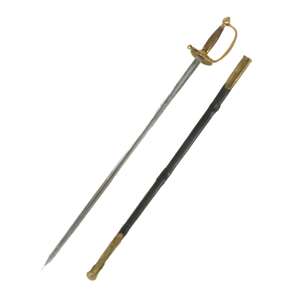 The sword measures 38 ¾ " overall, and has an all-brass hilt, with a "double scallop" cross guard, and a "D" hand guard enclosing the knurled hand grip. Comes complete in its straight brass-mounted steel scabbard with intact frog hook. The 32 inch straight blade's ricasso is marked on one side with the Ames Mfg. Co. Scroll company marking, which is partly faded at the top: