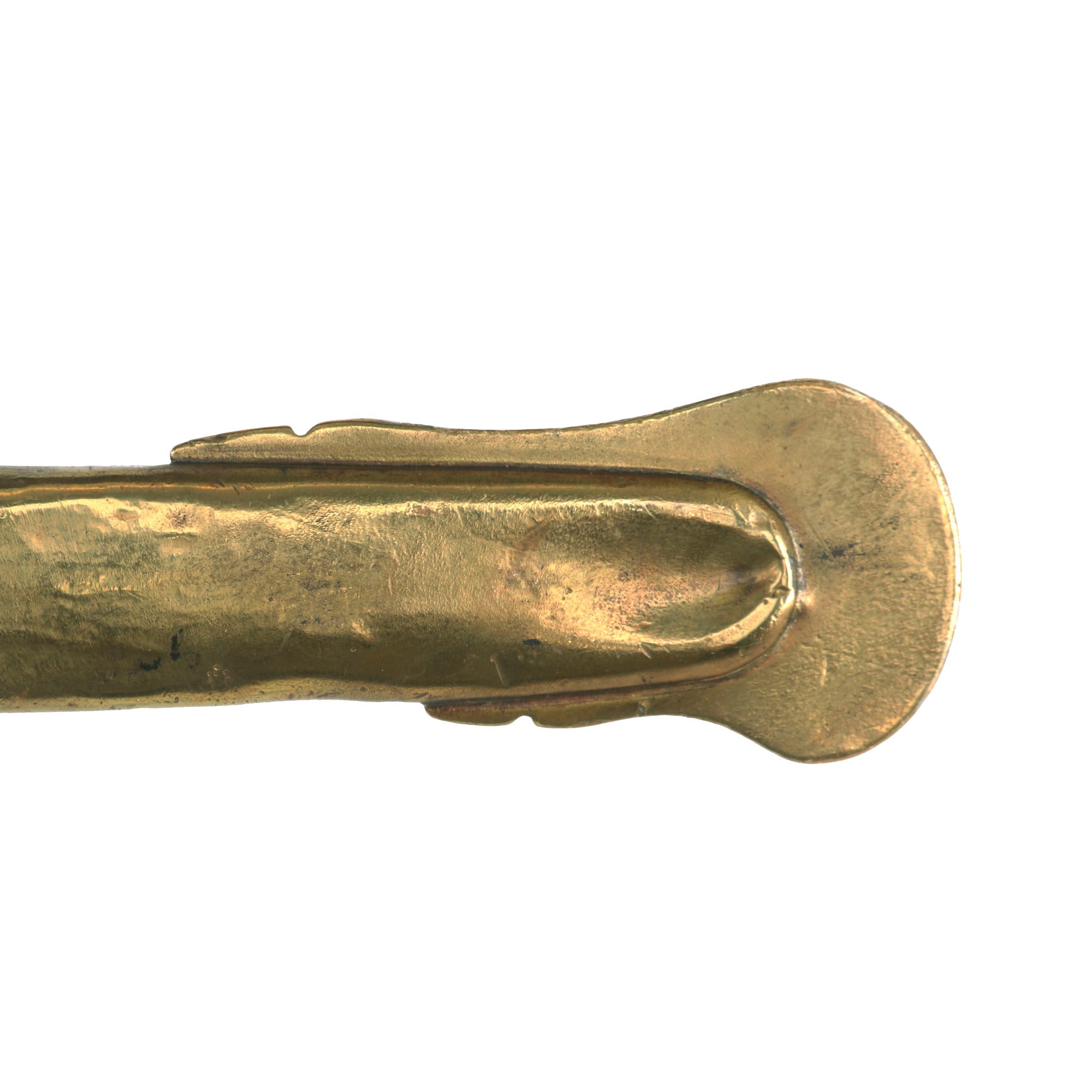 The scabbard on this example is in rough shape with much of the leather showing damage, and some of the brass fittings are disconnected but still display as connected. When removing the scabbard from the blade, extreme caution should be taken, and several points of contact should be made to ensure the scabbard is not damaged.