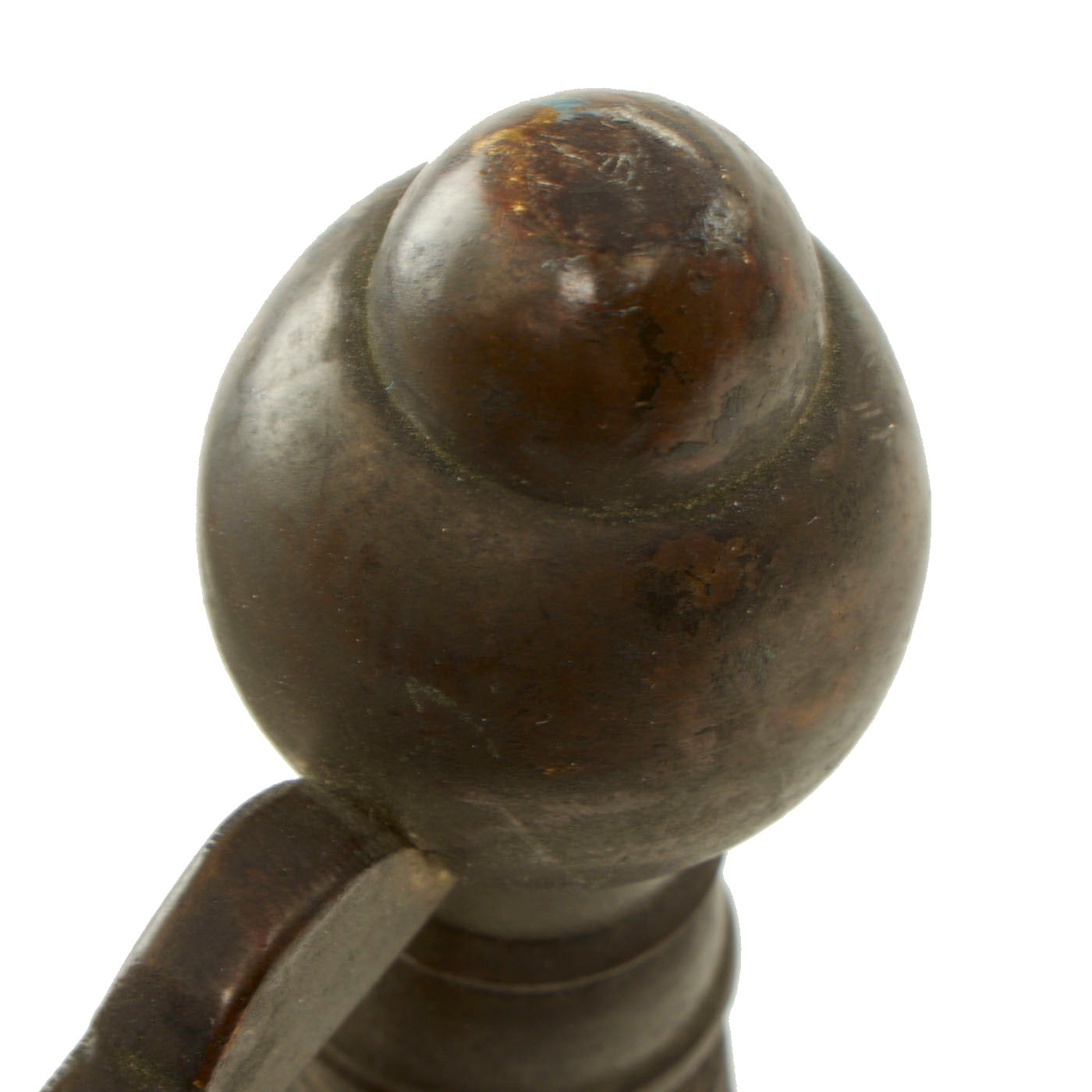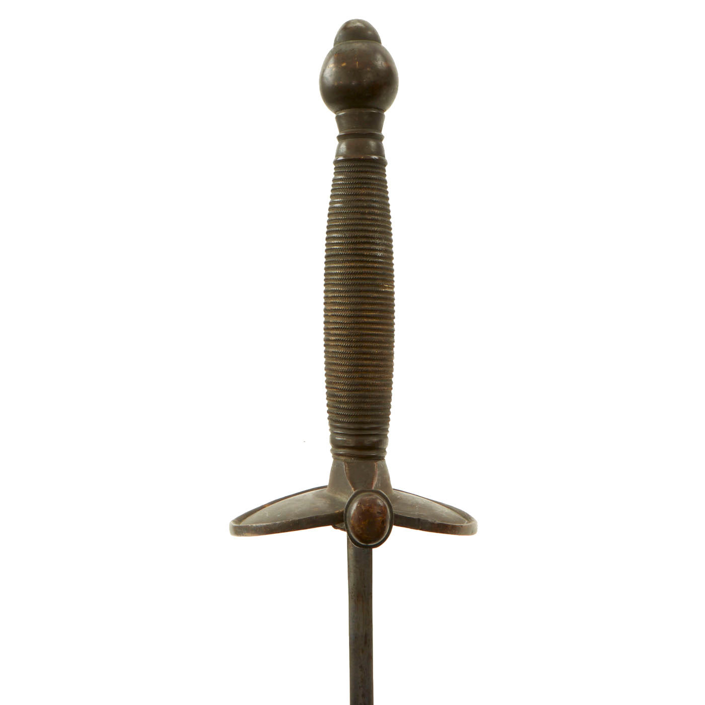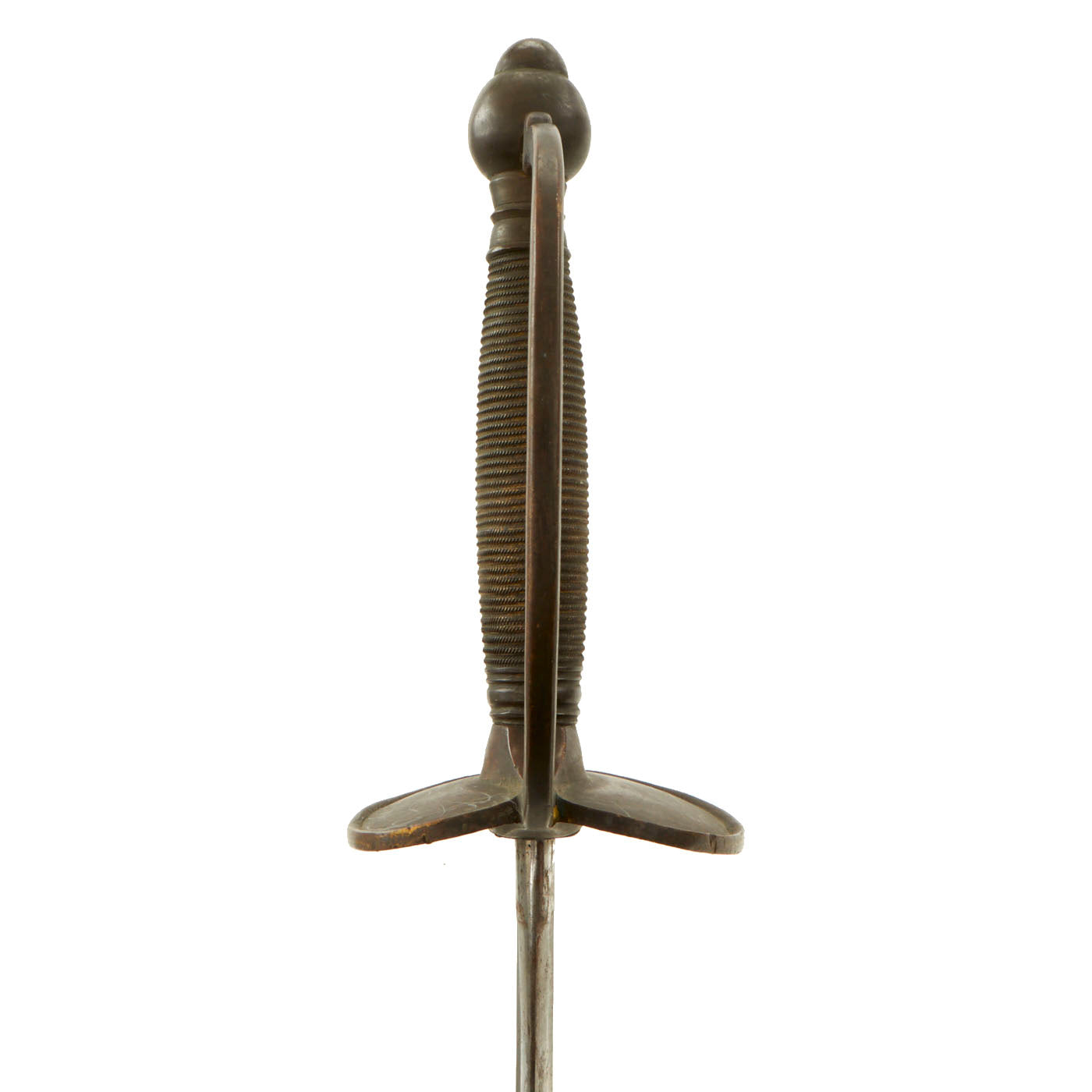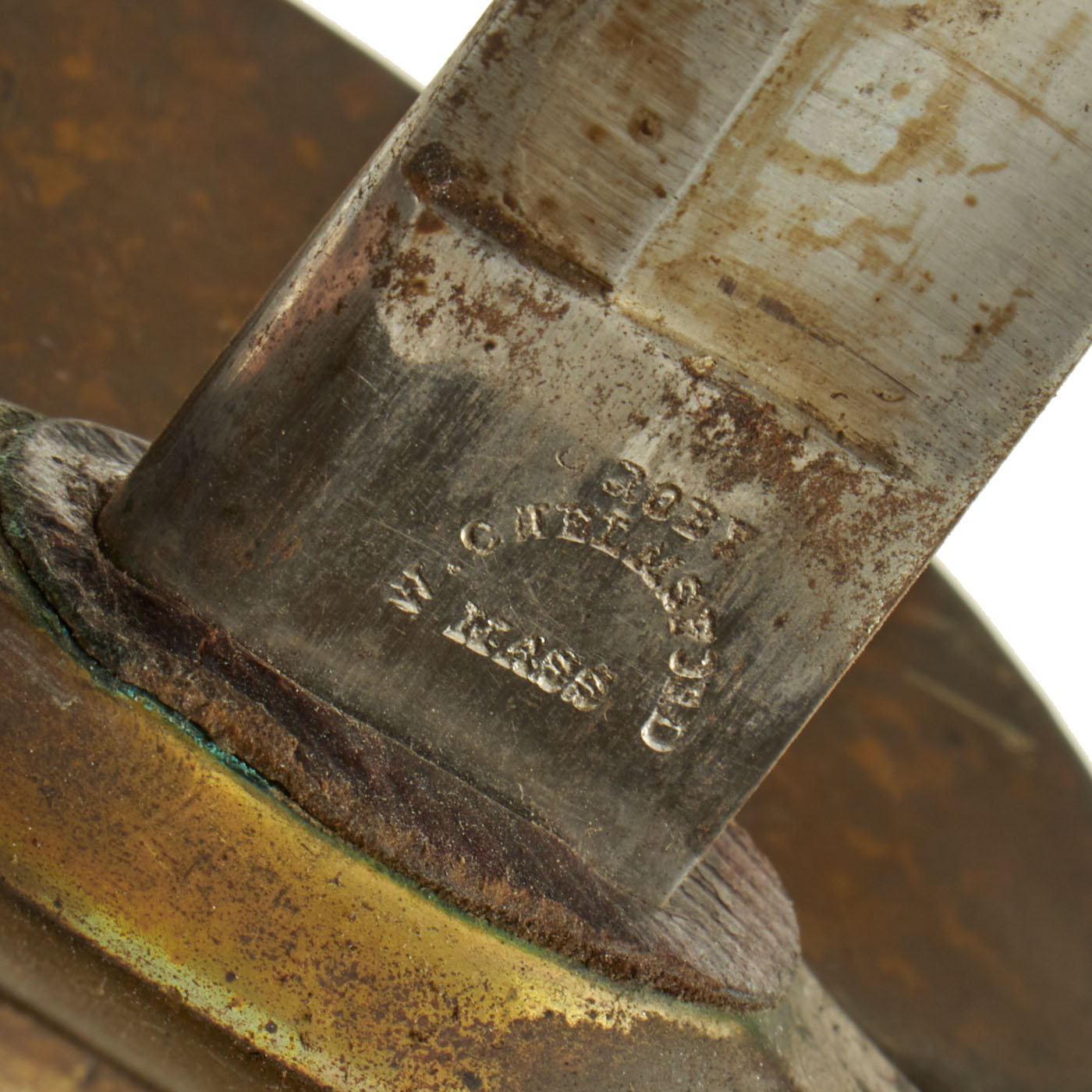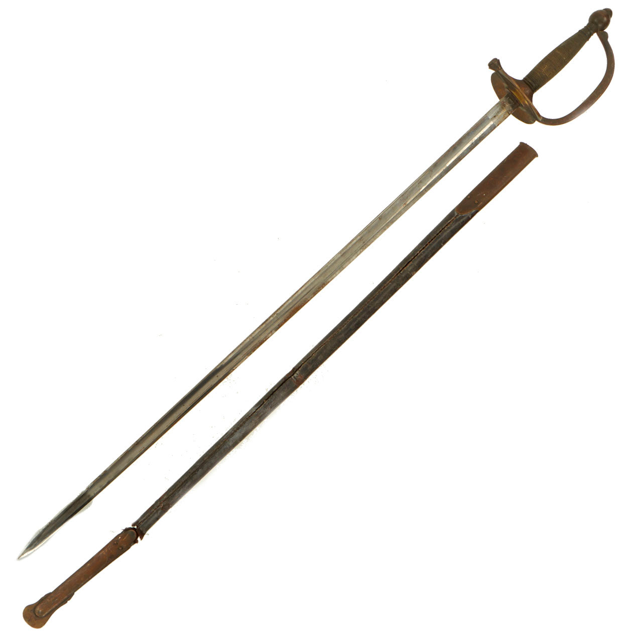 The sword is in very good condition, with a very nice blade that has very little wear from service. It does however show oxidation from contact with the leather scabbard, which we have left intact to preserve the history. The all brass handle has a lovely oxidized patina, with no damage or bending.