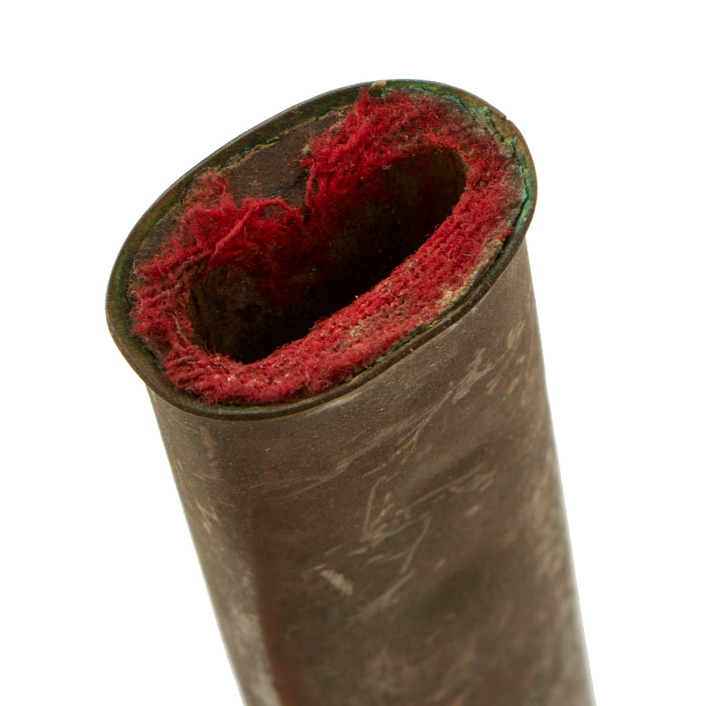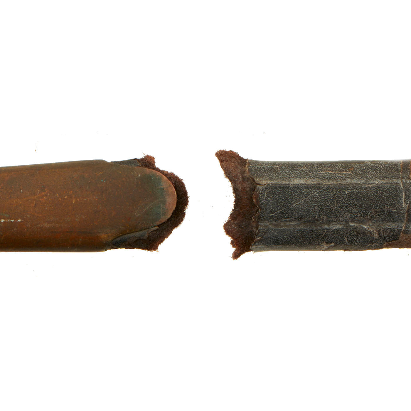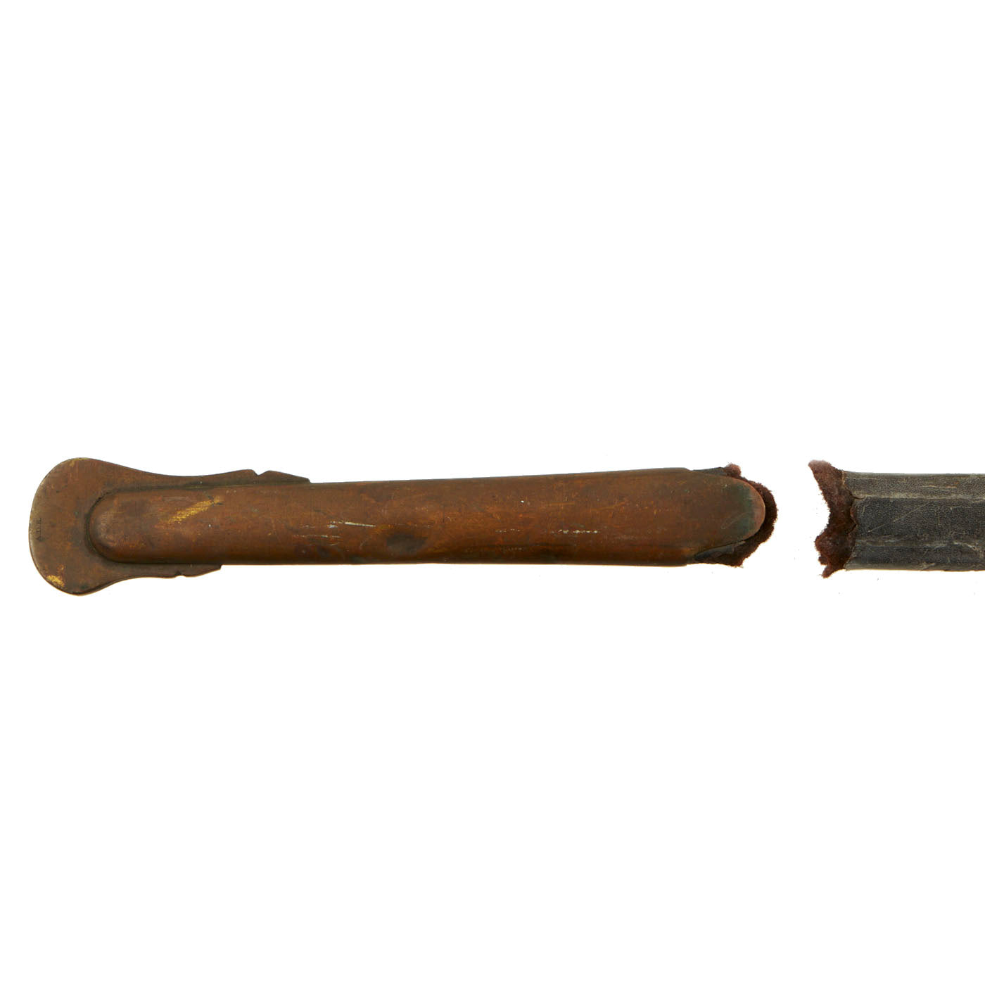 The scabbard unfortunately has suffered damage over the years, as leather is not nearly as durable as steel during long storage. It has split along the seam along most of the length, and has a bend about midway down. It also broke off completely at the top of the brass drag. We still have both pieces, and have not attempted a repair. The brass fittings have the same great aged patina as the handle.