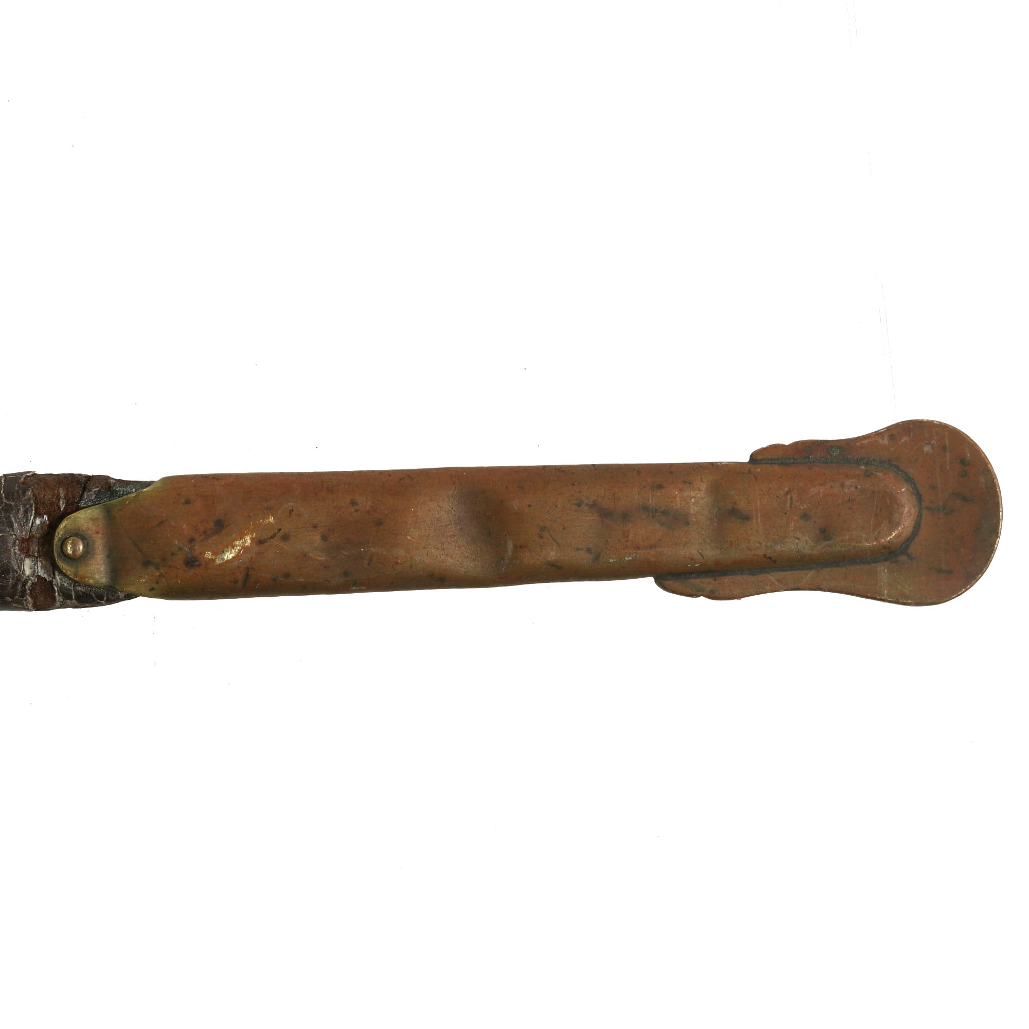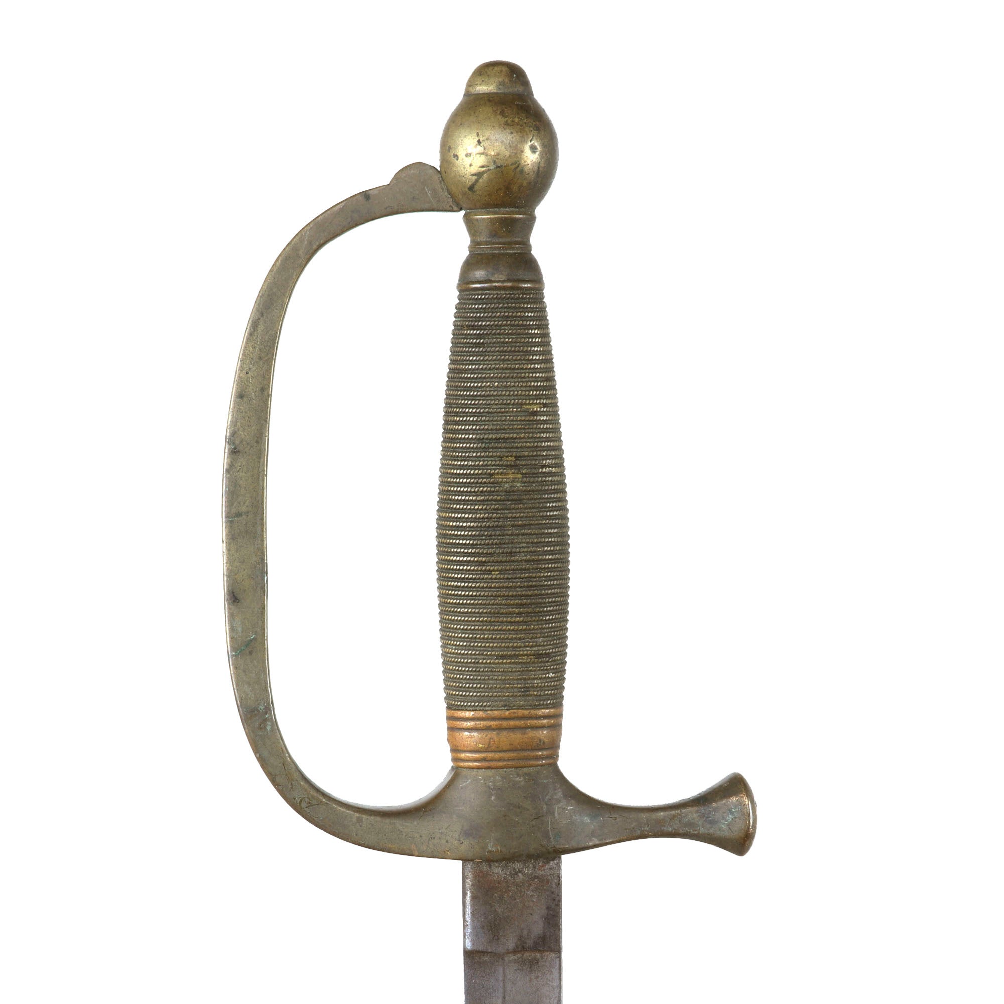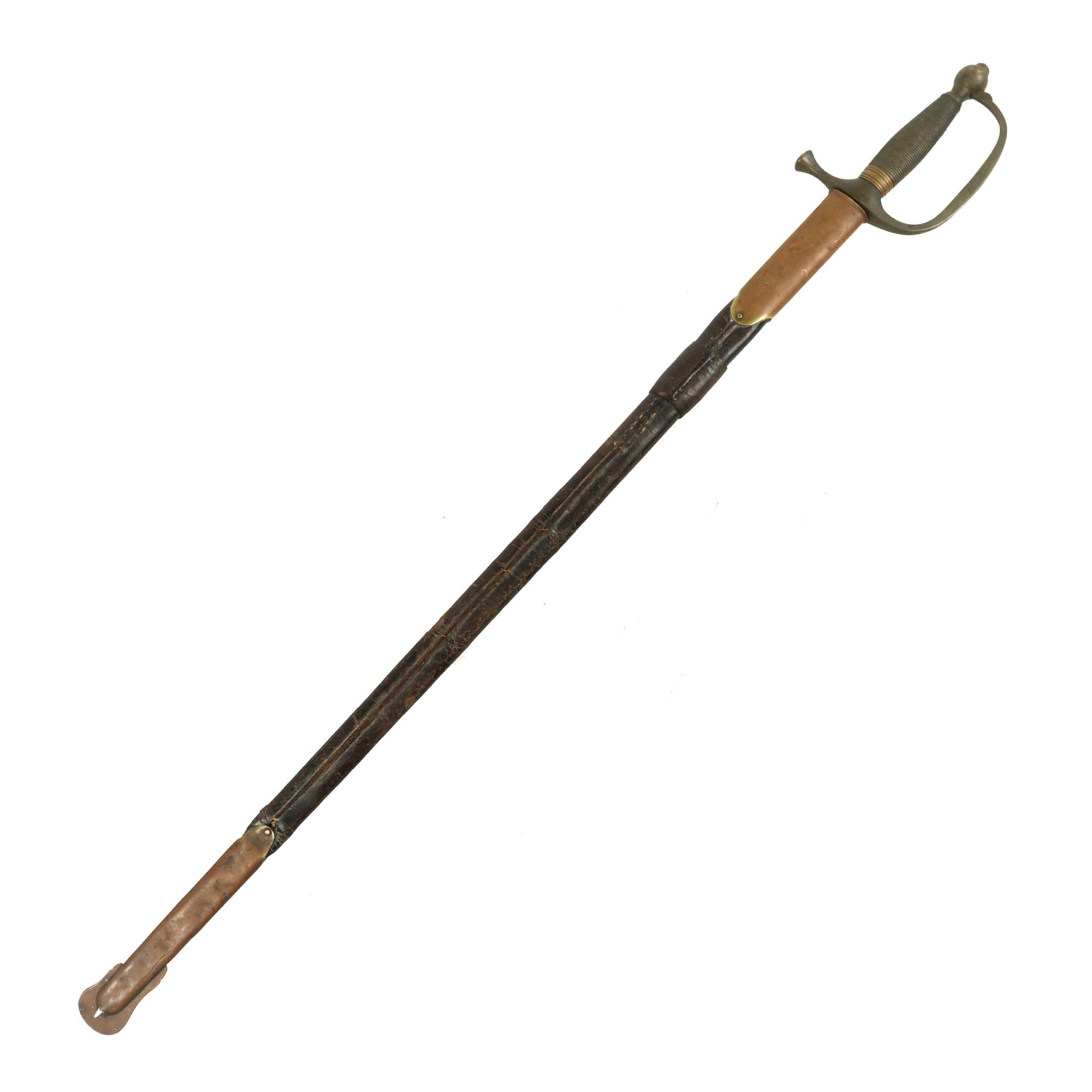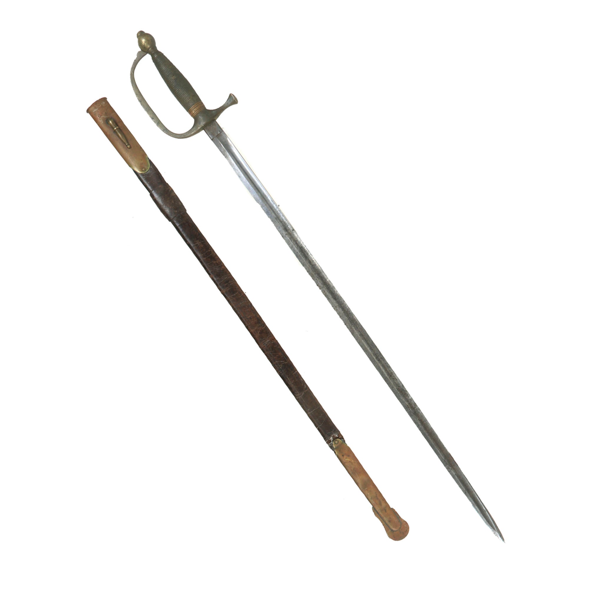 Original Item: Only One Available. This is a very nice well patinated example of a U.S. Civil War issue Model 1840 Non-Commissioned Officer's sword with its leather scabbard. It was produced by Collins & Co of Hartford, Connecticut. The sword measures 38 1/2" overall, and has an all-brass hilt, with a "double scallop" cross guard, and a "D" hand guard enclosing the knurled hand grip. The sword comes with a complete leather scabbard.