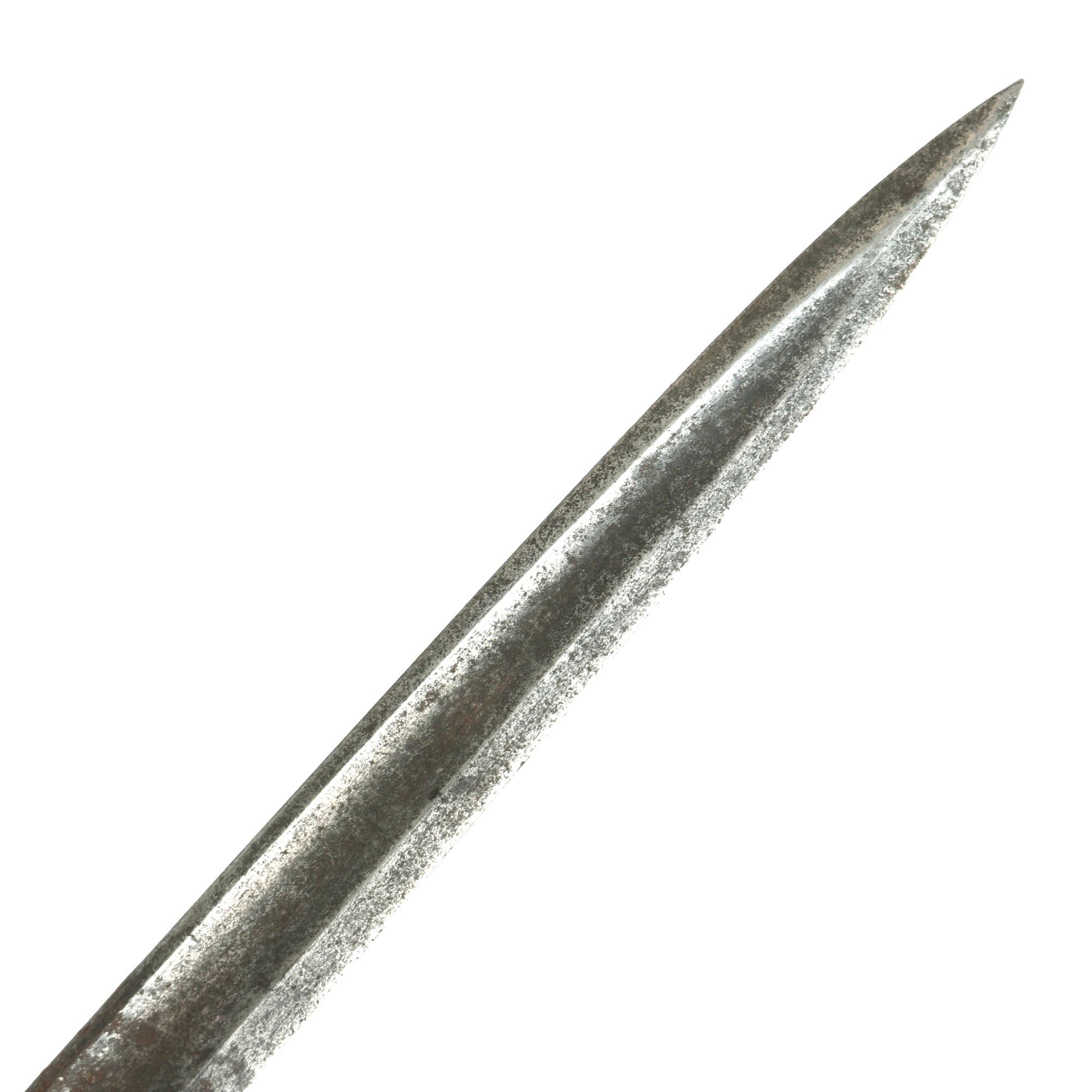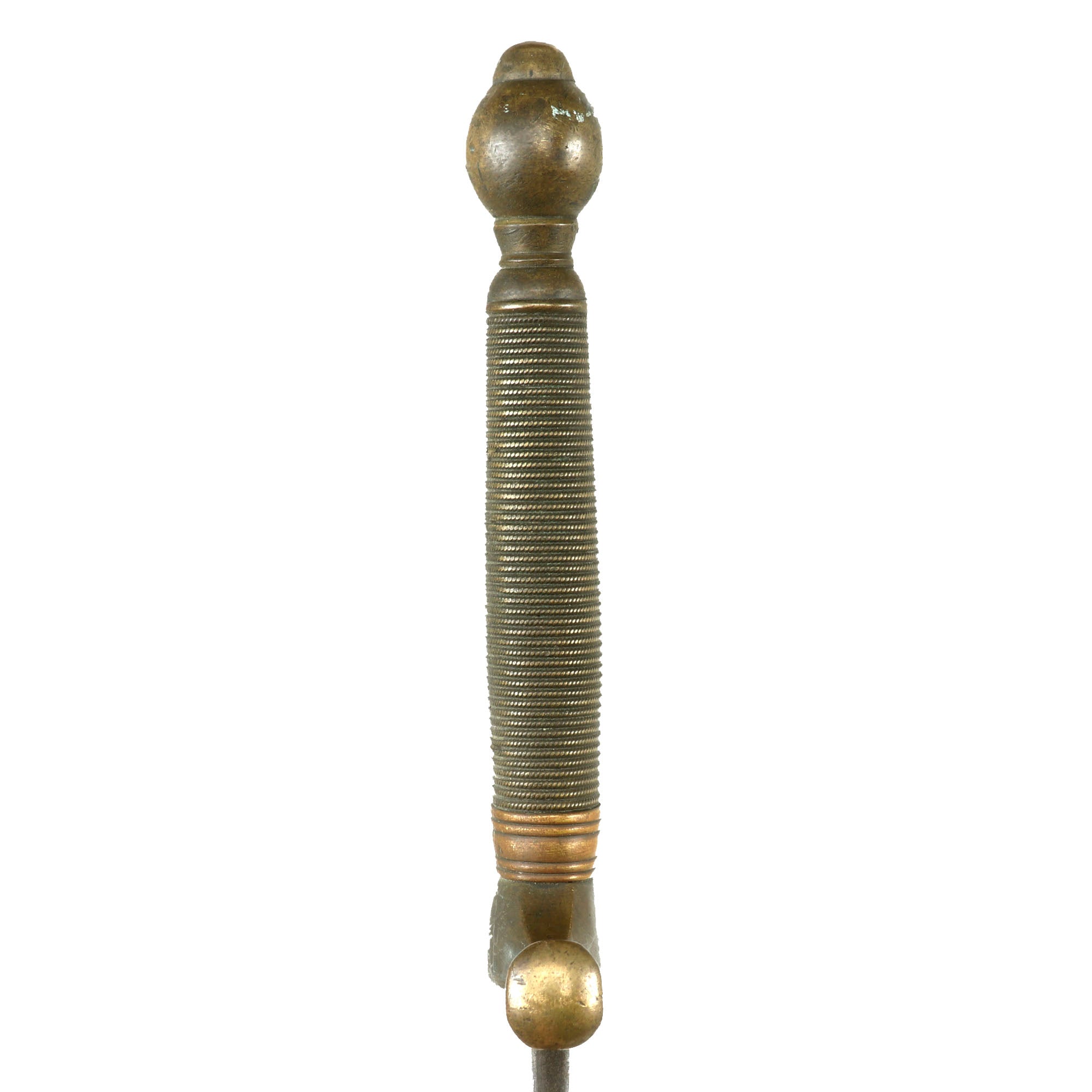 There are no inspector’s markings we can find. This sword is in good condition, with the expected wear from age, and little sign of field use. The blade shows heavy use and there is a heavy amount of pitting at the tip due to it missing the tip of the scabbard. The hilt is in great shape, and still has some gilding present on the blade side of the cross guard. The blade is tight to the hilt but the grip shifts a small bit.