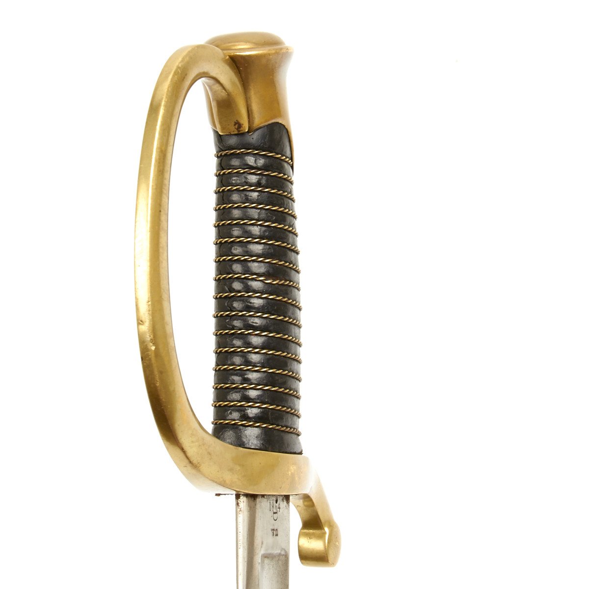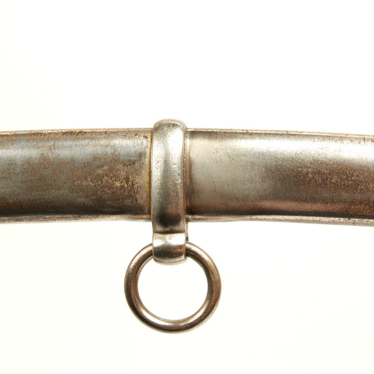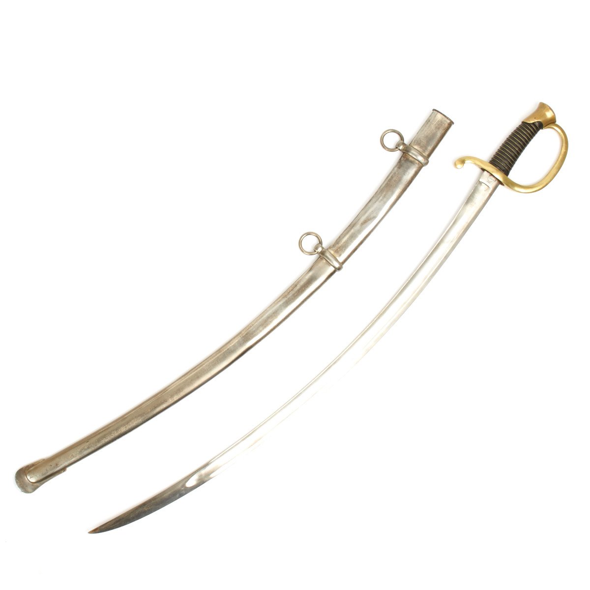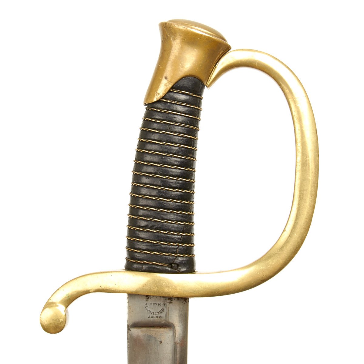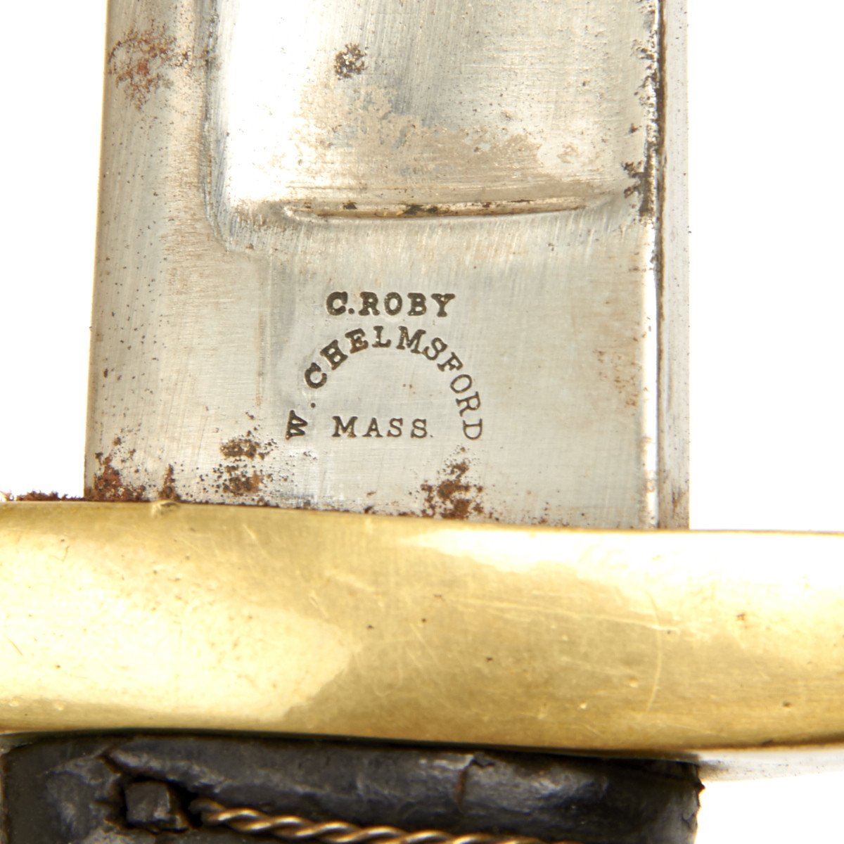 Original Item: Only One Available. This is a very nice example straight out of the family home where it was displayed for almost 150 years. Dated 1864 and maker marked C. ROBY, W. CHELMSFORD, MASS. on the 32" curved blade, sword measures 37.5" overall. Brass "D" guard enclosing brass wire bound leather hand grip. Complete with curved all steel scabbard with two hanging rings. This sword shows little use and absolutely no rust staining or pitting. This is an absolutely genuine U.S. Civil War issue 1840 artillery saber offered in pristine condition.