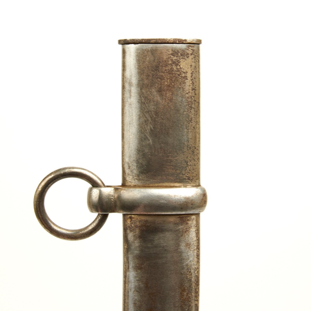 In the later Civil War-era examples from Ames and their competitors who also made them, the throats have been re-designed like those of the cavalry or dragoon sabers with a leather pad or washer acting as a sealer for the throat of the scabbard. These handsome sabers were also copied during the Civil War by several Confederate sword cutlers like Leech and Rigdon of Memphis, Tenn. and Boyle and Gamble in Richmond, Va. One would think there was probably little use of these in actual combat ( and one would be right! ); however there is a recorded case of a mounted charge by artillerymen armed with these acting as cavalry against Apaches in the Southwest ca. 1852 led by Lt. Ambrose Burnside of the 2d Artillery, who was wounded in the fray!