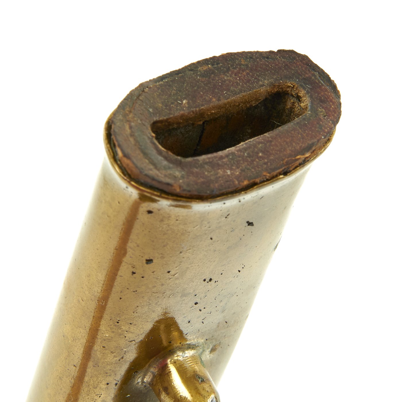 The scabbard is also in very nice condition, with a lot of the original black finish still on the leather. The scabbard is still straight and rigid, so the internal wooden support has not bee broken. There are some dents on the brass fittings, and also the leather blade buffer has become adhered to the end of the scabbard, so it is not on the sword anymore.