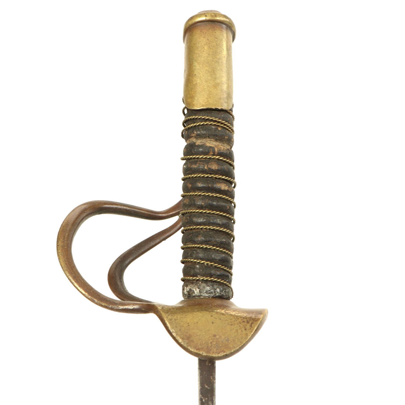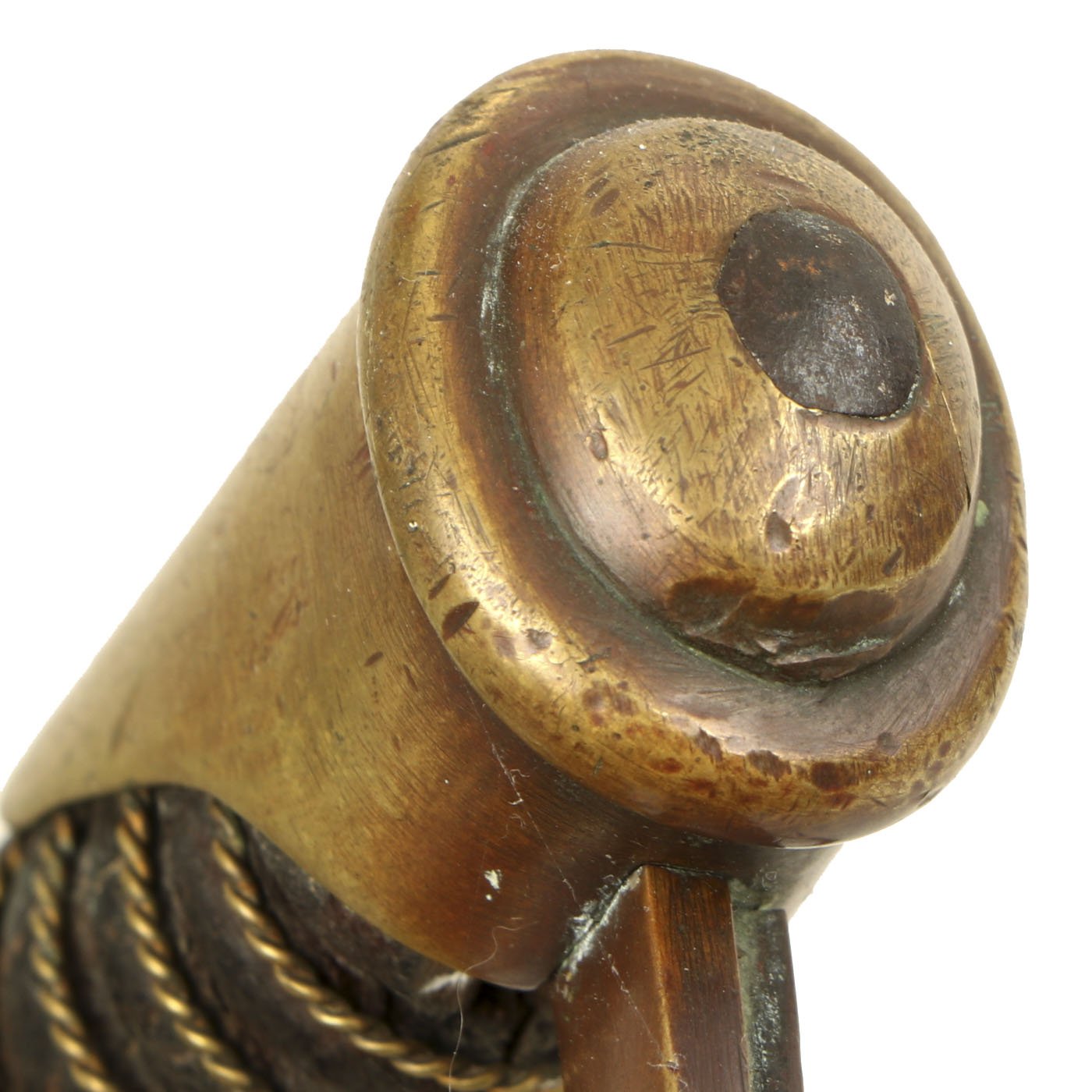The sword has all brass mounts, a wood with leather wrapped sword grip, and a nice steel scabbard. The leather of the grip is partly intact, as the leather grip wrapping has unfortunately deteriorated and partly fallen away. The twisted brass wire wrapping is fully intact, though it is loose on the grip due to the leather shrinking. The leather blade buffer is intact and in great shape, and the guard is tight on the blade, with no wobble.
