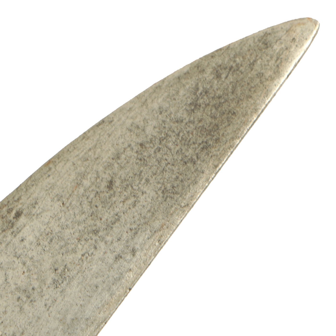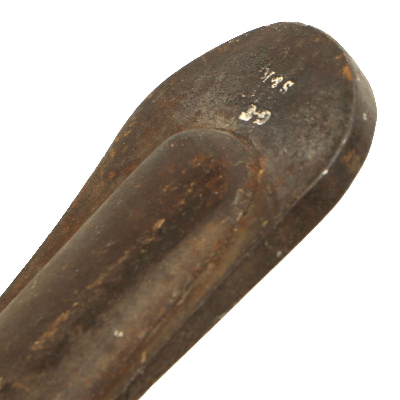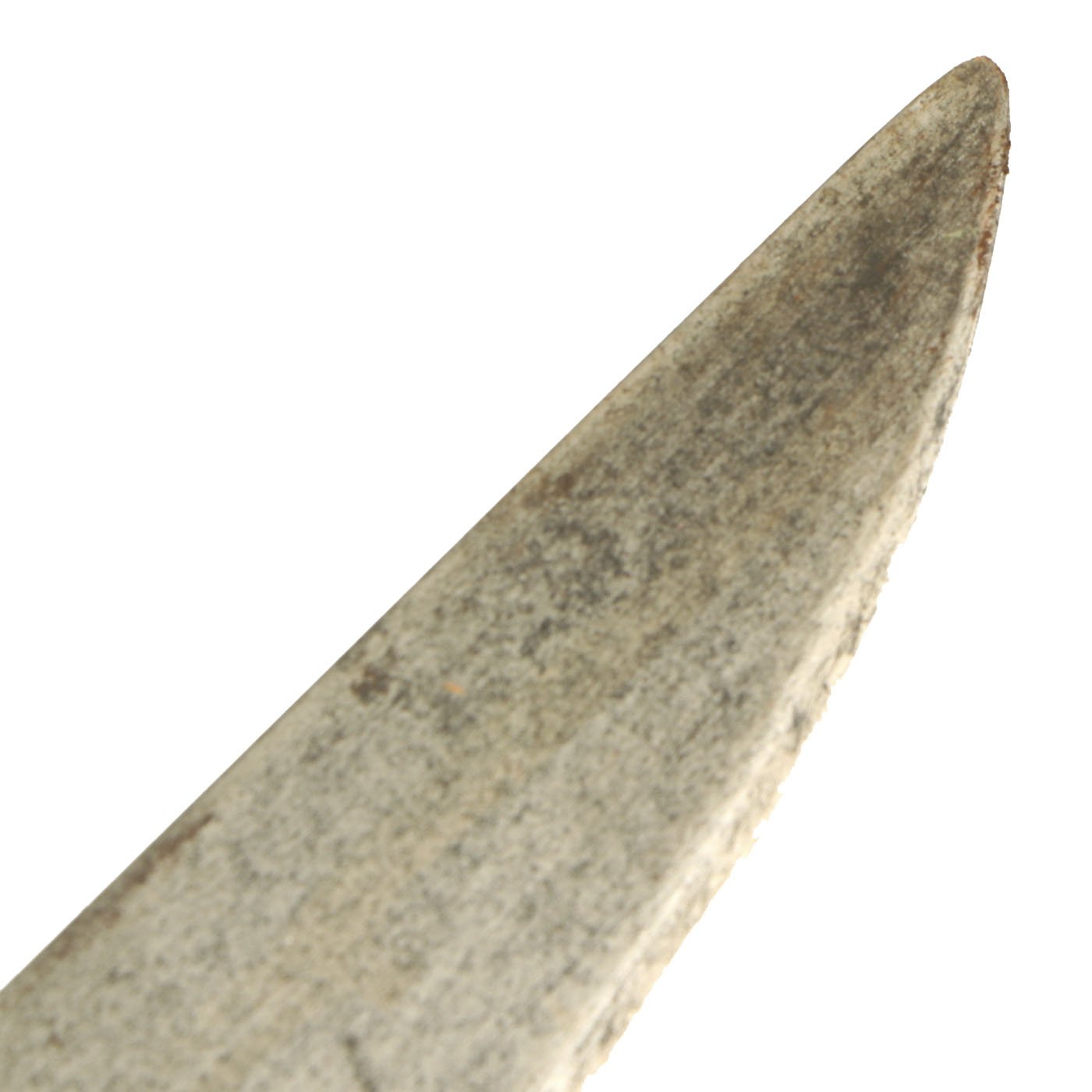 It comes complete with its heavy steel scabbard, which is in very good condition. It has a nice oxidized patina with light peppering, and no major dents or other issues. It does have markings on the drag, G-T as well as S & K, indicating manufacture by Schnitzler & Kirschbaum of Solingen, Germany. This company was directly contracted by the U.S. government, as well as by many retailers during the war.