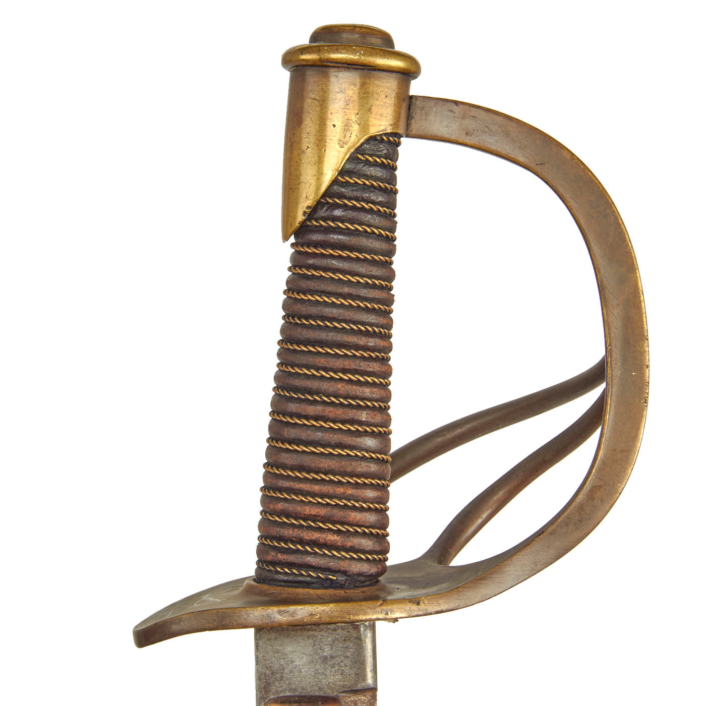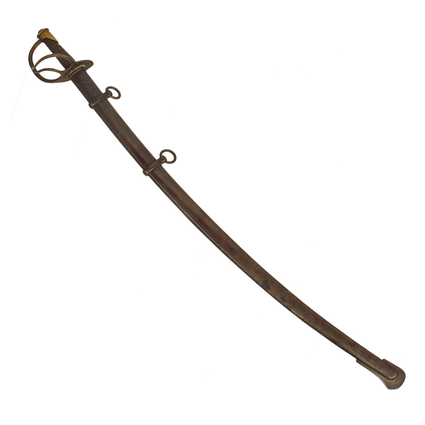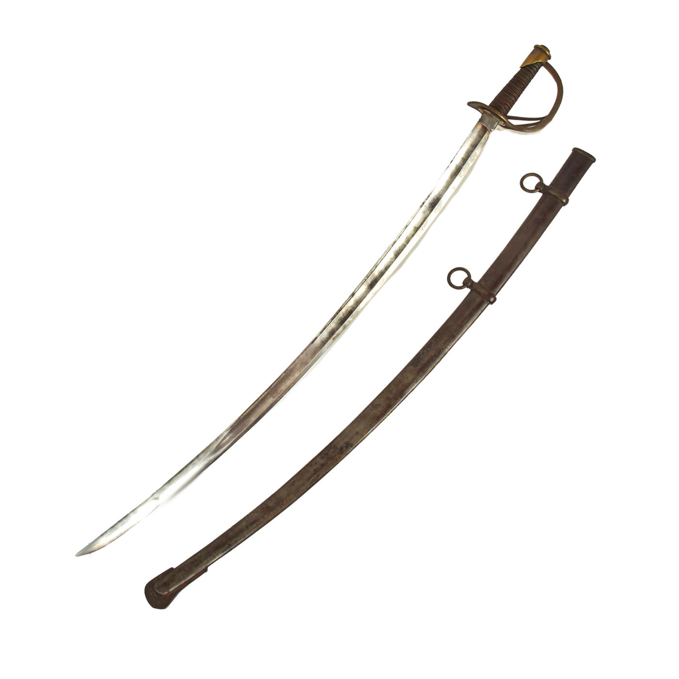 This sword conforms closely to the M-1840 U.S. Heavy Cavalry pattern, and is approximately 41 inches in overall length, about 1-2 inches shorter than typical. It has a very nice, untouched, brass wire bound leather grip which is in solid condition, with much of the leather still displaying a lovely brown color. The hilt bears a brass three branch handguard fitted to a wicked heavy curved blade measuring 35”, coming complete with its heavy all steel scabbard.