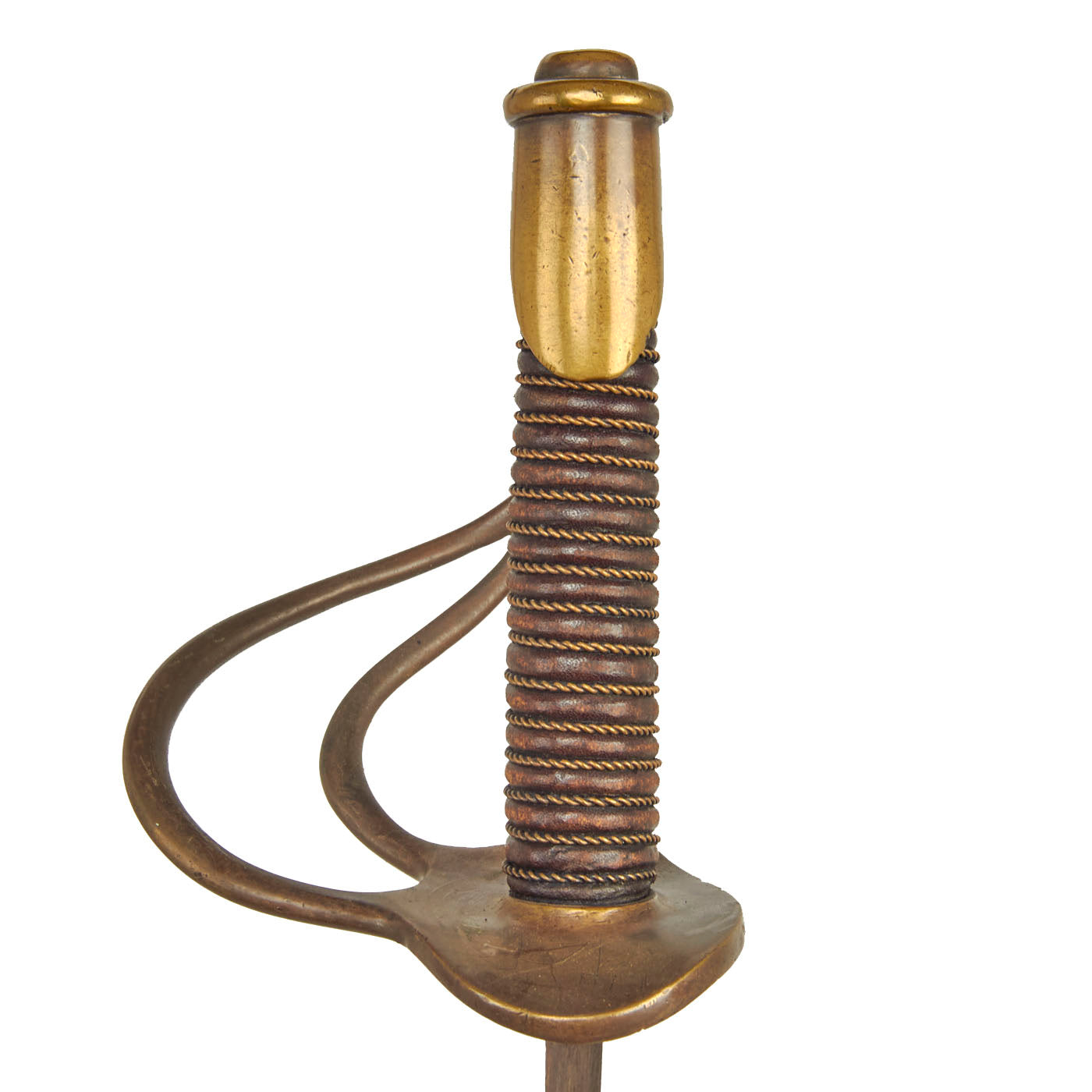 The Model 1840 Cavalry Saber was based on the 1822 French hussar's sabre. Unlike its replacement, the Model 1860 Light Cavalry Saber, the M1840 has a ridge around its quillon, a leather grip wrapped in wire (rather than grooves cut into the wooden handle) and a flat, slotted throat. It is 44" long with a 35" blade and weighs roughly 2.5 lbs.