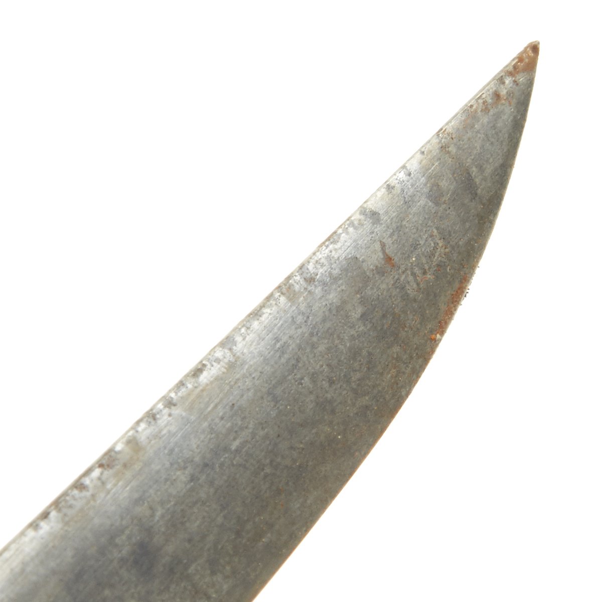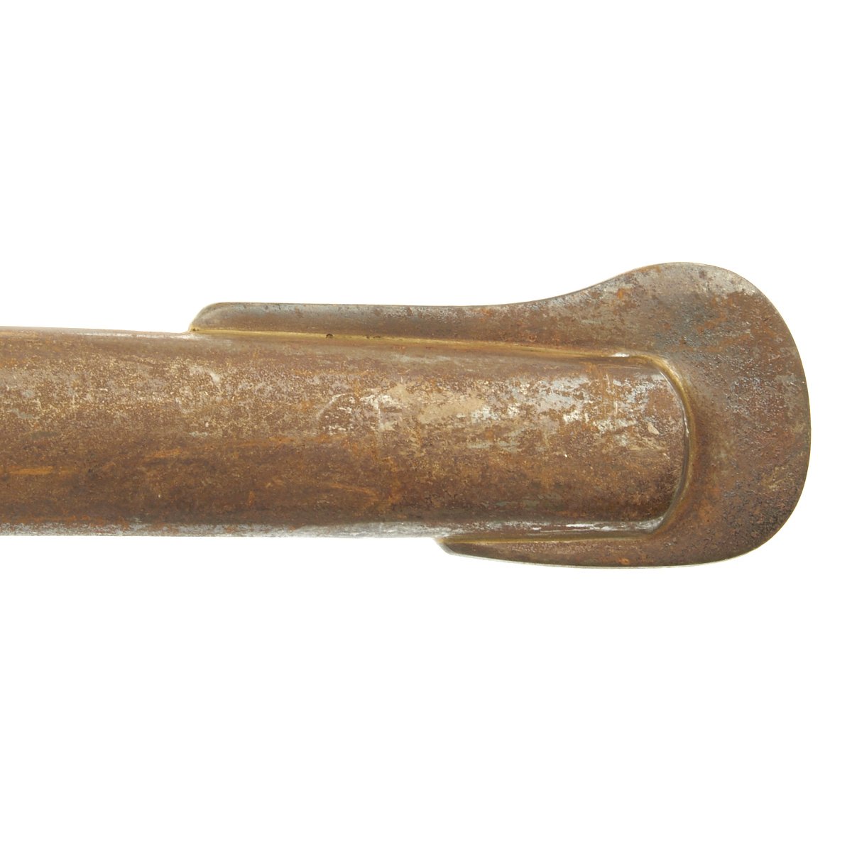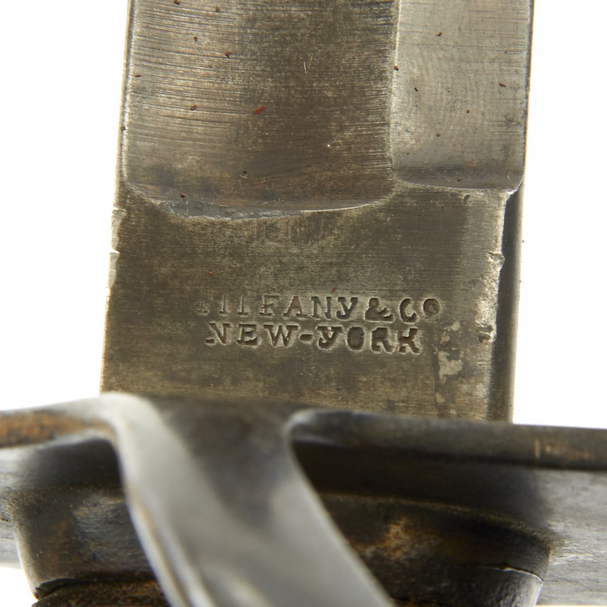 Standard features include a relatively straight wooden handle covered with a leather and wire grip, a hilt with three branches, and an unadorned rounded pommel cap and guard. The steel blade has flat back with narrow and wide fuller stopped at the ricasso, typical of the pattern. The blade is in very good condition, having been stored inside the scabbard for decades. The Tiffany hilt and pommel are iron, a unique option offered by of this retailer. Tiffany sold these swords to state or local militia units and federal officers for private purchase.