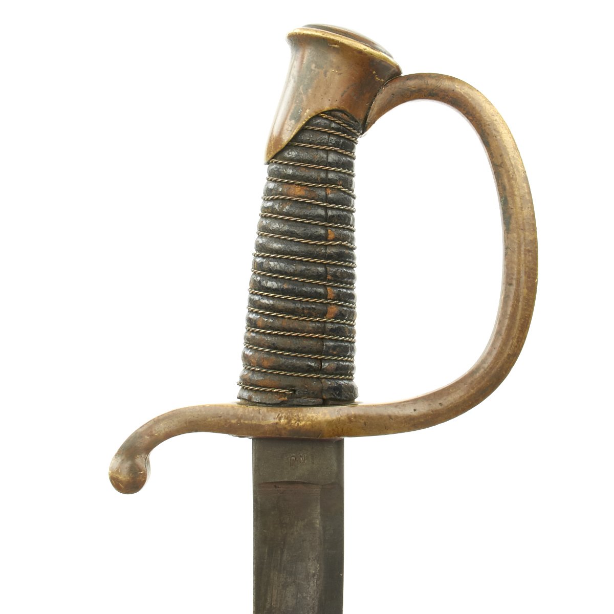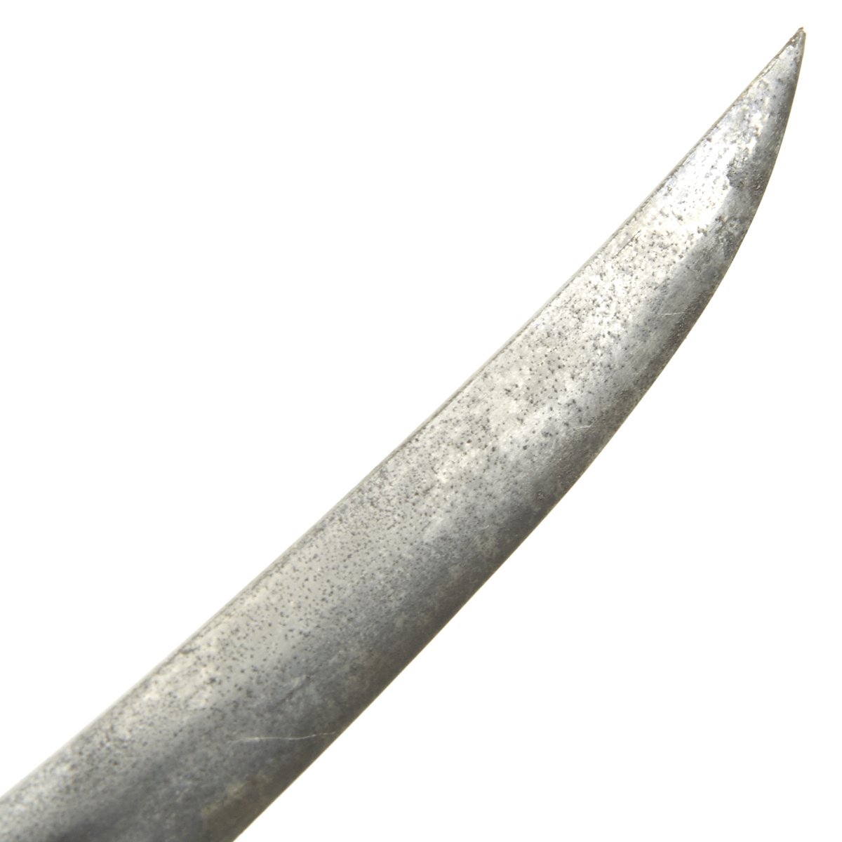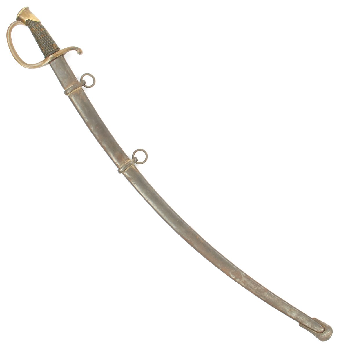 The sword has a 31 1/4" curved blade, and measures 37" overall. The brass "D" guard encloses a brass wire bound leather hand grip, which is somewhat deteriorated due to age and use. The blade does not show much use, and still has the original issue "blunt" edge. It has a nice peppery patina with light surface oxidation, which we have left intact. Comes complete with curved all steel scabbard with two hanging rings. Scabbard is in very good condition, with no dents, and the usual surface rust and patina of age seen on a sword that is 150 years old.