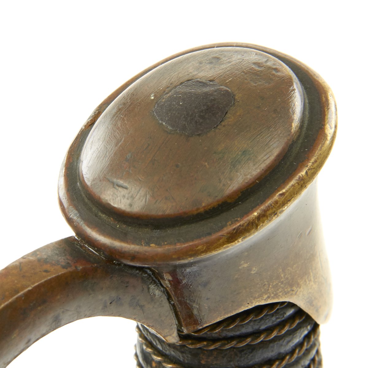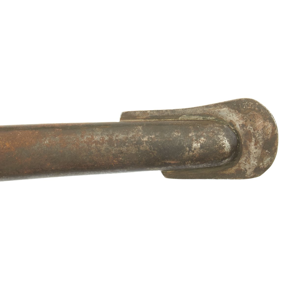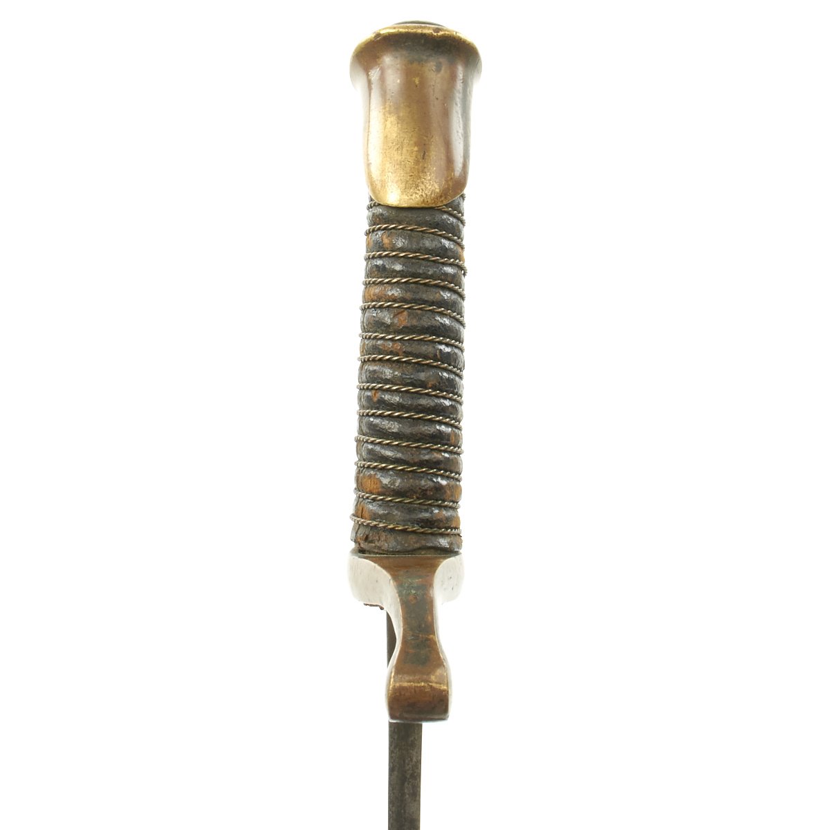 The sword has a 31 1/4" curved blade, and measures 37" overall. The brass "D" guard encloses a brass wire bound leather hand grip, which is somewhat deteriorated due to age and use. The blade does not show much use, and still has the original issue "blunt" edge. It has a nice peppery patina with light surface oxidation, which we have left intact. Comes complete with curved all steel scabbard with two hanging rings. Scabbard is in very good condition, with no dents, and the usual surface rust and patina of age seen on a sword that is 150 years old.