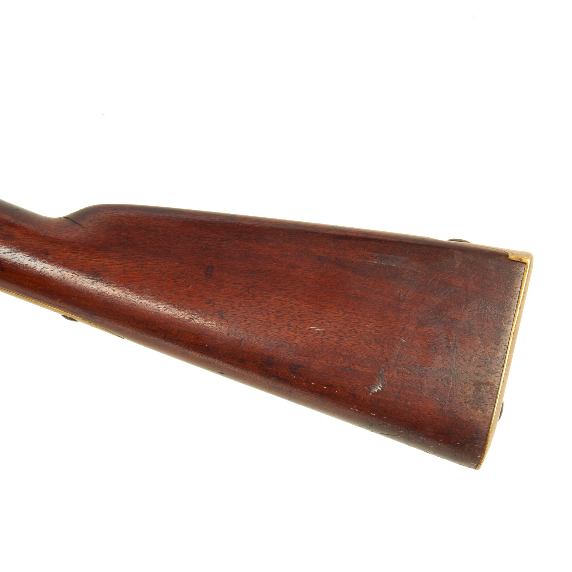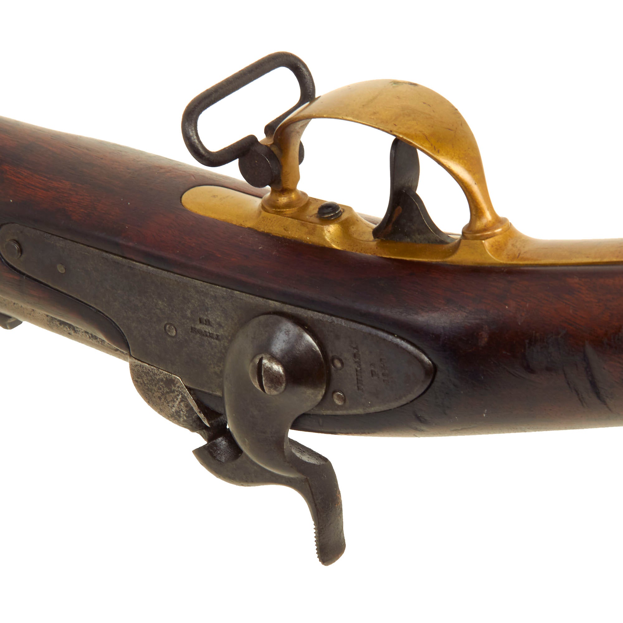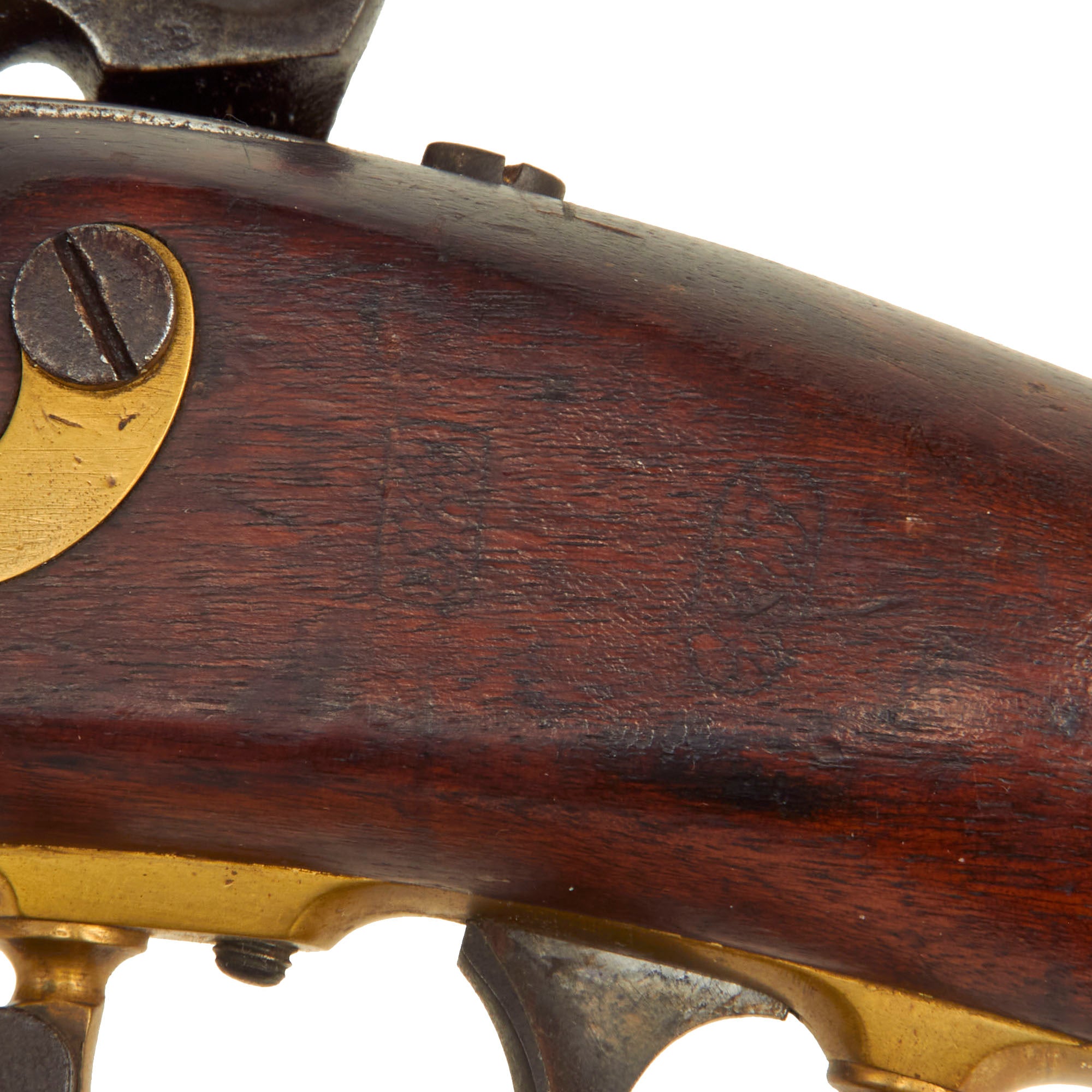 These were often dated on the barrel, however there is no date we can see currently, and the other proof marks are missing as well, so they must have been worn away during service. The left side of the stock still bears the original inspection cartouches, though they are a faint. However, we can make out one, which is definitely W.A.T., indicating inspection by Captain William Anderson Thornton, who worked from 1841 to 1861, inspecting various small arms, and seen on other Tryon made examples of the M1841.
