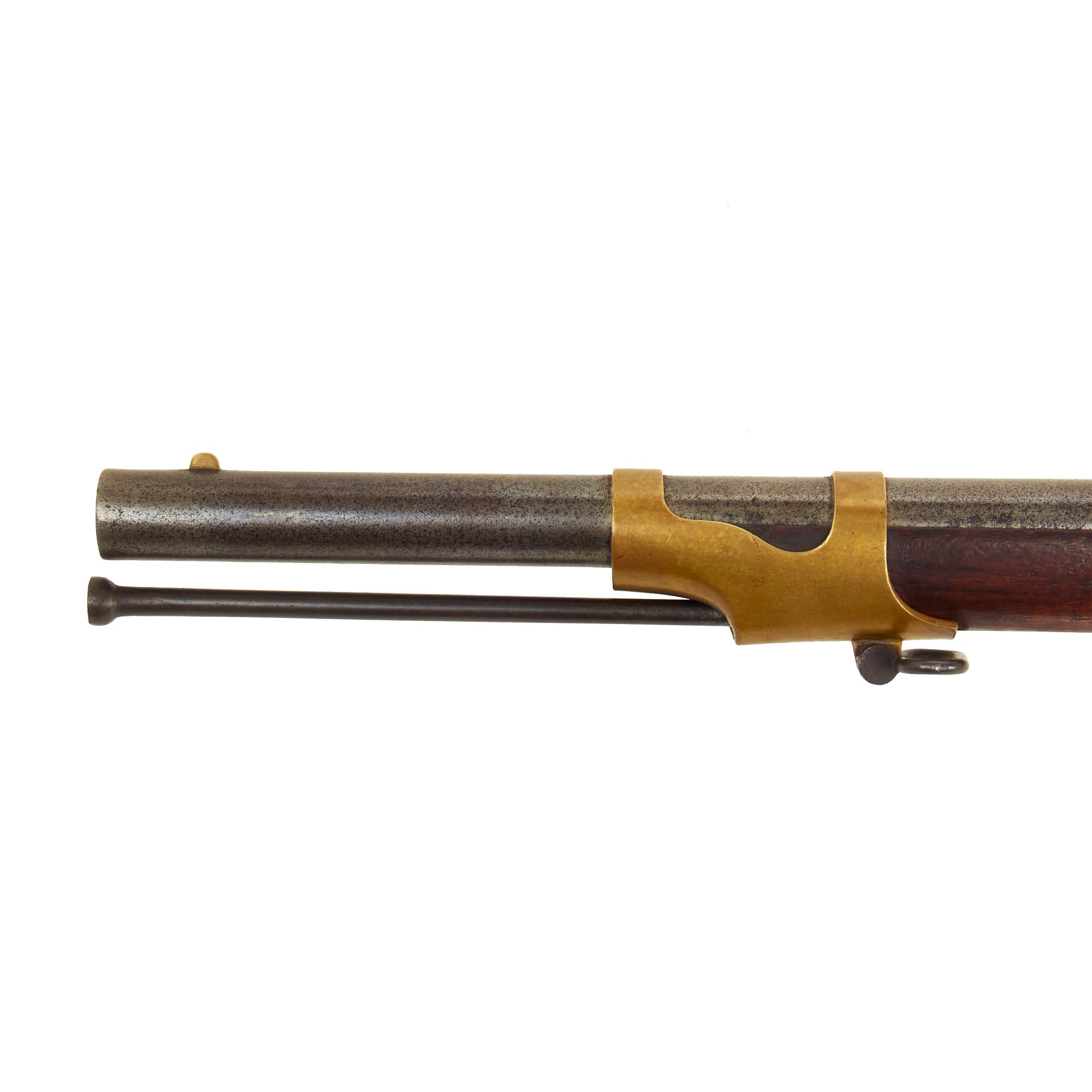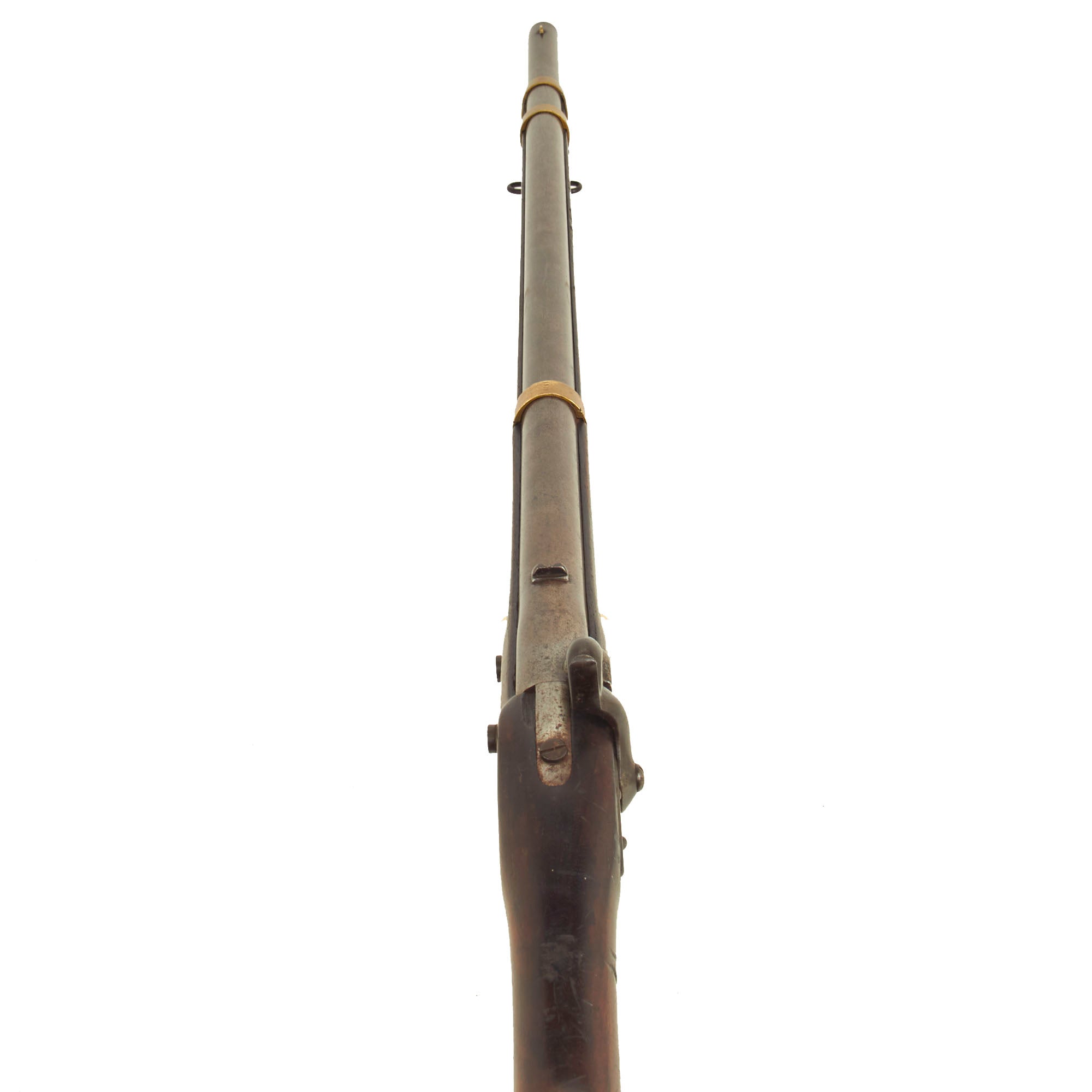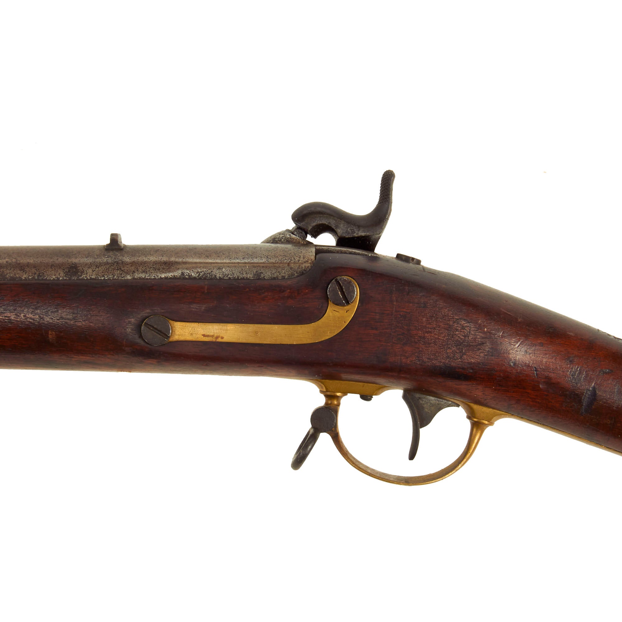 The stock on this rifle has a lovely red brown color, and has a very nice finish, with the expected wear from age. There are no cracks or other major damage that we can see. Both sling swivels are still present and movable. The cleaning rod on this example has been replaced, and it is rather crude, and typical of those used by Confederate forces during the U.S. Civil war. It has a properly threaded end, and fits the gun well. The lock functions correctly, holding at half cock and firing at full. We checked the bore, and the rifling is still clear, showing moderate wear from service, with dirt and fouling in the grooves. Previous examples we have had were so used that they were almost smoothbore, so this is definitely a very good example!