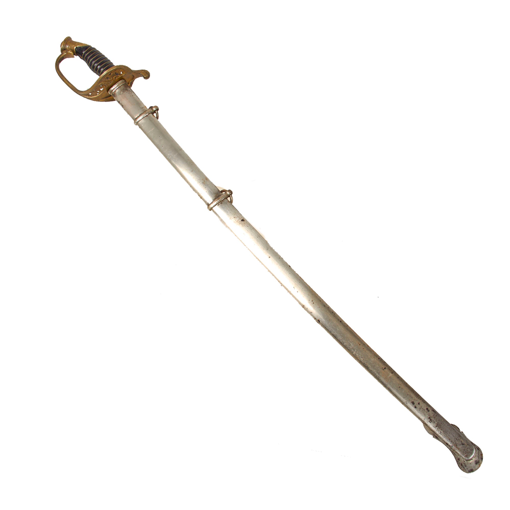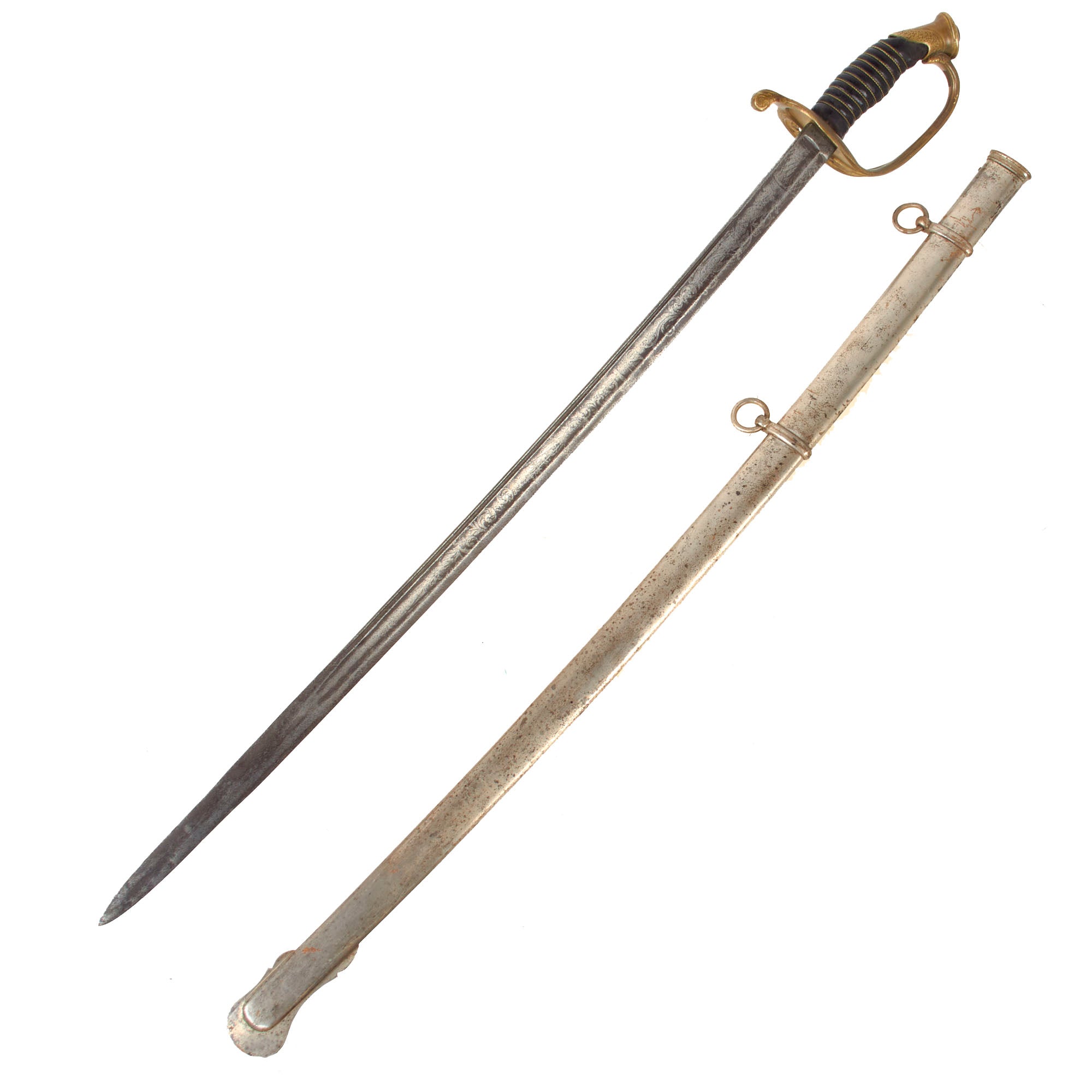 The sword comes in its original plated steel scabbard, with both mounts and suspension rings retained. There is heavy wear to the plating but there is a nice patina overall.