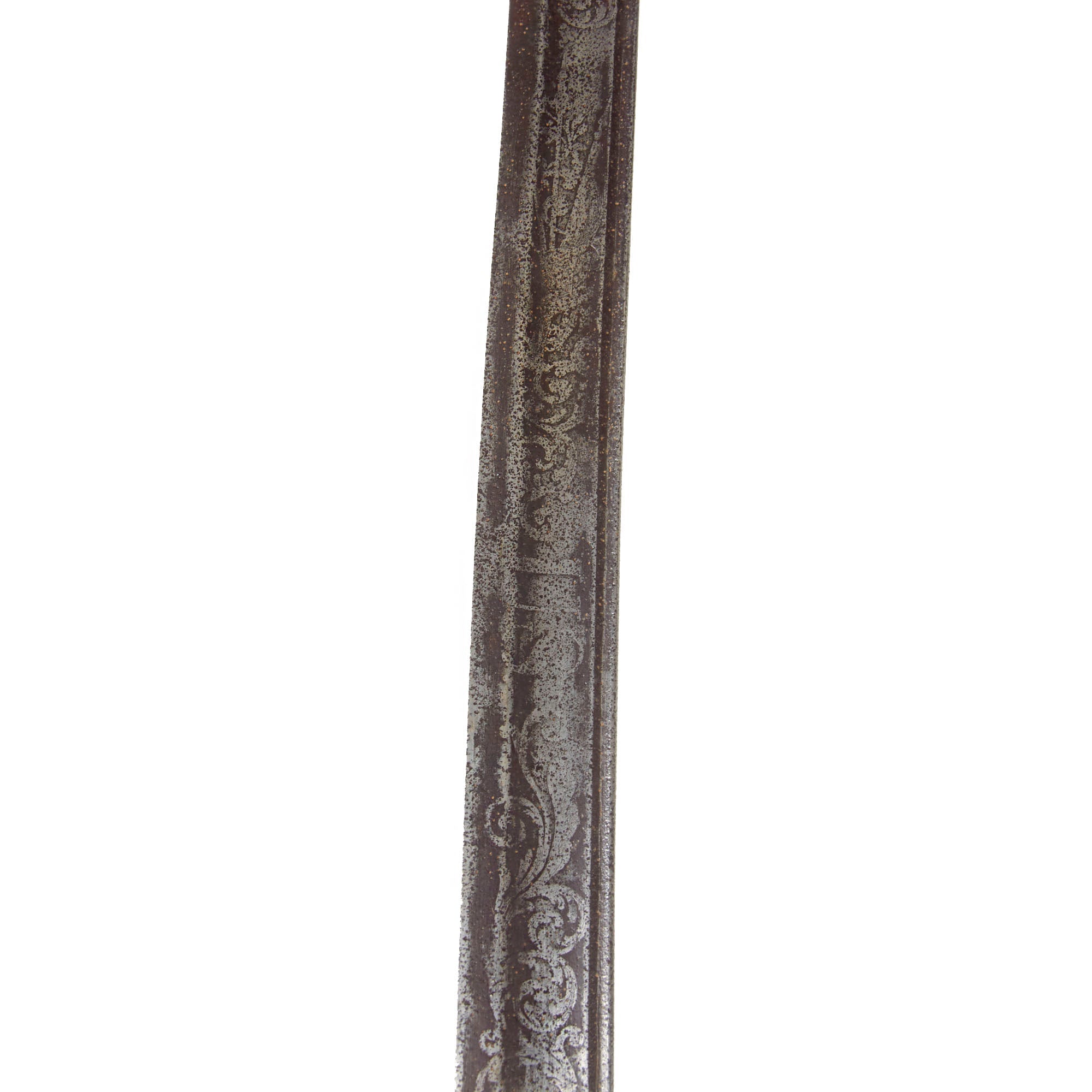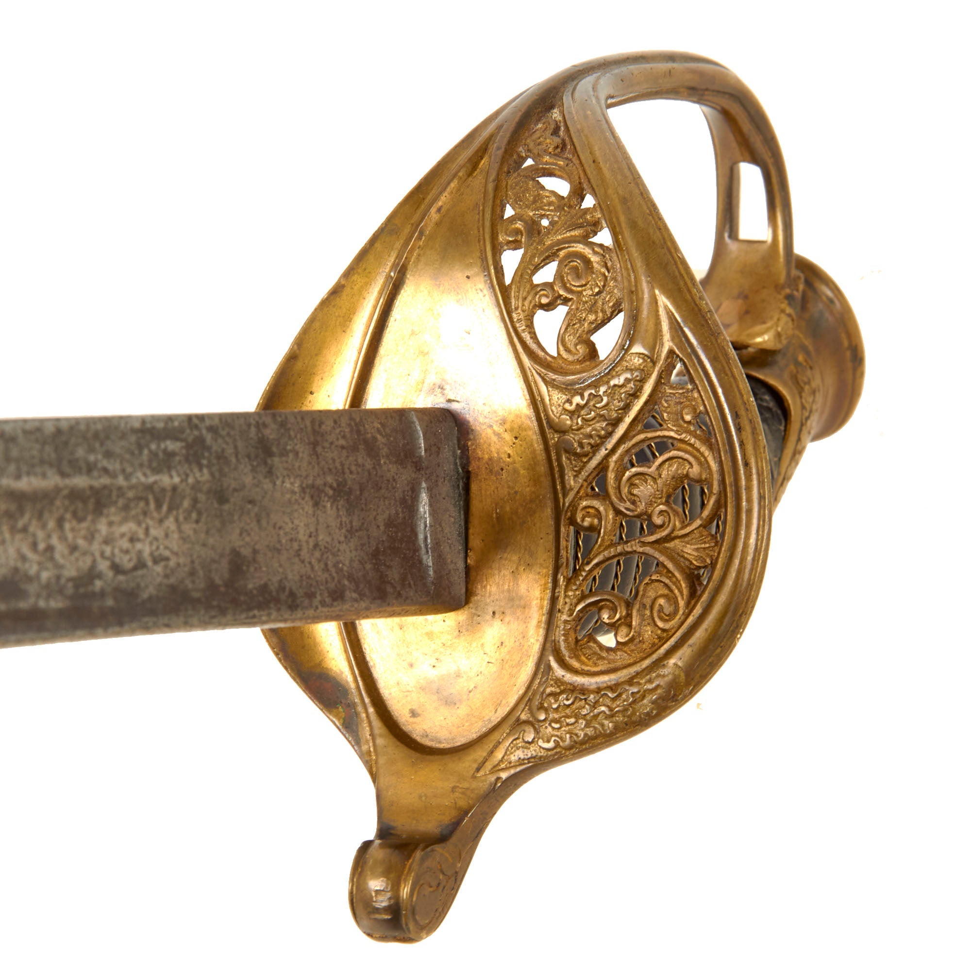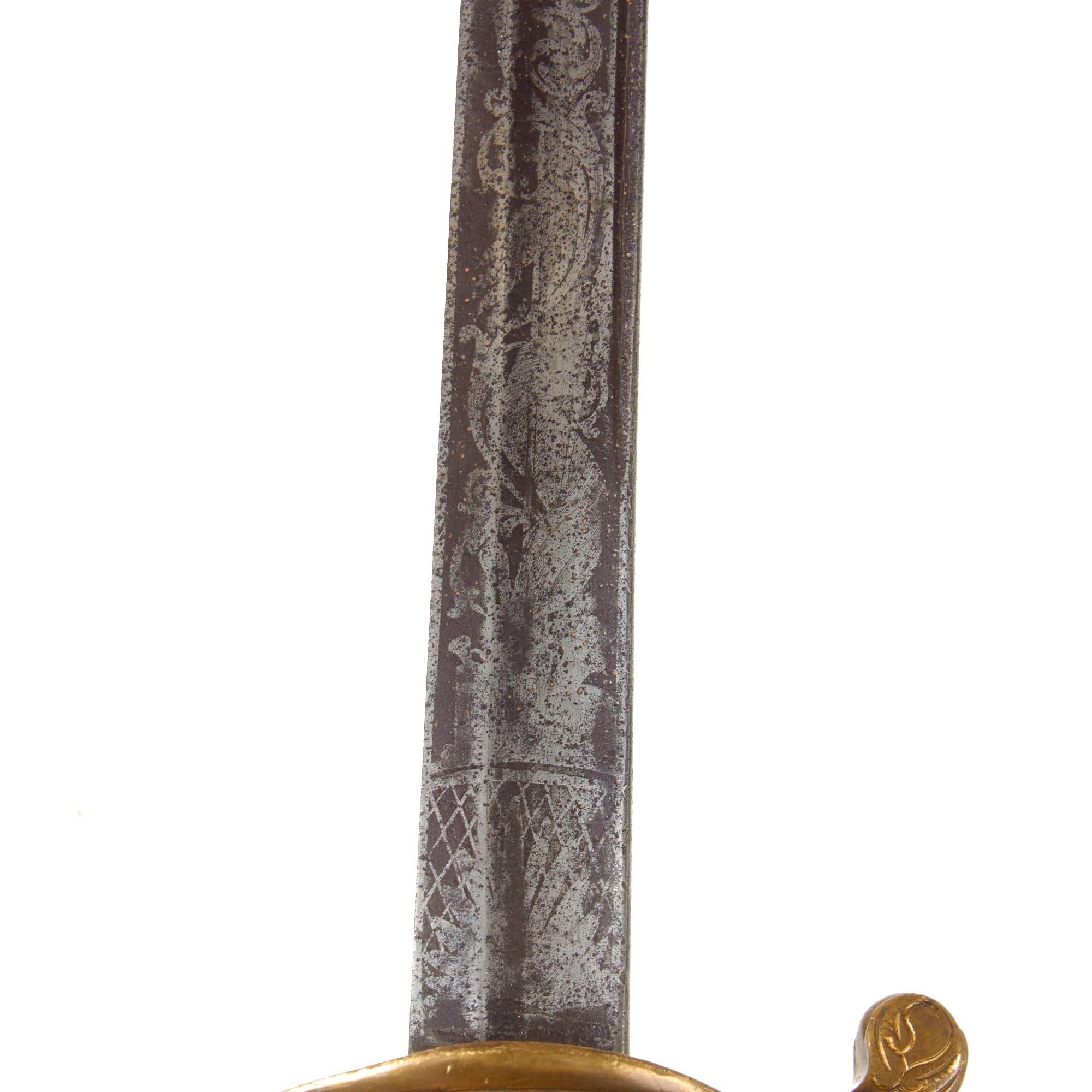 The slightly curved blade of 30 1/4 inches is in good shape, with some lovely etching in the middle, with “U.S.” on one side, and a stunning military motif on the opposite side. Truly a lovely blade, with a nice aged dark patina, which is marked on one side with the maker information: