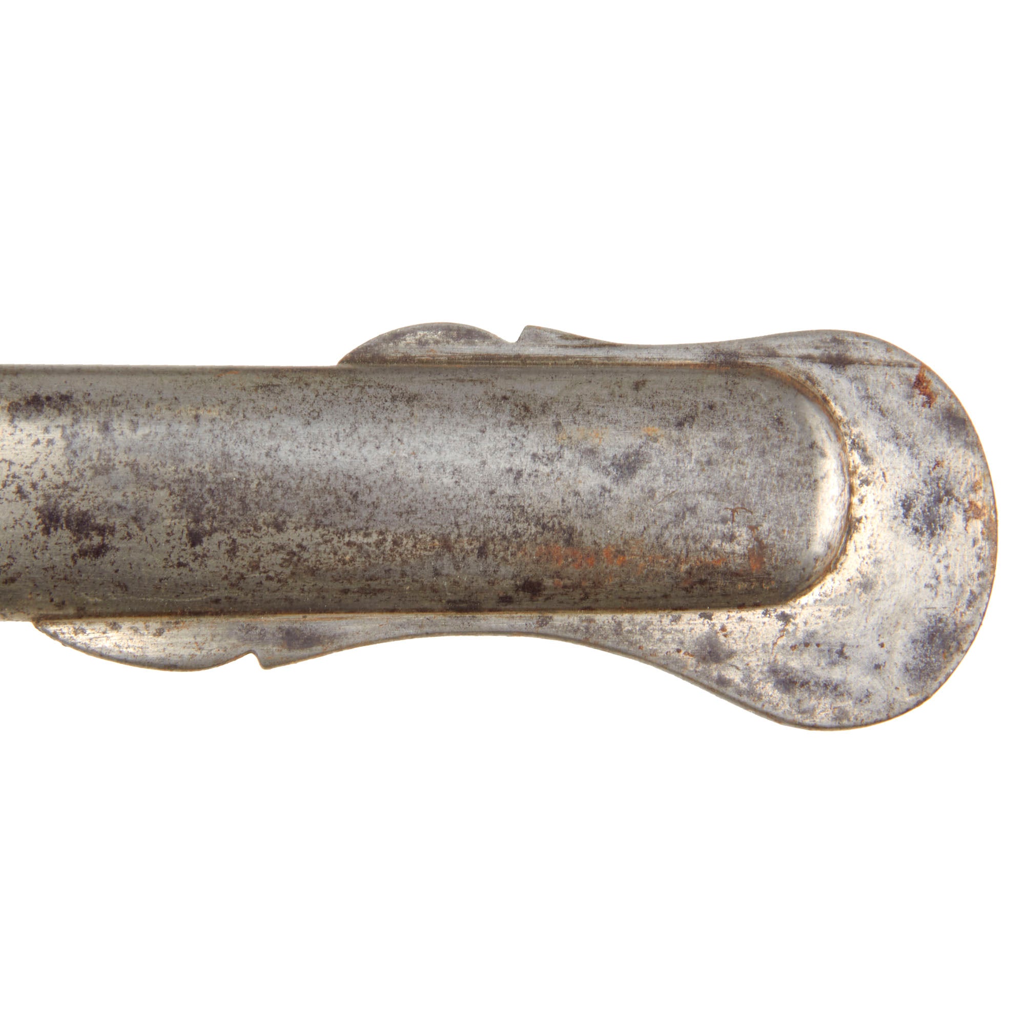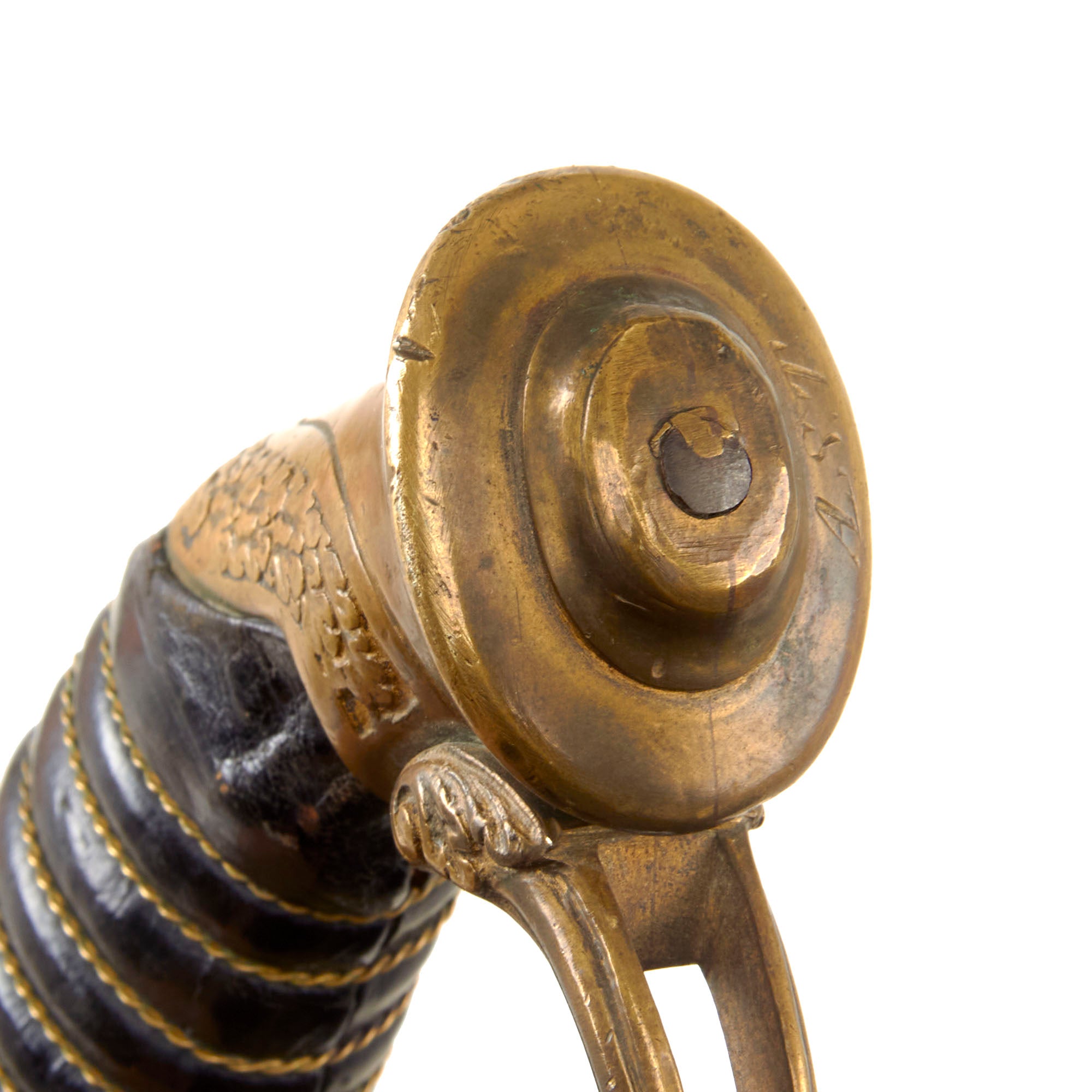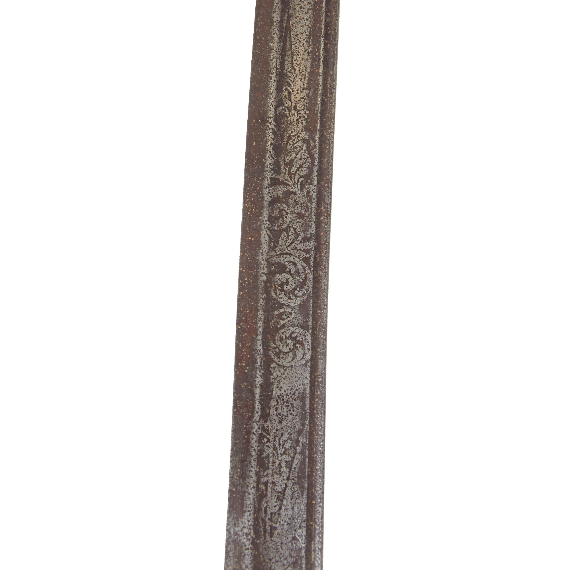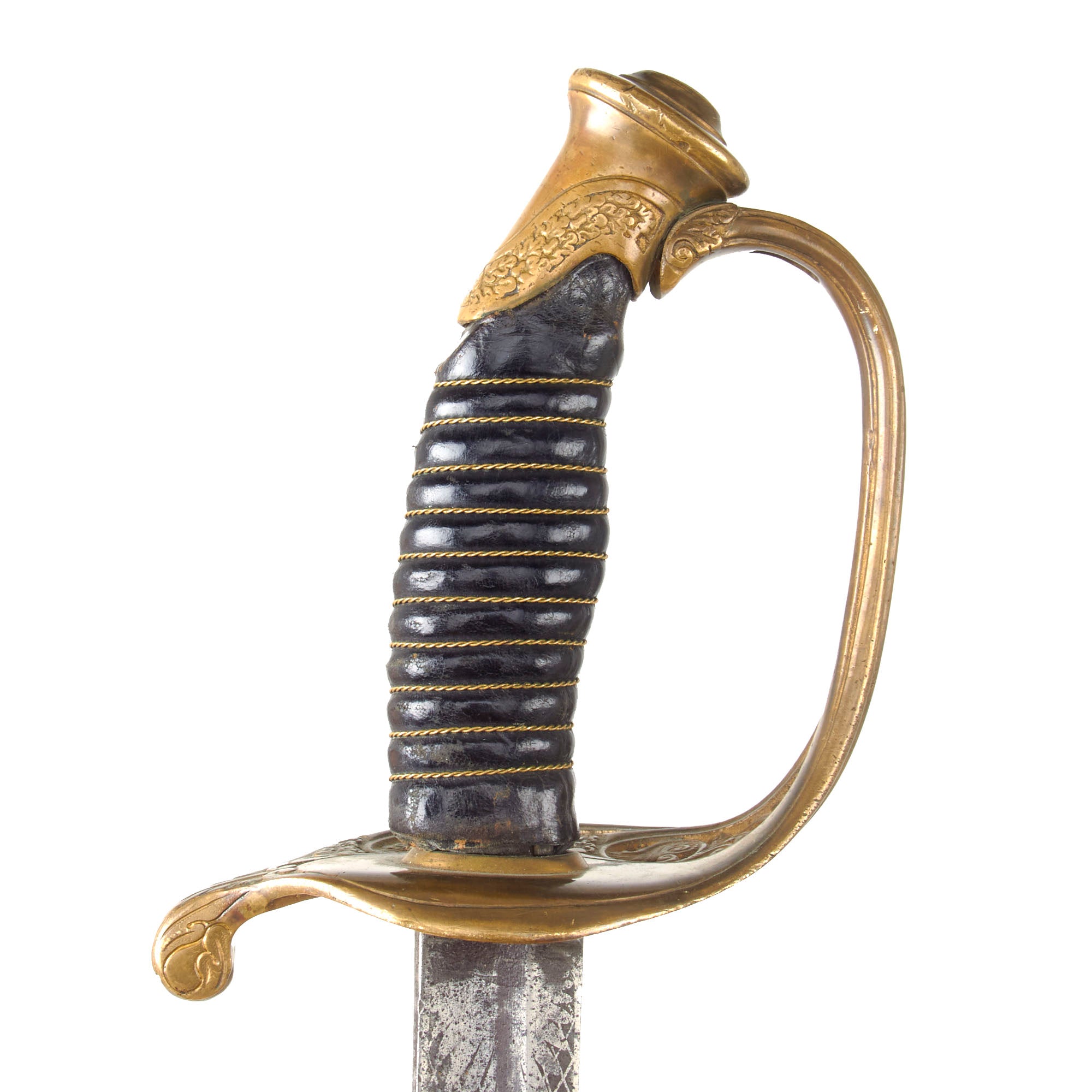 The slightly curved blade of 30 1/4 inches is in good shape, with some lovely etching in the middle, with “U.S.” on one side, and a stunning military motif on the opposite side. Truly a lovely blade, with a nice aged dark patina, which is marked on one side with the maker information: