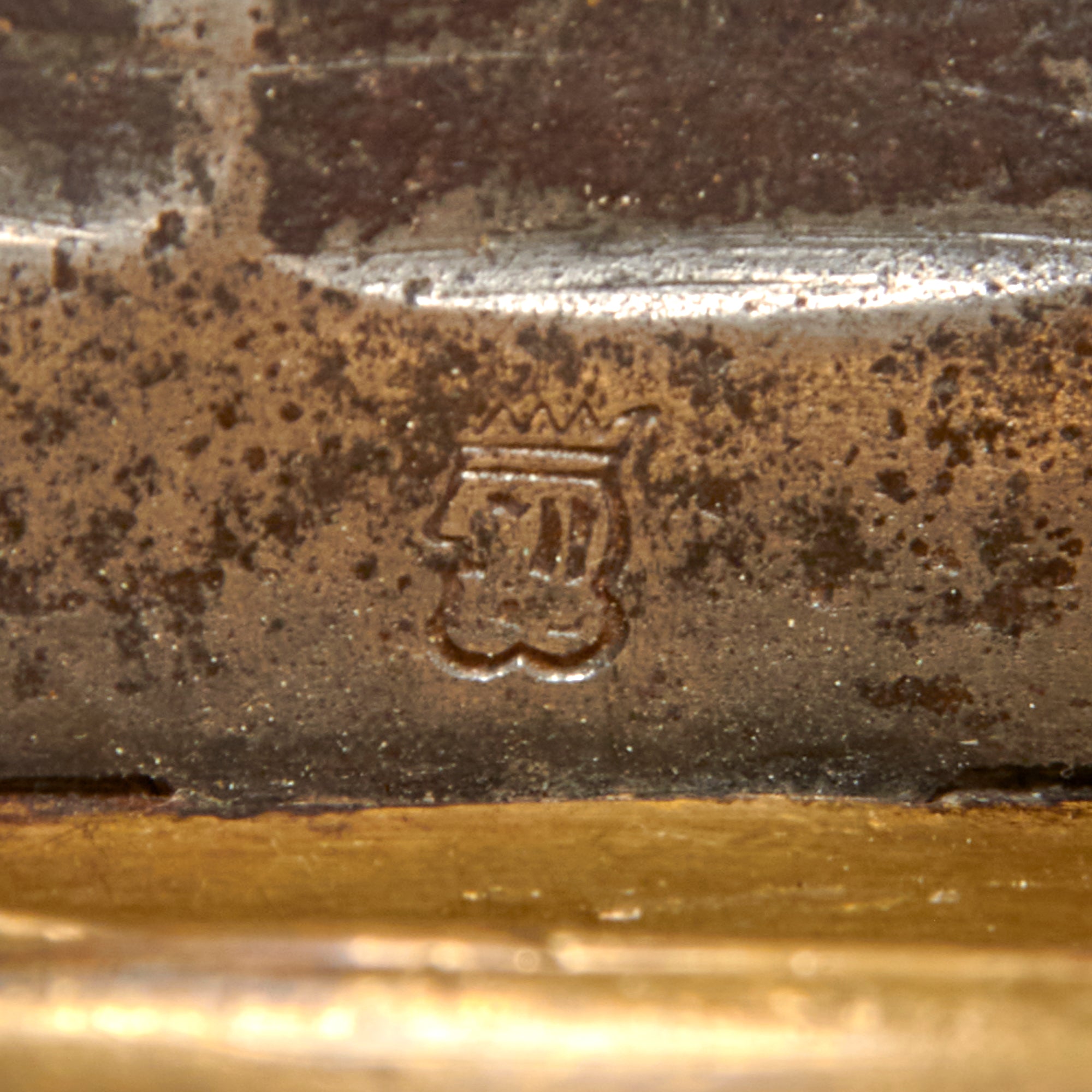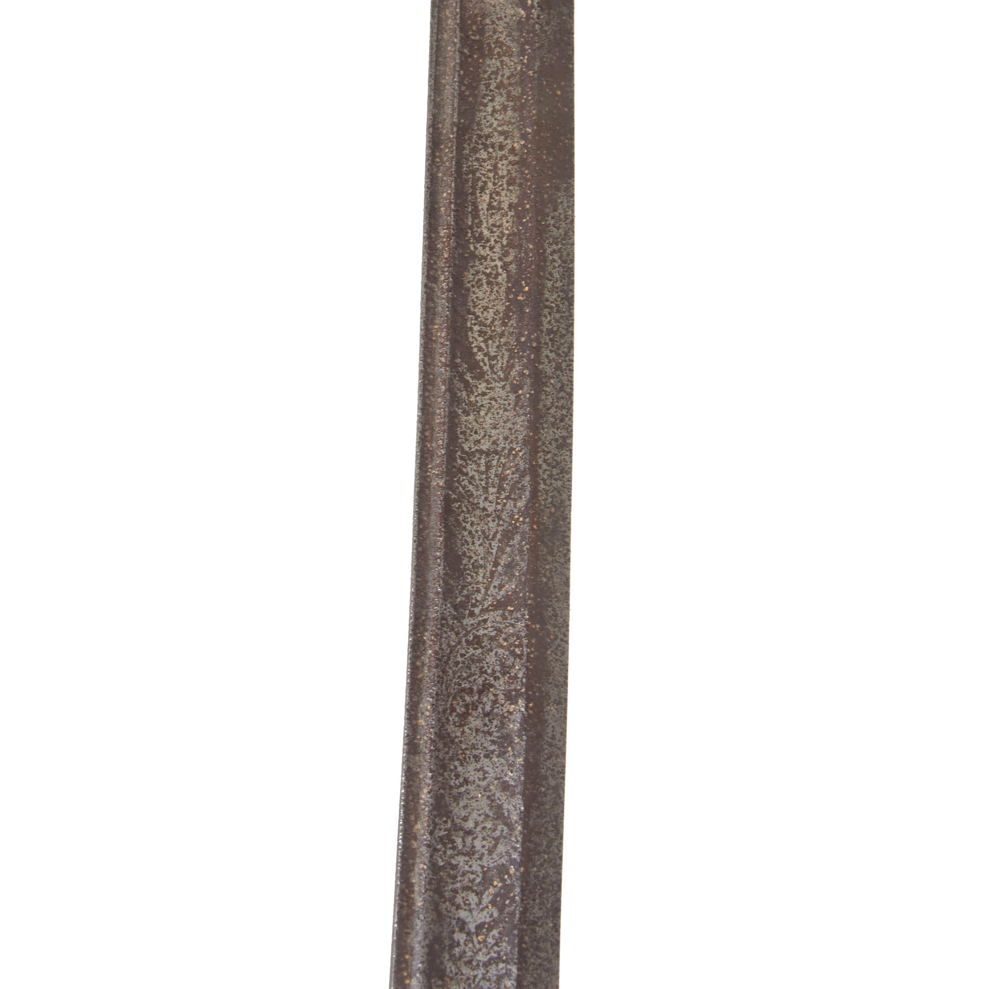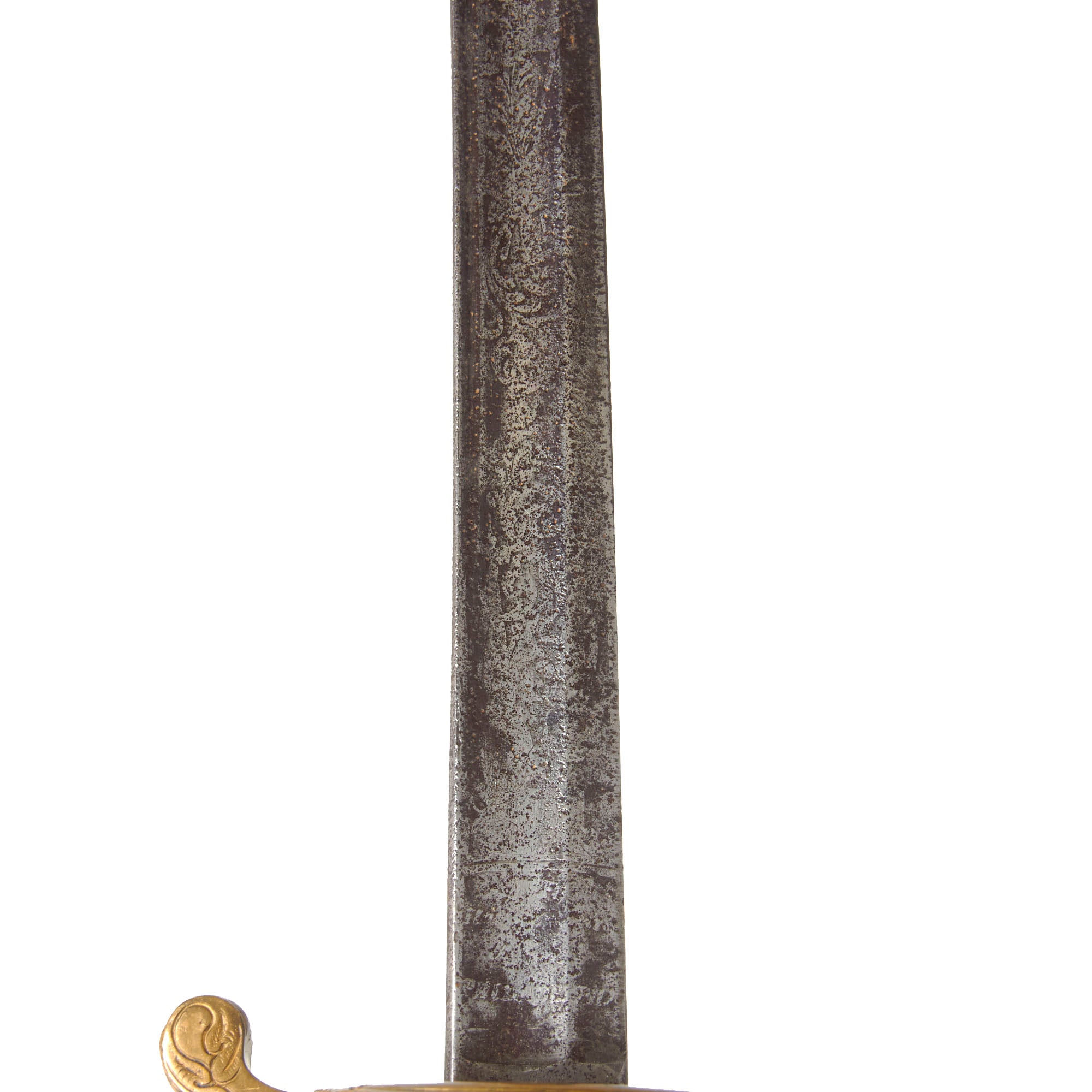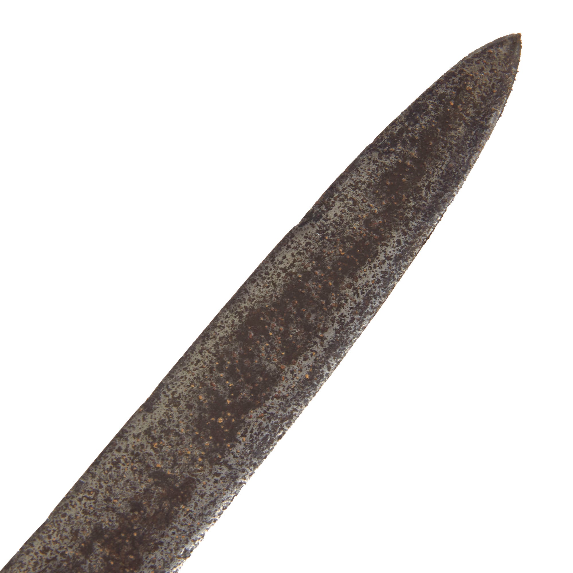 The blade shows heavy oxidation from over the years, with heavy darkening across. The etching is now very faint, but the maker’s marks can still be made out.