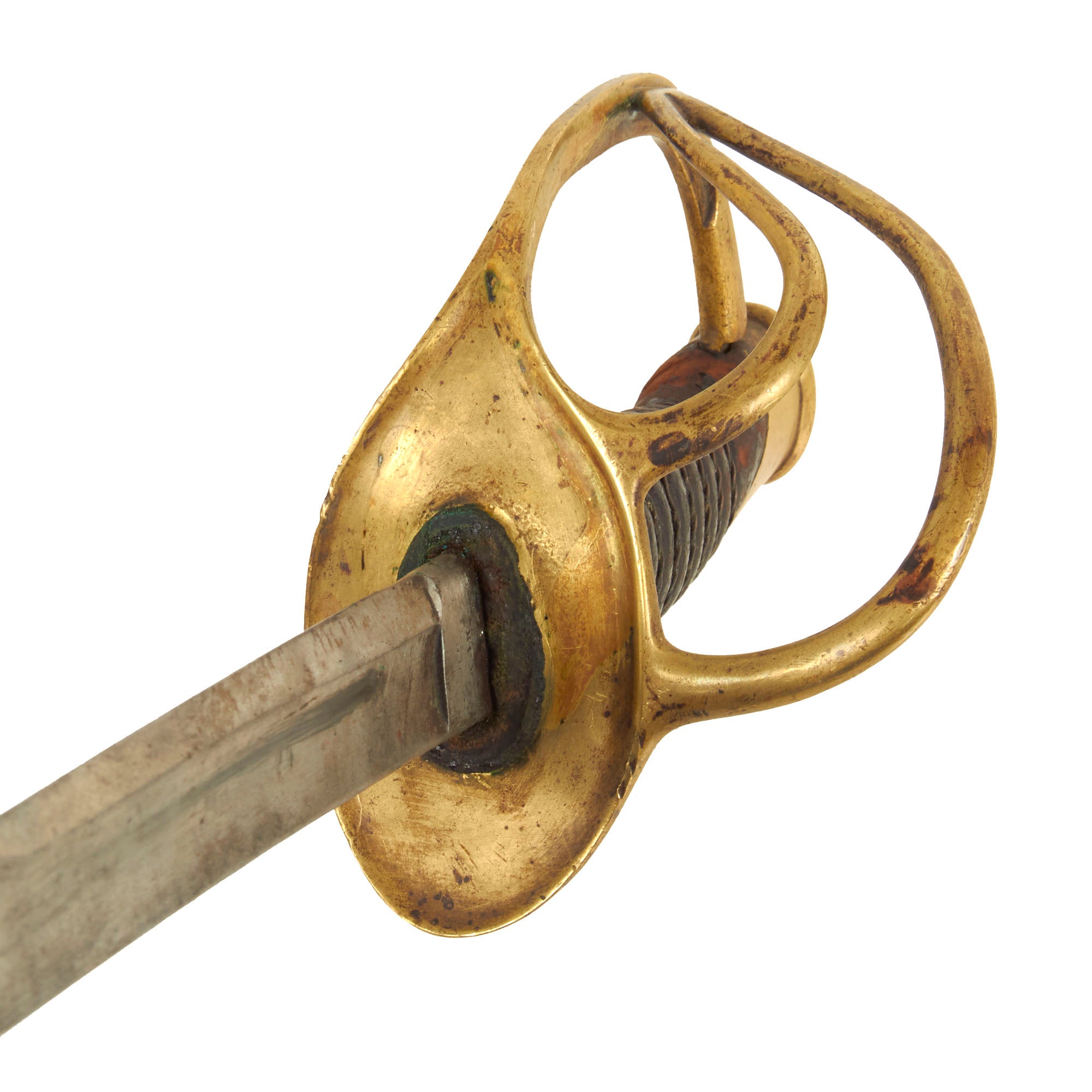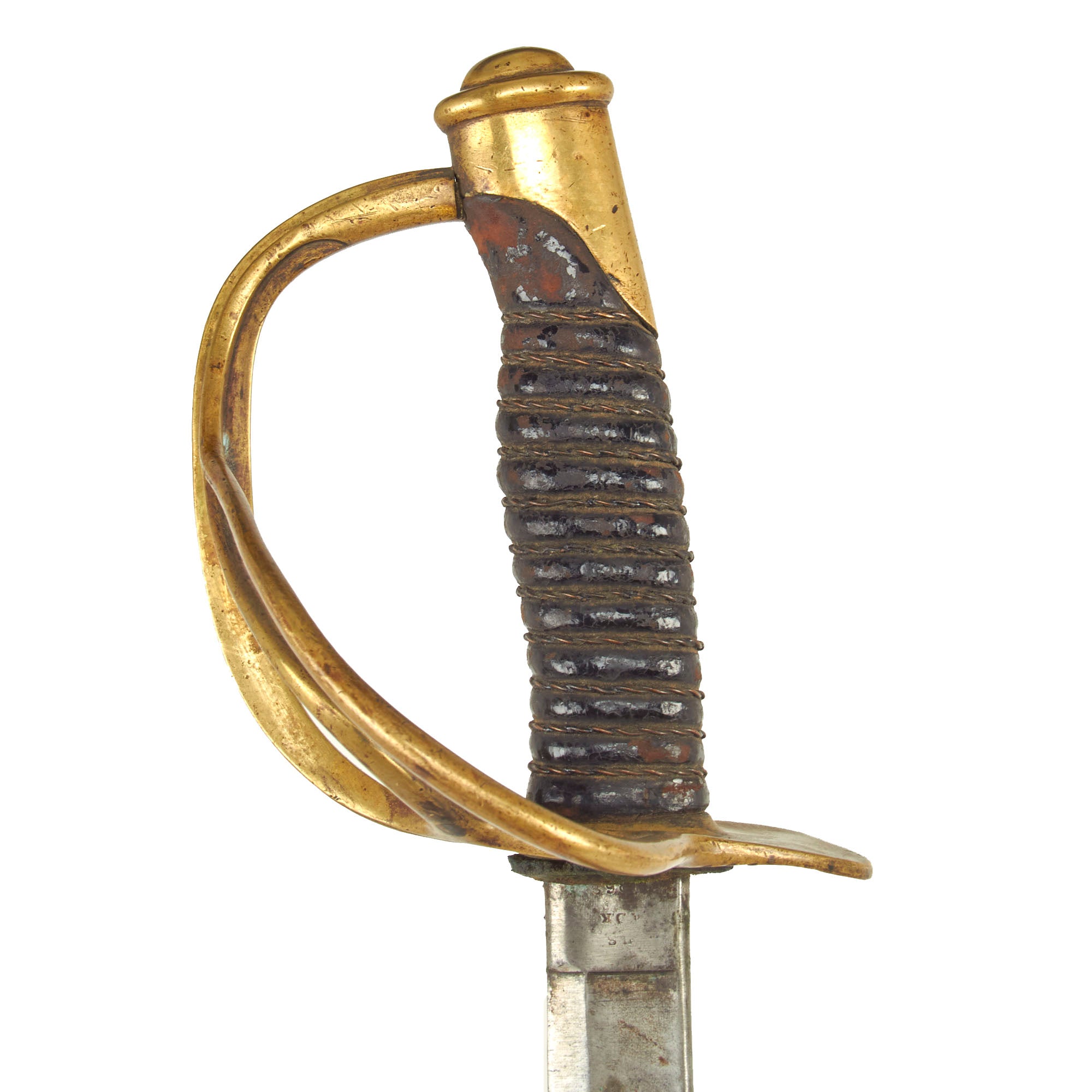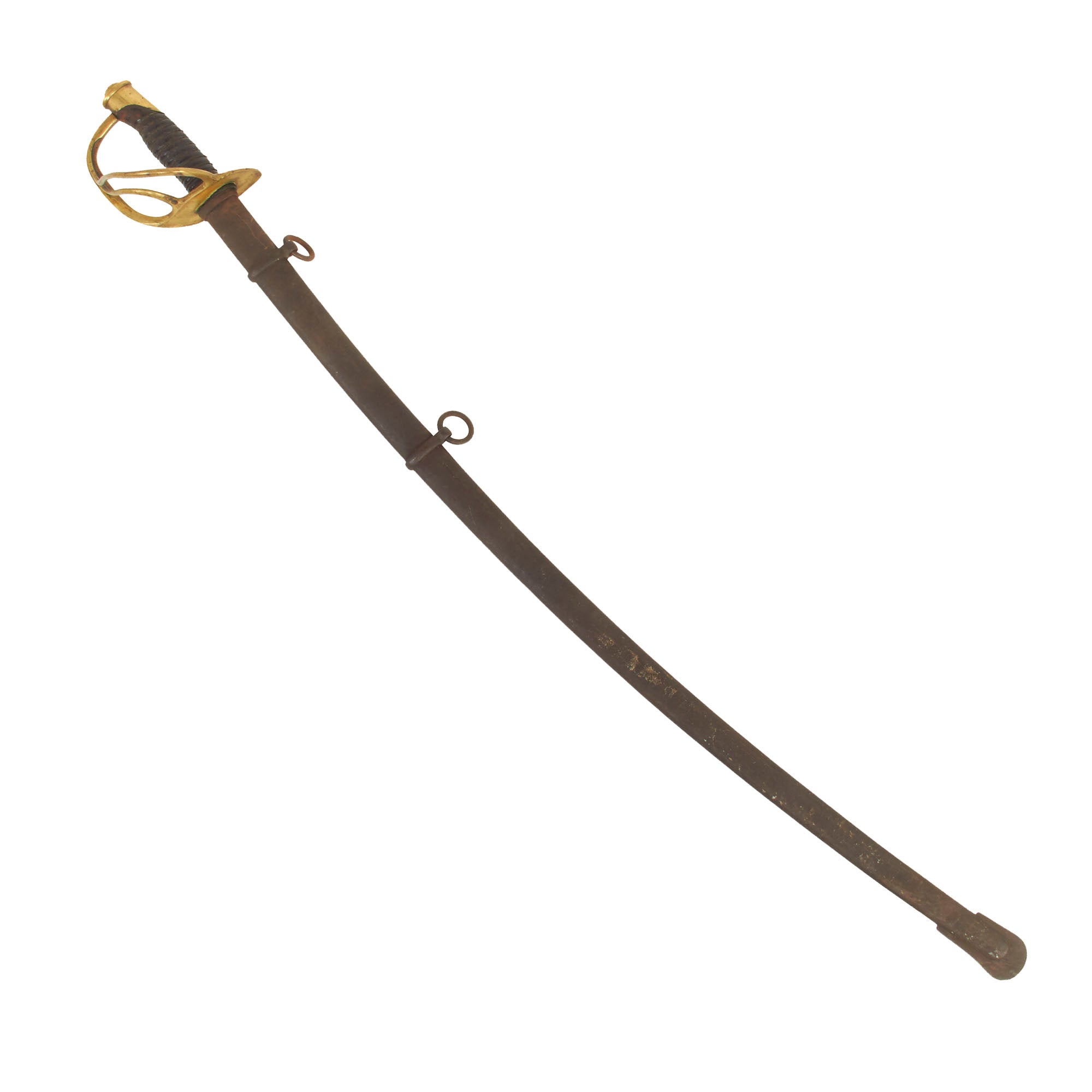 Original Item: Only One Available. This is a fantastic example of the principal cavalry saber used in the U.S. Civil War of 1860-1865. It features all brass mounts, a wood with leather wrapped sword grip and fully intact bound brass wire wrap, and a nice steel scabbard. The leather of the grip is solid and intact, but it does show age and discoloration. There is no wear through to the wood of the grip, and the original twisted wire brass wrapping is still in great shape.
