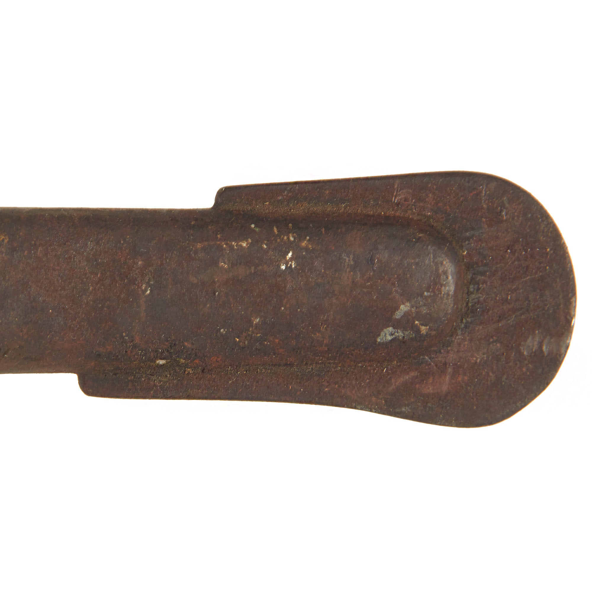 The saber comes with the original all steel-curved scabbard and complete with both mounting rings. The drag of the scabbard is not beaten up at all, with overall structural integrity excellent. There are a few small dents, and the scabbard does show signs of past oxidation, which has not been cleaned off.