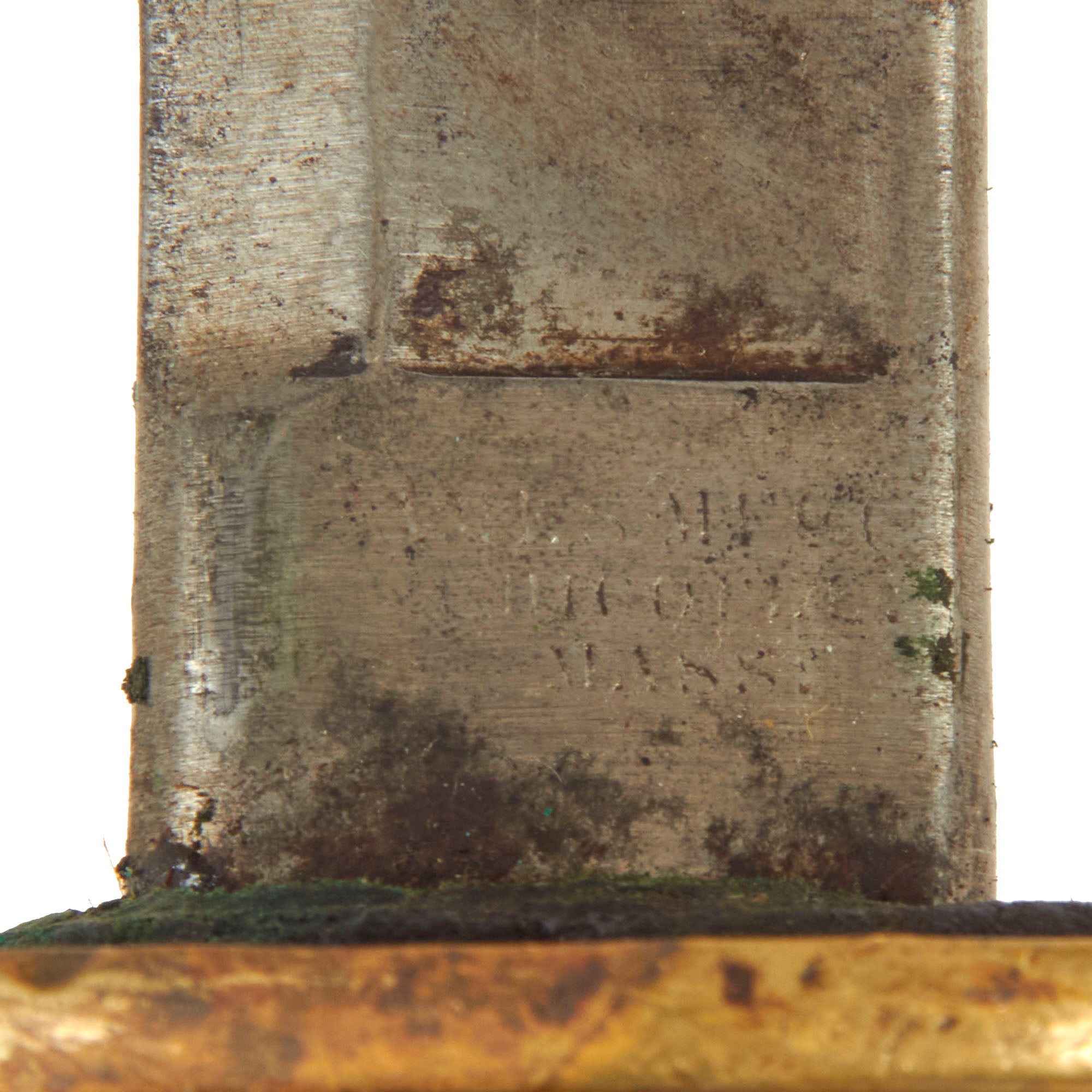 The blade looks to be in great shape, still almost fully bright, with just a few areas of light staining. It has a nice edge with only some tiny nicks / bends, and looks to have never been fully sharpened at arsenal. Polishing marks are still present throughout the blade.
