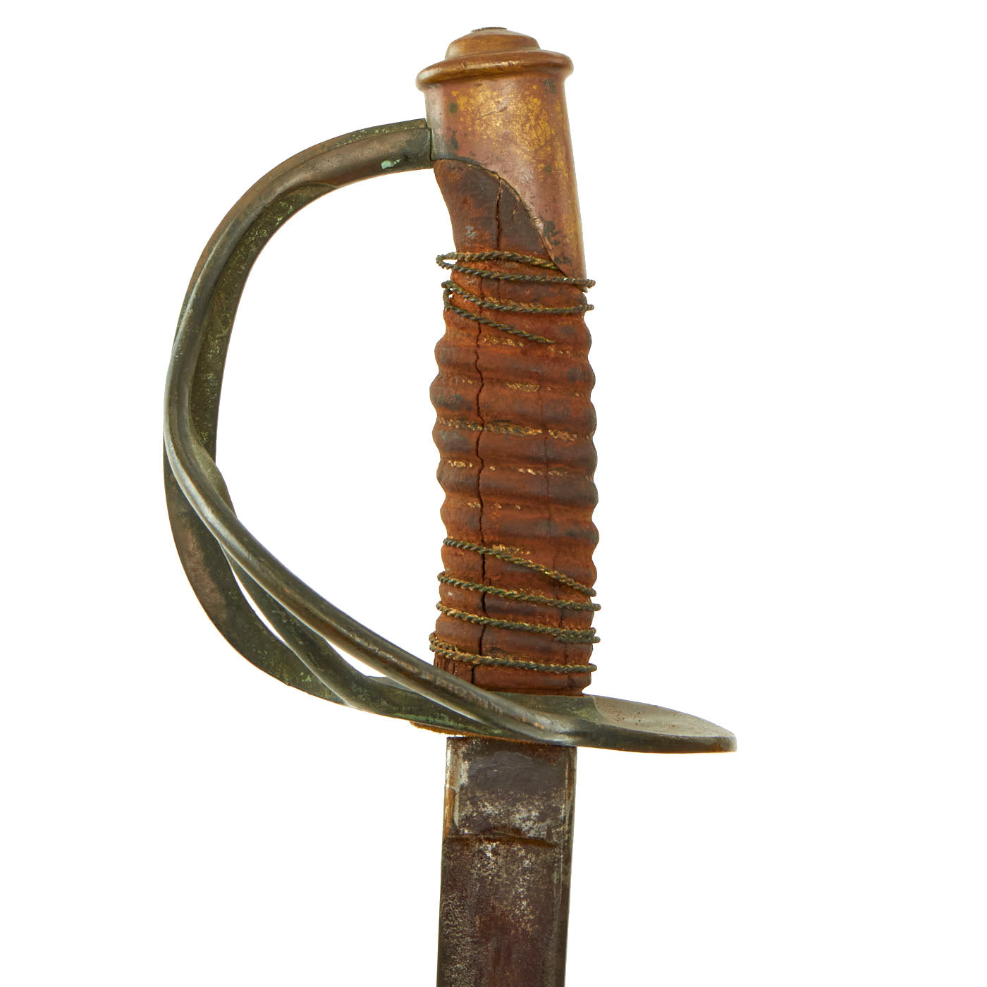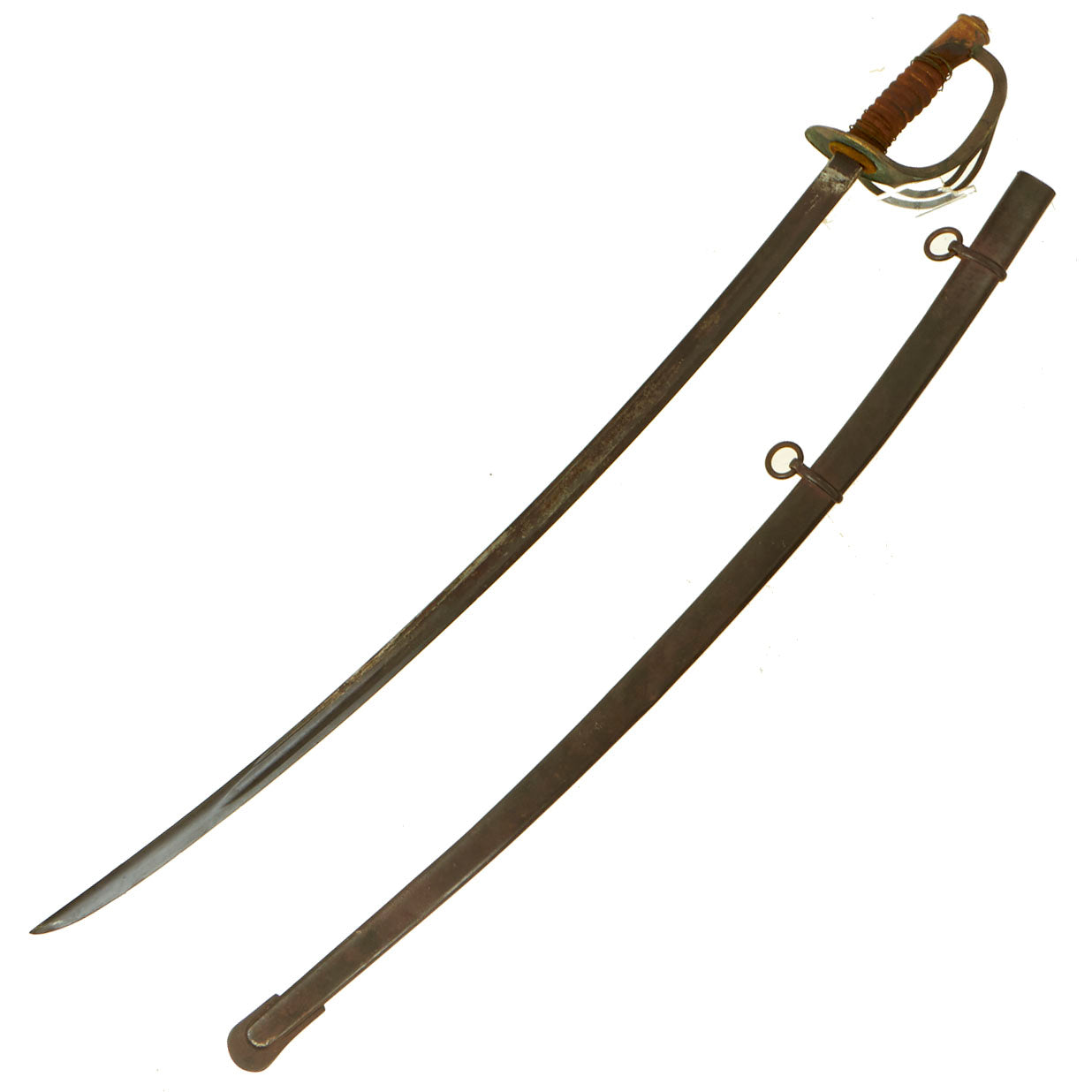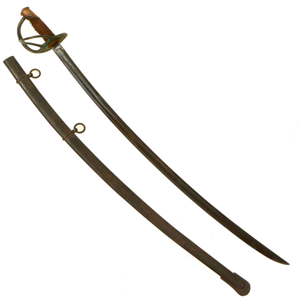 Original Item: One Only. This is a genuine imported Union cavalry trooper's curved M-1860 saber. It is in very good condition with expected wear from age and storage. The markings at the base of the blade are fairly clear, and the brass hilt is in great shape, with a lovely patina. The leather grip binding is missing with remnants of the brass wire wrap, with a bit of wear. The saber comes complete with the correct matched all steel scabbard, which is also in nice shape.