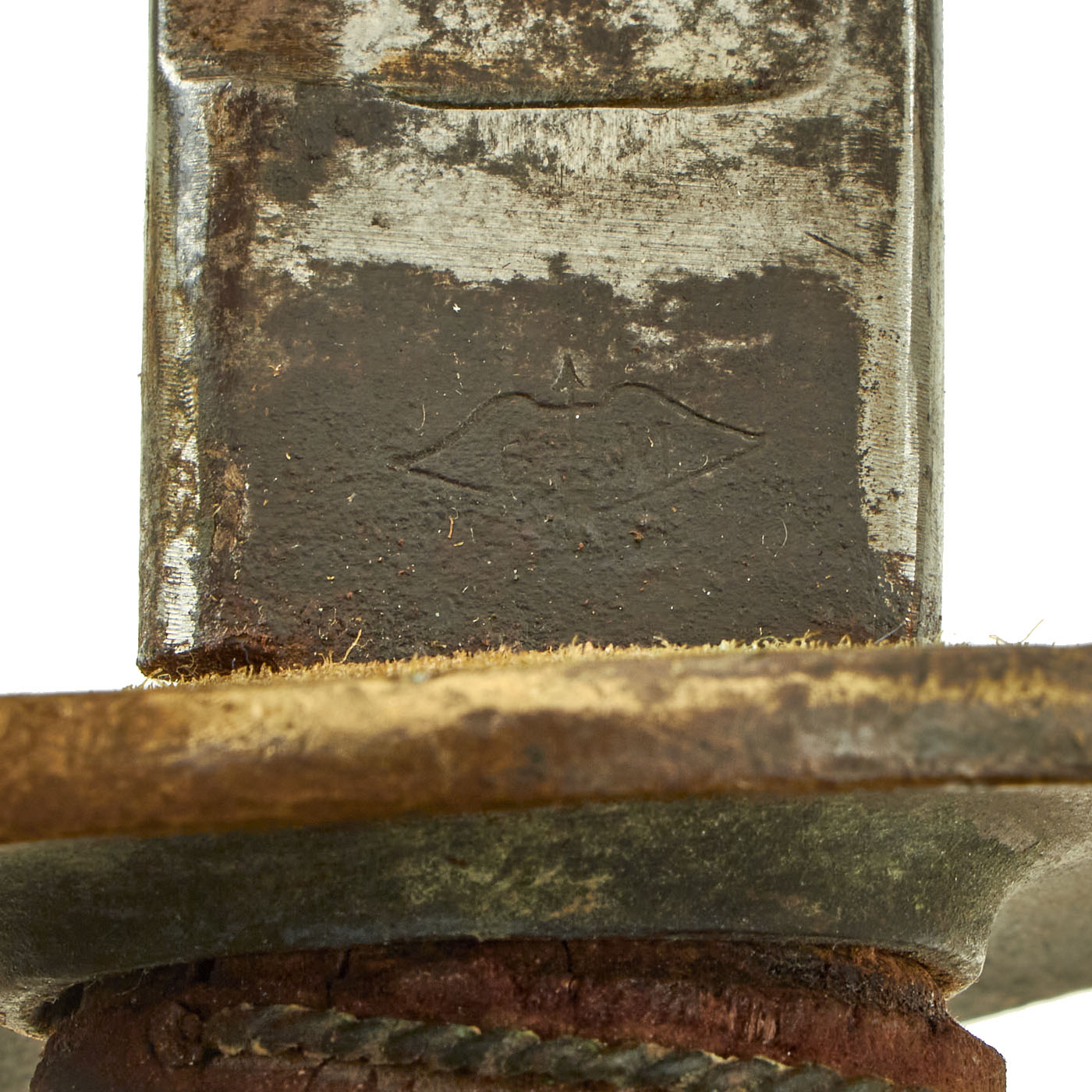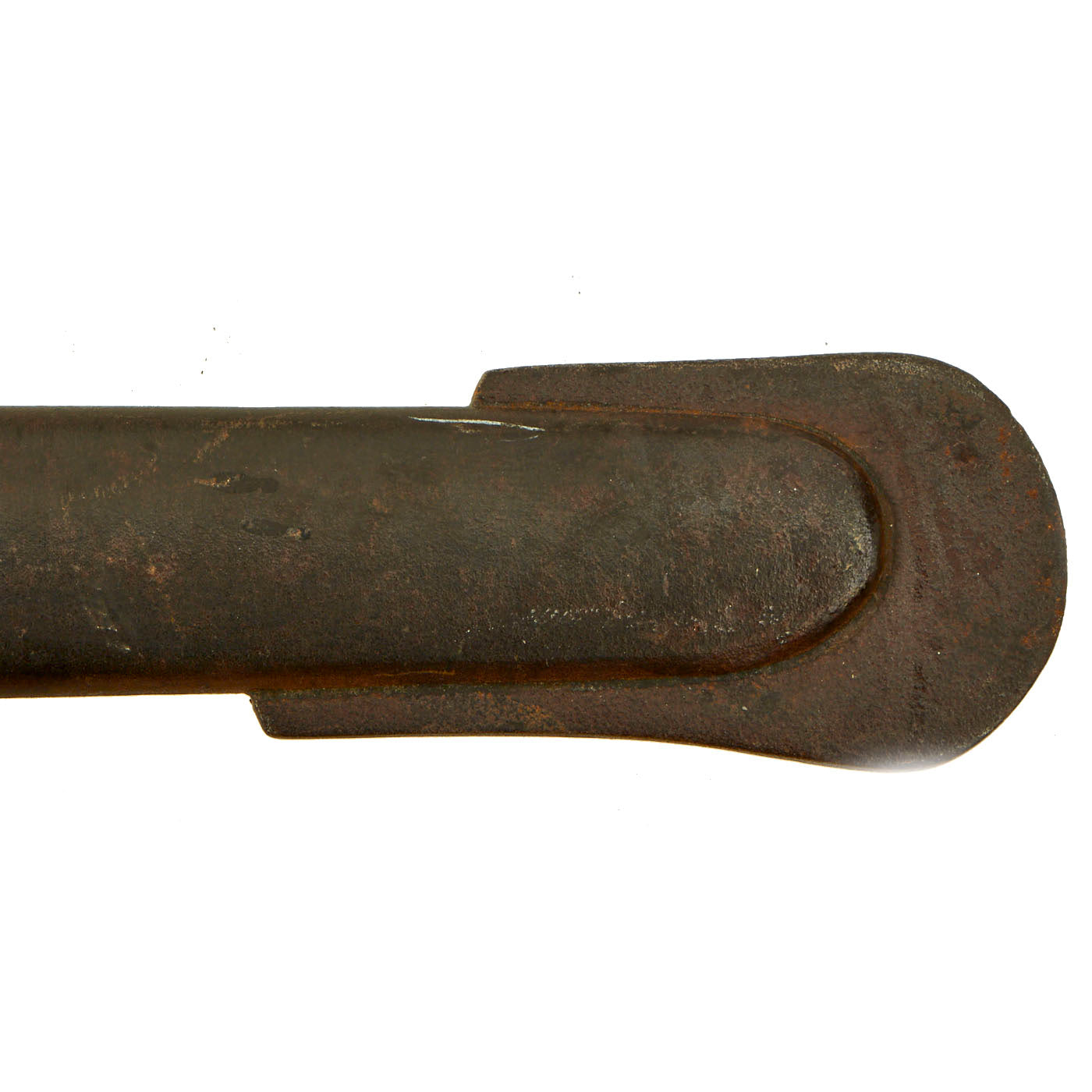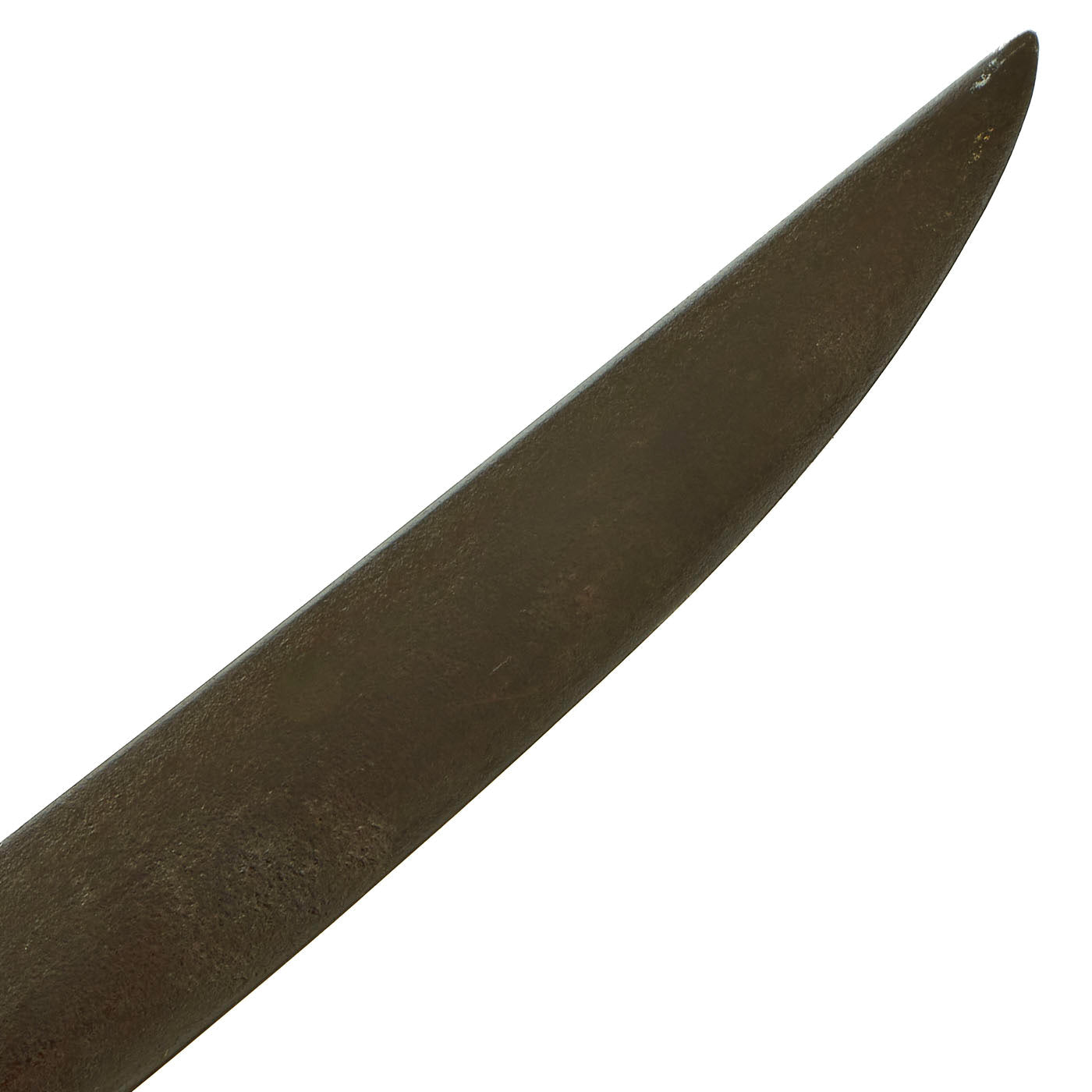 Condition overall is quite nice, with the expected wear of age. The blade is very nice, with only a bit of staining, and no pitting.. There is not any major damage to the edge of the blade. The Scabbard is quite nice, with no real denting that we can see, and a great oxidized steel patina.