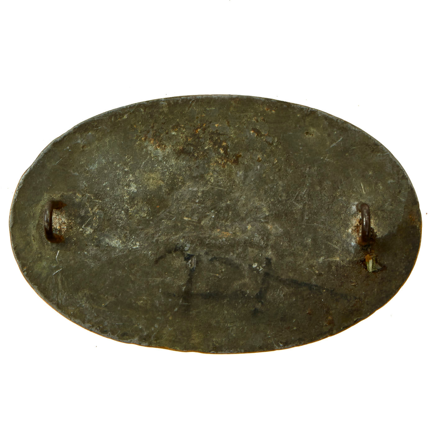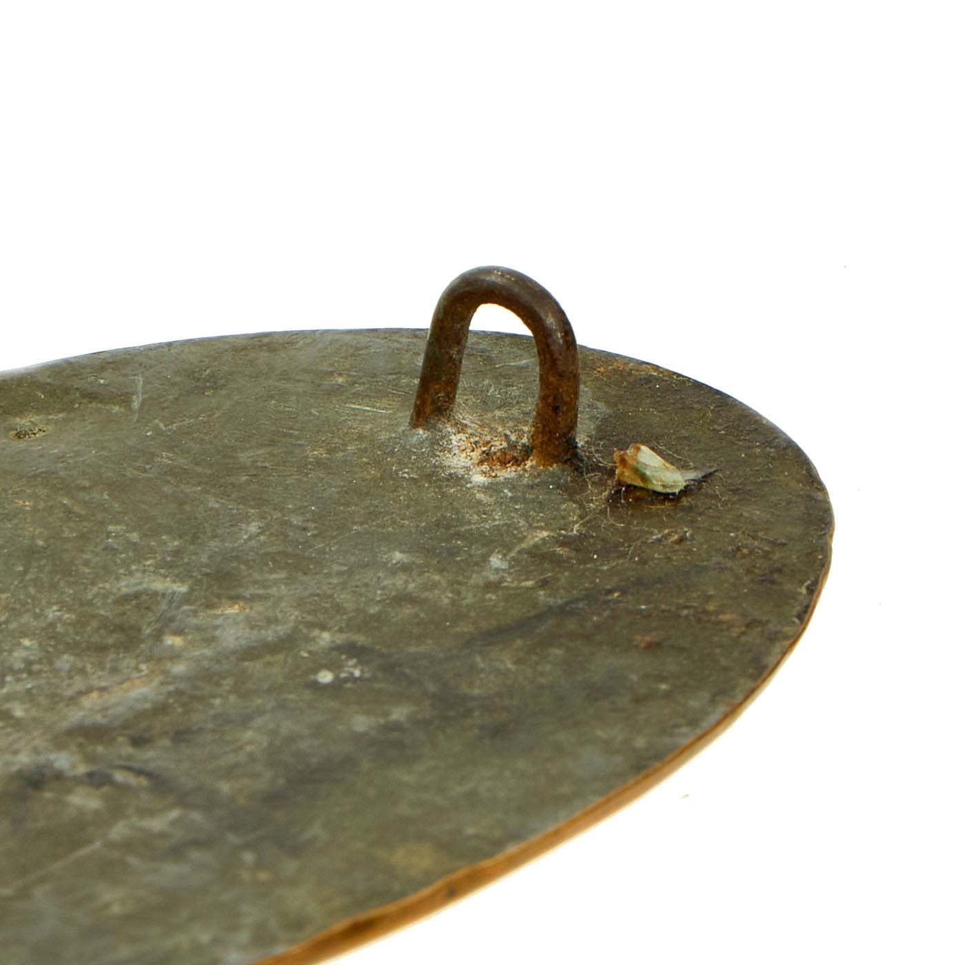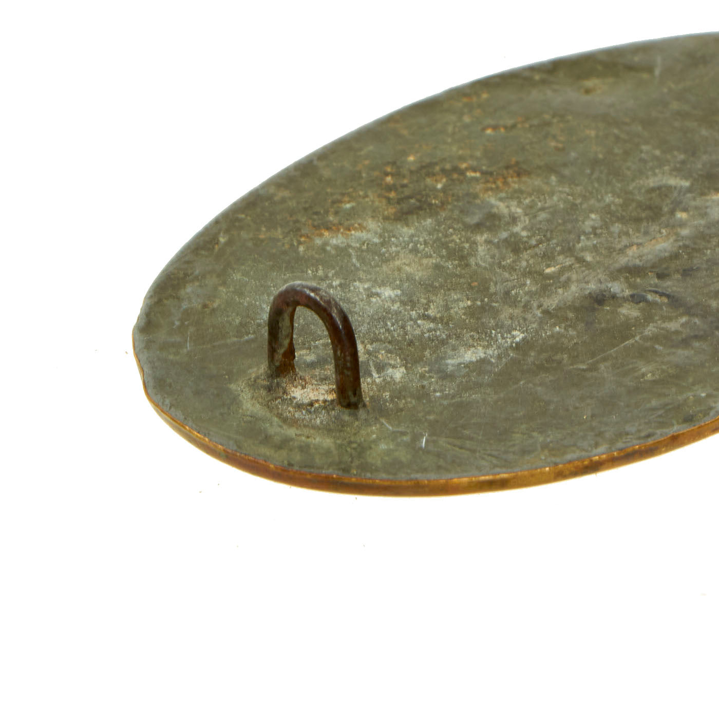 The front plate is the standard brass with tin plating on the back, with two loops on the end for attachment. Normally it would be held onto the front of a cartridge box with a small leather strap. It has some slight denting on one side, but overall looks incredible for the age.
