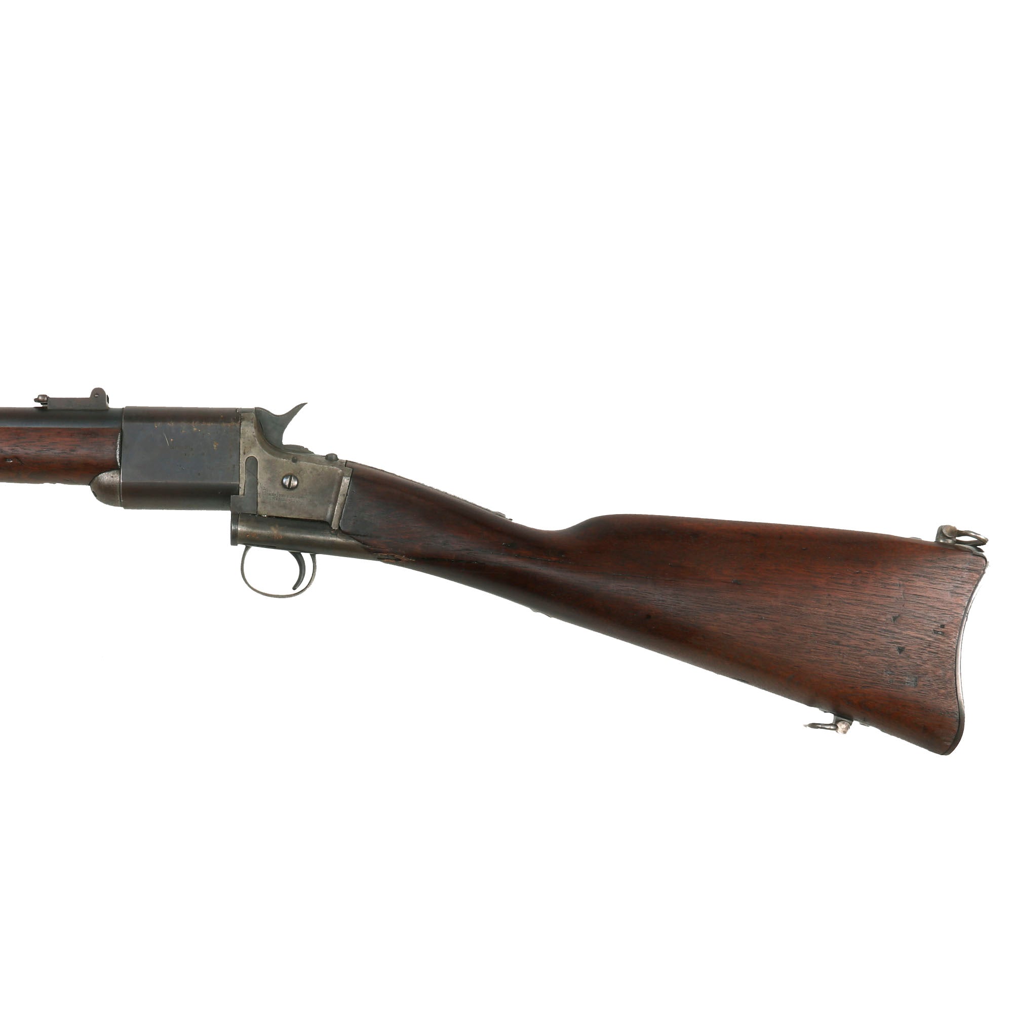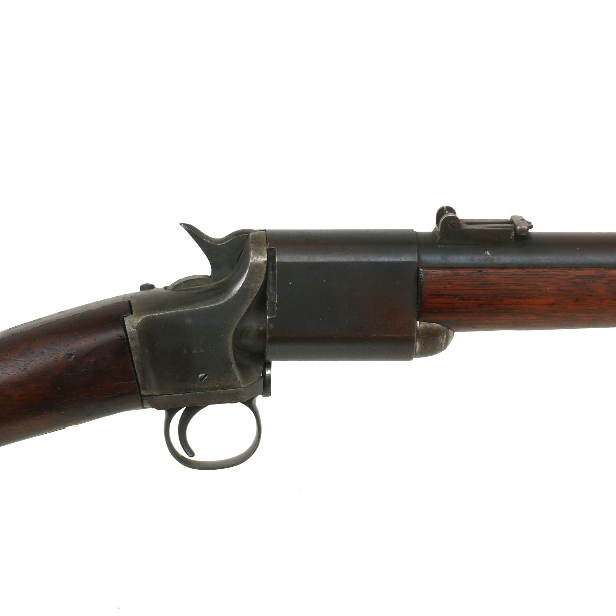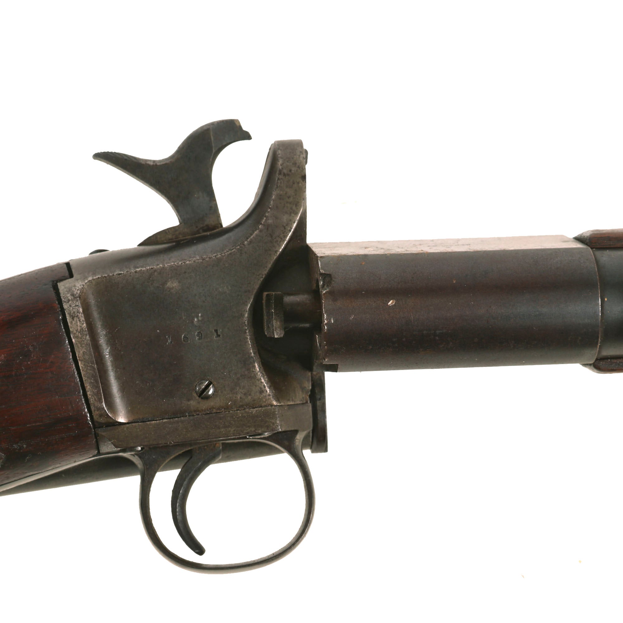 The condition of this example is fair, with the metalwork showing much of the original blued finish on the barrel and swivel hinge area. There is still a fair amount of the original case hardening visible on the rear receiver, especially the left side, and all of the original markings are all still present. Early breech loading firearms were notorious for having a poor gas seal, which resulted in powder fouling around the breech, and there is a moderate amount on this example from service use. The bore is great for its age, with well-defined lands and grooves, although the finish is fairly worn. There is a small amount of oxidation speckling inside the bore, so this example appears to have been service-used. The exterior end of the barrel shows some oxidation speckling and dents, but this is likely from storage wear.