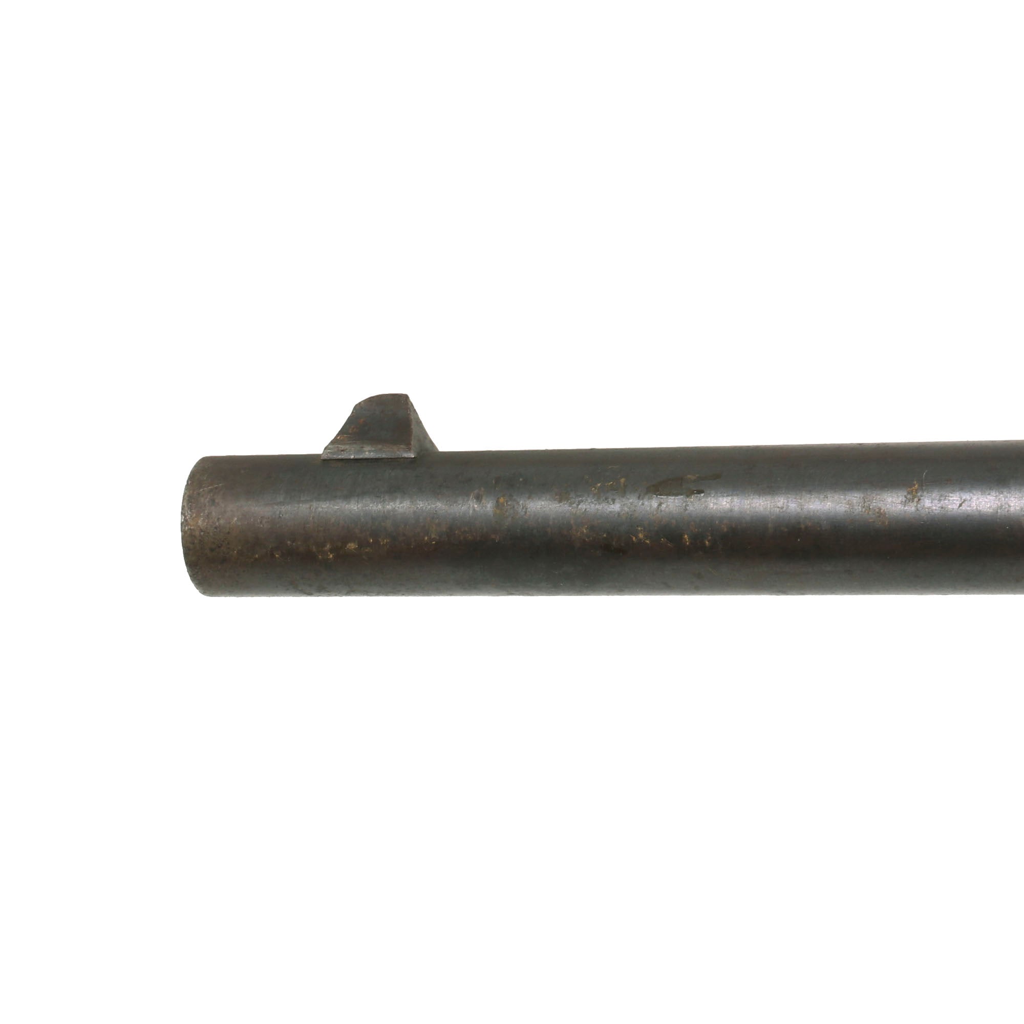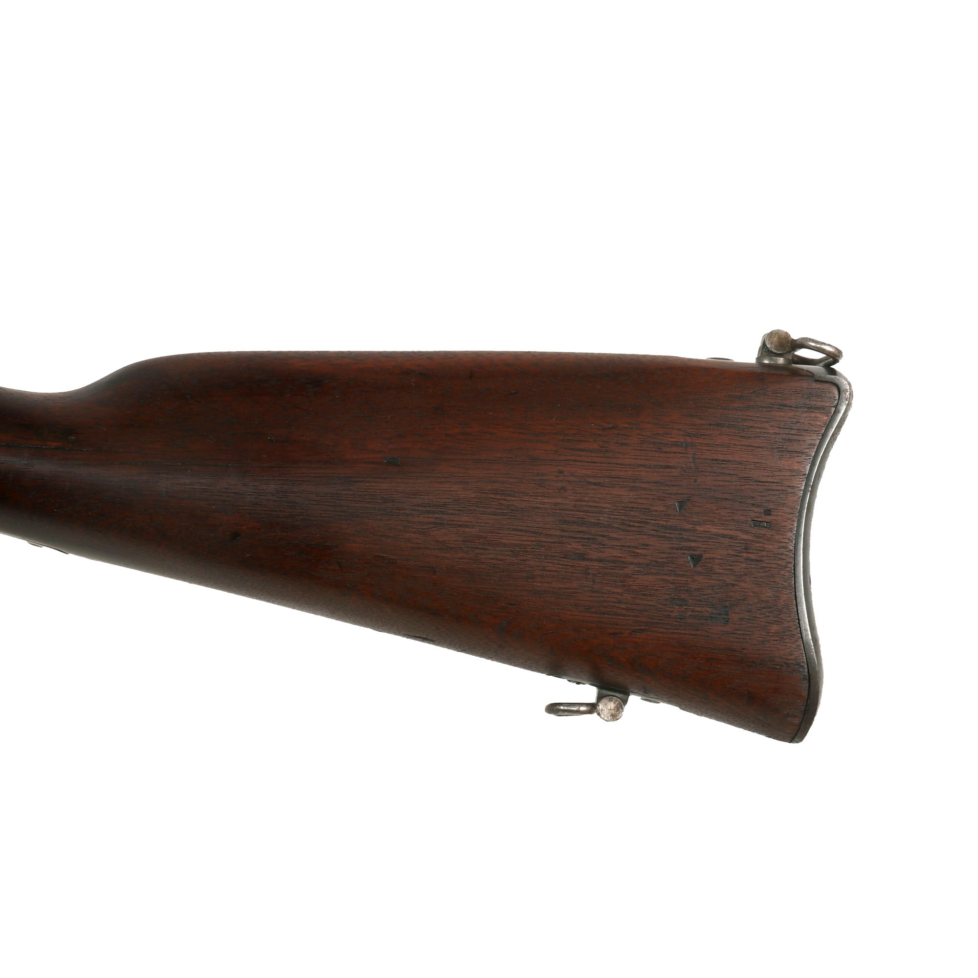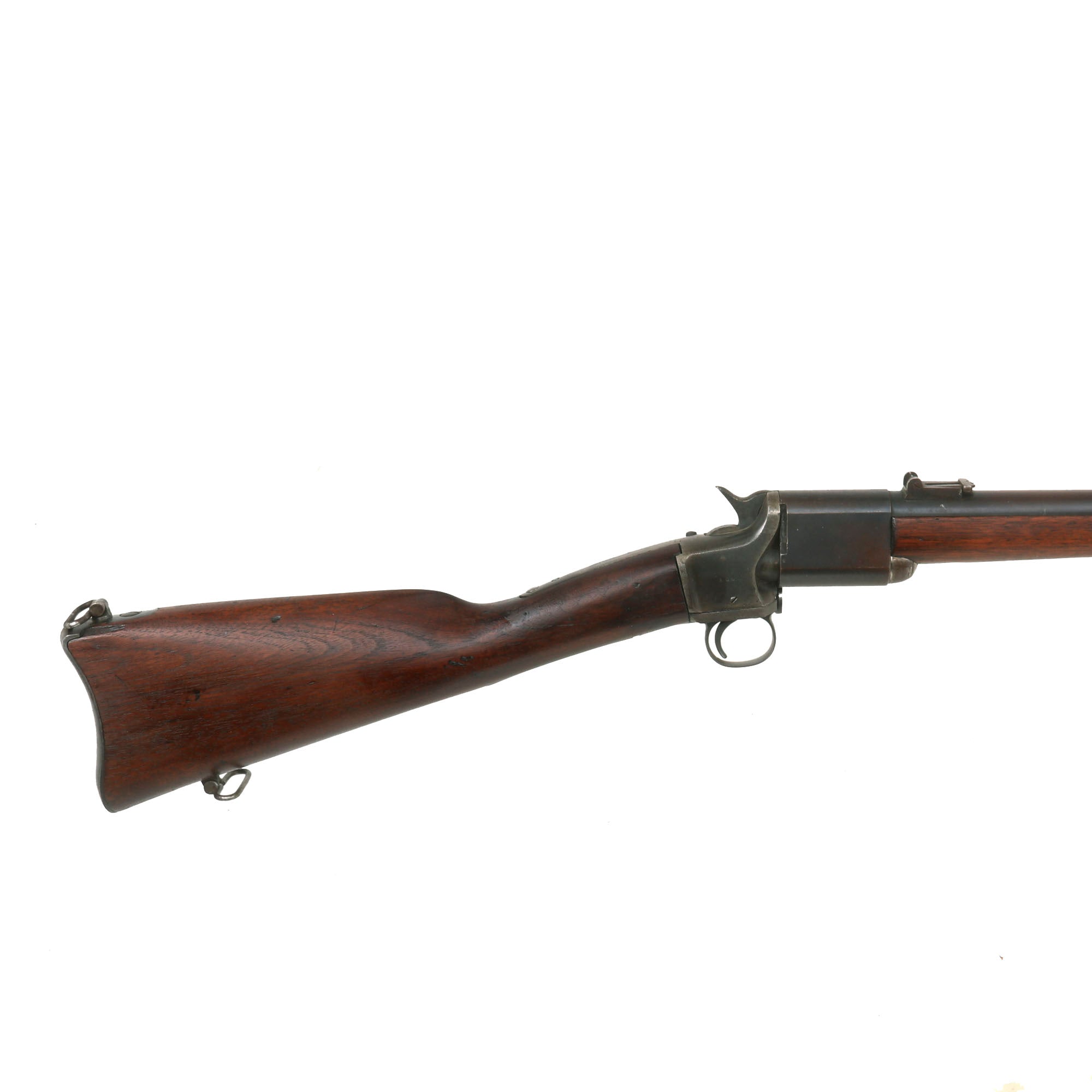 The condition of this example is fair, with the metalwork showing much of the original blued finish on the barrel and swivel hinge area. There is still a fair amount of the original case hardening visible on the rear receiver, especially the left side, and all of the original markings are all still present. Early breech loading firearms were notorious for having a poor gas seal, which resulted in powder fouling around the breech, and there is a moderate amount on this example from service use. The bore is great for its age, with well-defined lands and grooves, although the finish is fairly worn. There is a small amount of oxidation speckling inside the bore, so this example appears to have been service-used. The exterior end of the barrel shows some oxidation speckling and dents, but this is likely from storage wear.