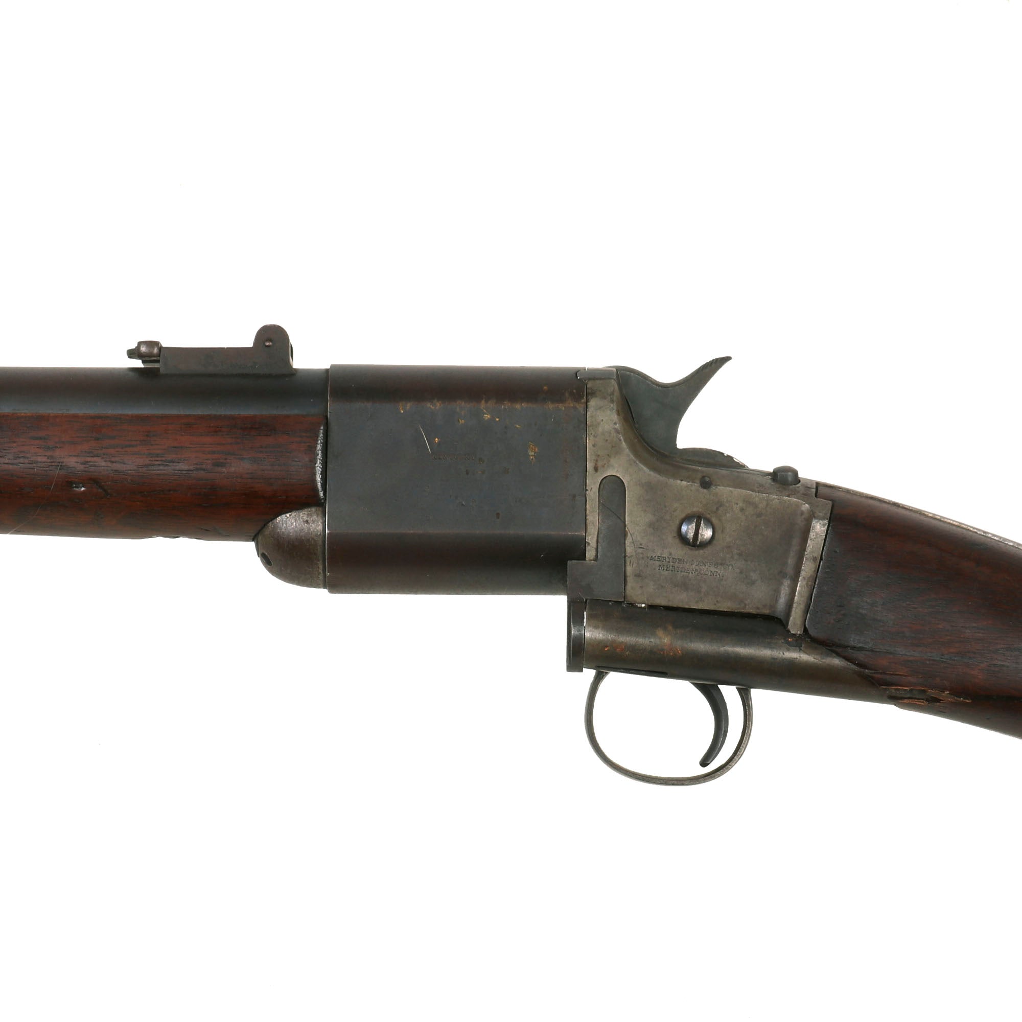 Original Item: Only One Available. Developed by LOUIS TRIPLETT and WILLIAM SCOTT of Columbia, Kentucky and manufactured under contract by the Meriden Manufacturing Company of Meriden, Ct. This is a Repeating Carbine enclosing a 7 Shot tubular magazine inside the wood butt. It is loaded from the front once the swivel breech of the action is fully opened. These were all chambered for the .56-50 Spencer cartridge, referred to as .50 caliber. The serial number is marked on right rear of the action, and on this example is 1691, out of a total production of about 5000.