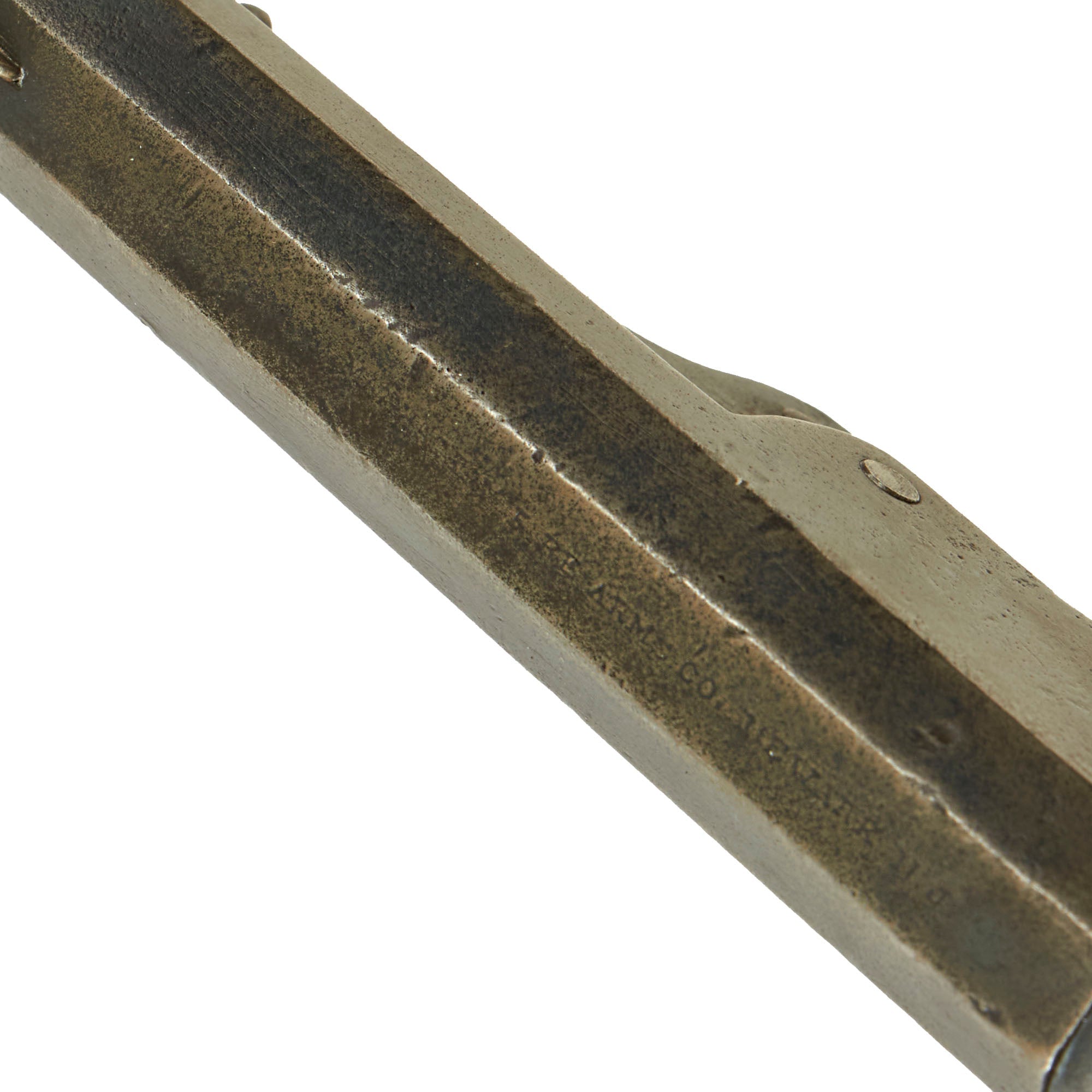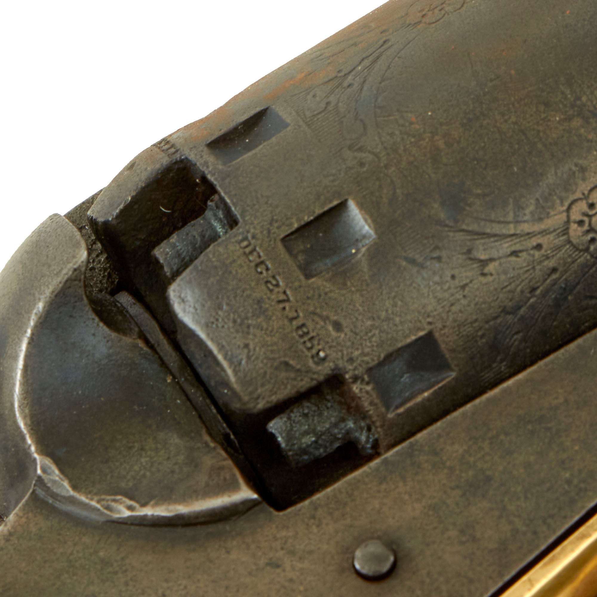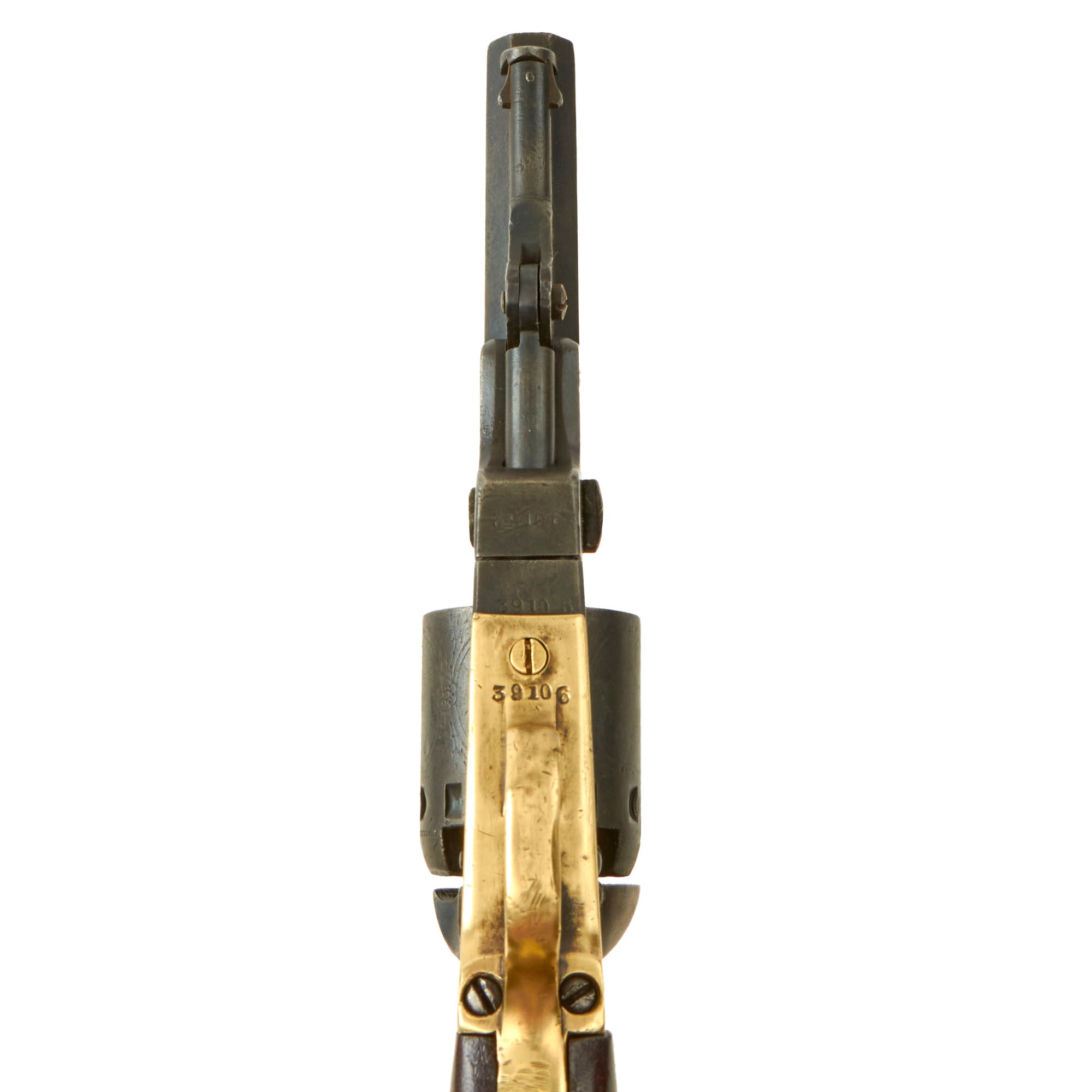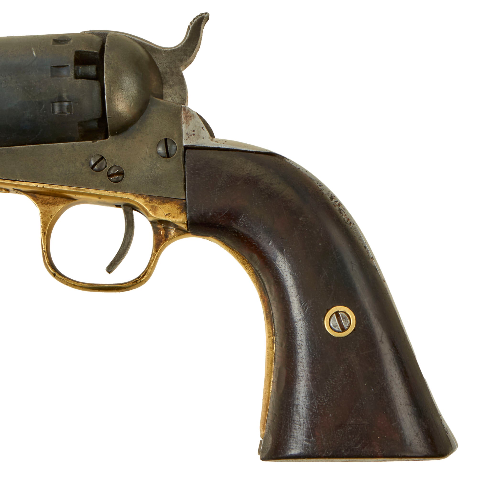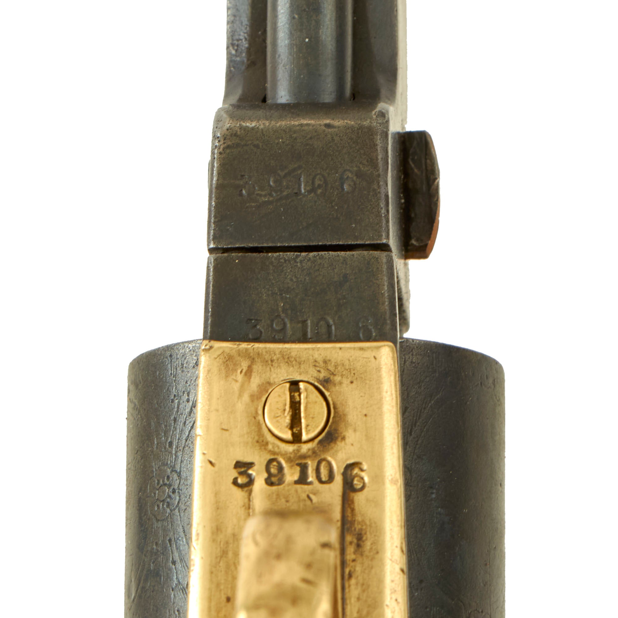 This lovely patinated example features a short 4" barrel and mostly matching serial number 39106, which is found on the barrel, frame, trigger guard, cylinder arbor pin, and the bottom of the grip. The rear of the cylinder is worn, so we cannot see any of the numbers, and the barrel wedge is an unmarked arsenal replacement. We also noted that the grip frame has a faded serial number which is definitely not matching, and that it is made of iron or steel, not the correct brass. It looks like the revolver was modified to take a different larger rear grip from a Colt Single Action Army or something similar. We do not know if this was because the original grip was broken, or simply too small. Definitely an interesting period modification!