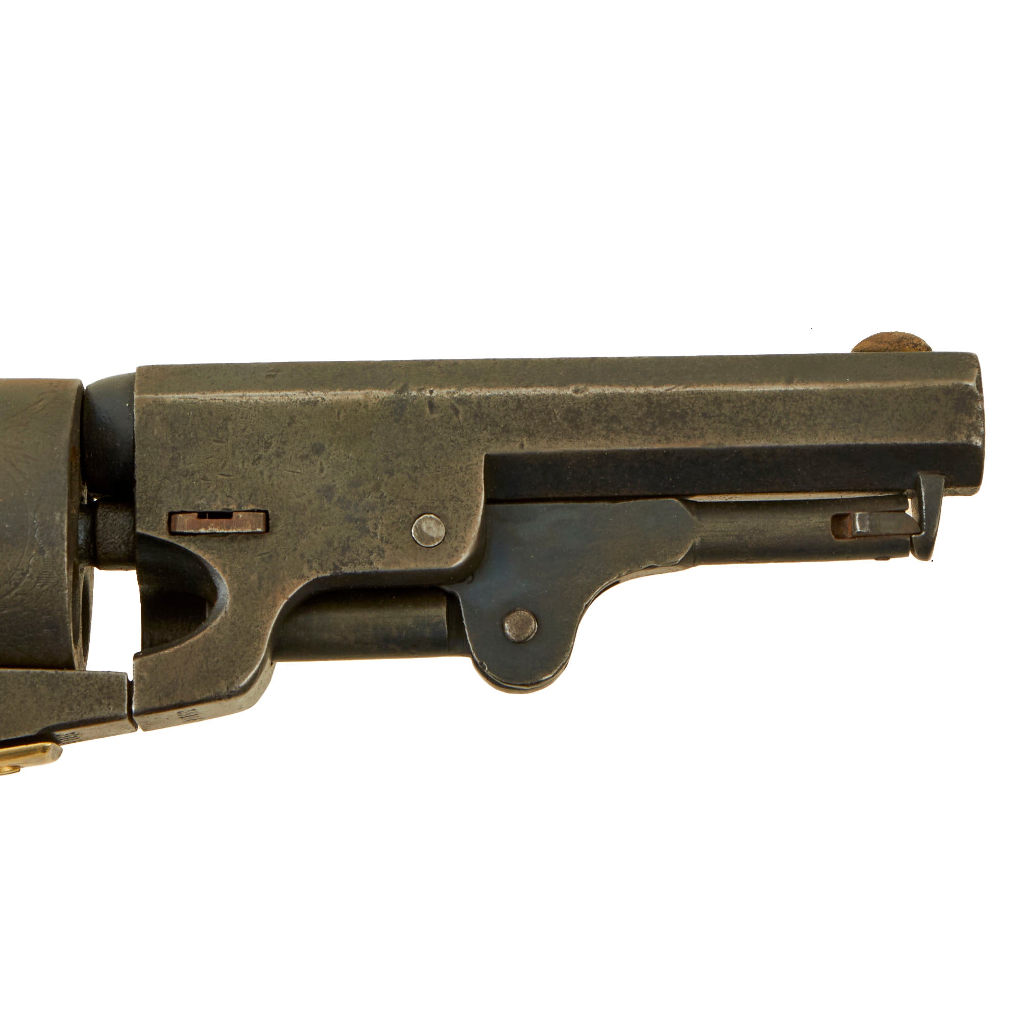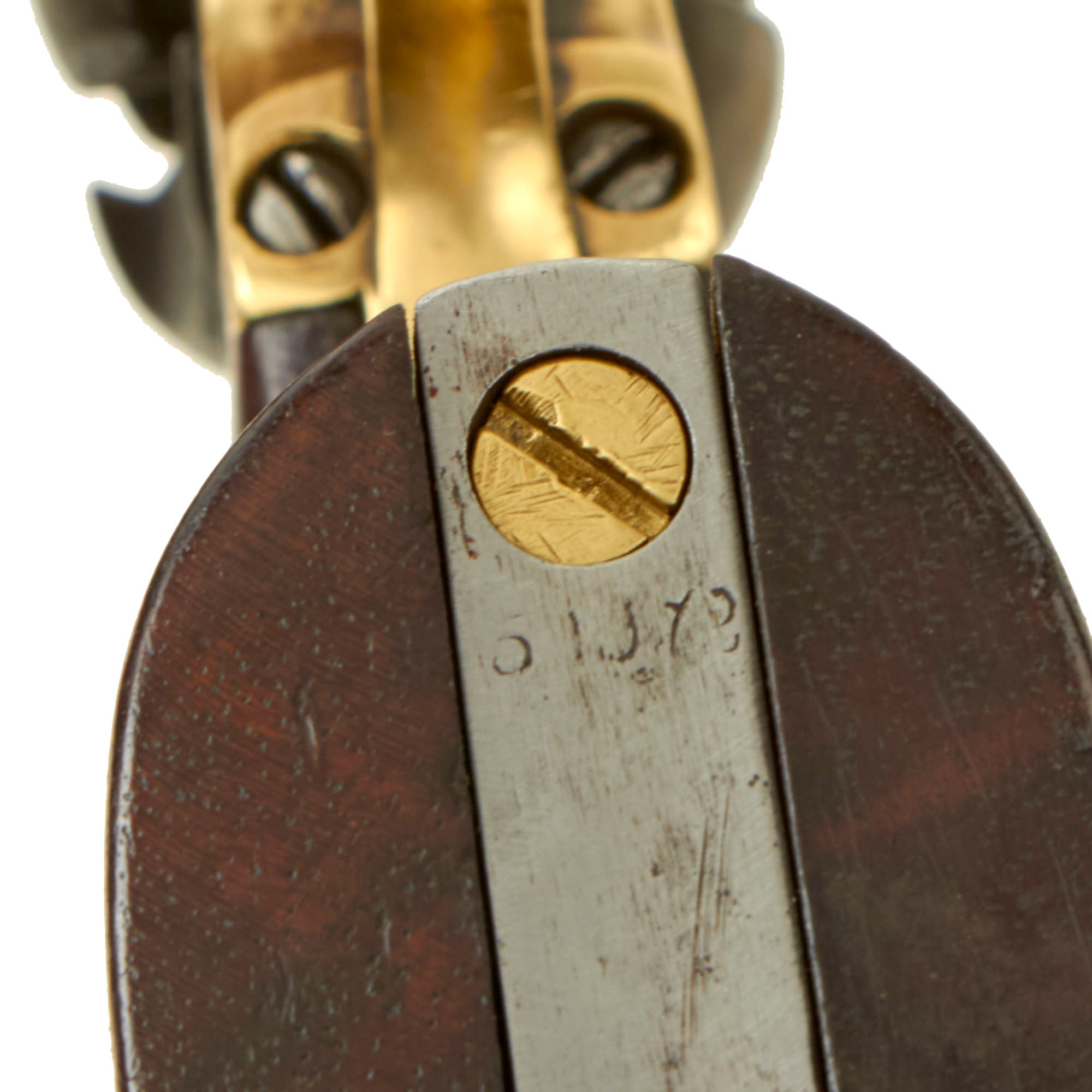 The revolver has a lovely patina of age and is in fully functional condition. It indexes well with a strong cylinder lockup and crisp dry fire. We did not notice any of the usual finicky behavior we often see with early revolvers. The Walnut grips are solid, with a lovely color, and have some great grain patterns. The metal finish has been worn to a lovely oxidized dark gray patina from years of use and cleaning. The trigger guard is worn a bit, which has removed all of the original nickel plating from the brass, which is typical, even for well cared for revolvers.