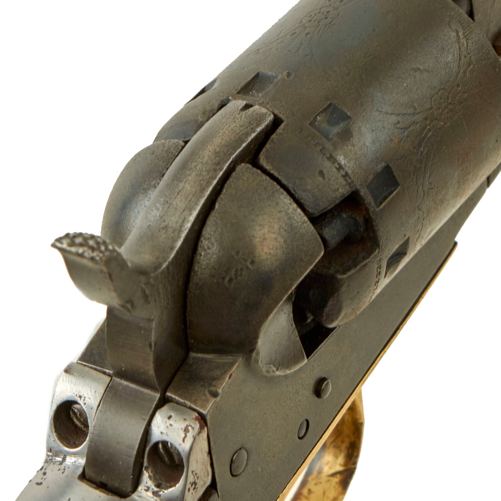 The revolver has some amount of the original cylinder engraving present, which consists of five different scenes, one for each chamber, though the design is worn and oxidized. The cap nipple cones are all clear, though worn and oxidized, and there is even the original PATENTED DEC.27.1859 marking by the rear is fully visible!